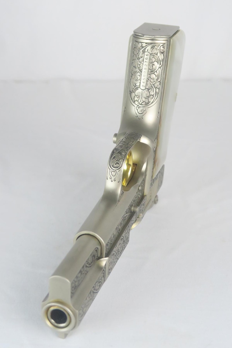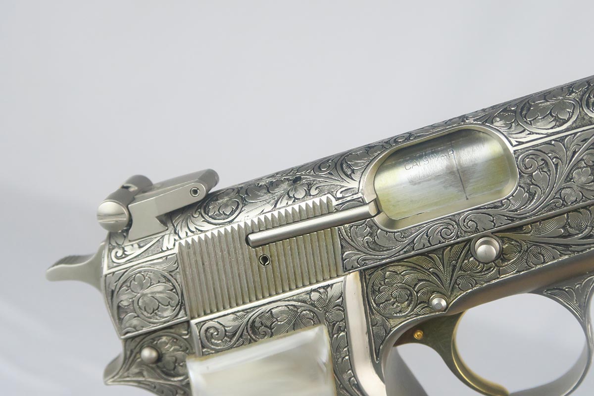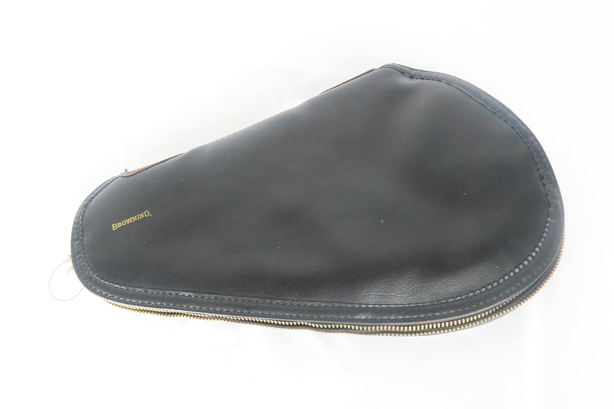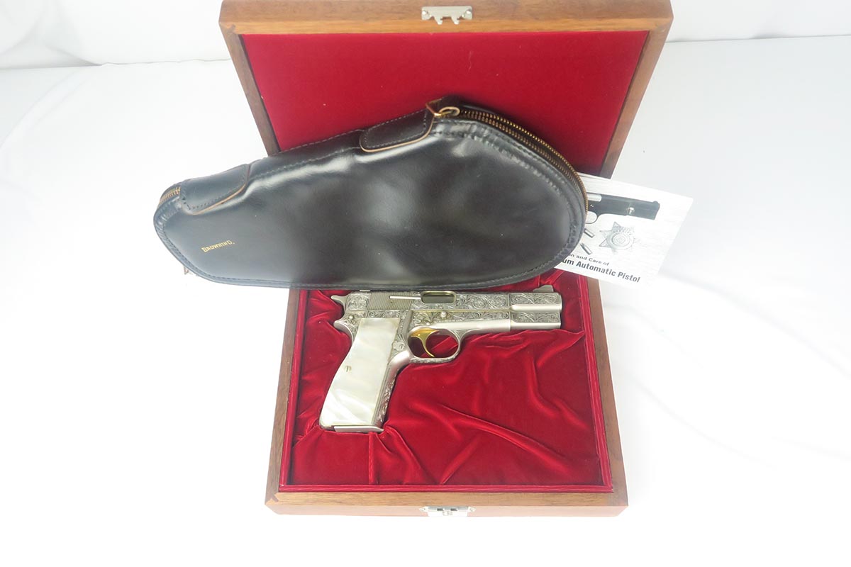 1/31/18 – This is a beautifully engraved Browning Renaissance High Power, with original leather pouch and display case.  This pistol is especially rare as it is a target model, which is extremely difficult to find amongst the Renaissance engraved pistols.  The gun is in excellent original condition, with no minor or major areas of wear to mention.  The production of these pistols was discontinued at the end of 1978, and this serial dates to that period so it is one of the last ones made.  It features mother of pearl grips and a gold plated trigger that draw a striking contrast to the factory engraving.  Simply one of the cooler pistols we’ve had come through the office recently.  It comes in an excellent display case and includes the leather pouch with Browning logo.