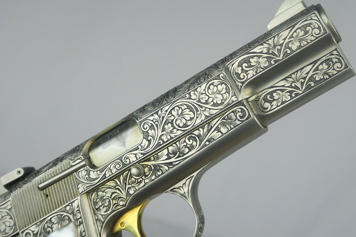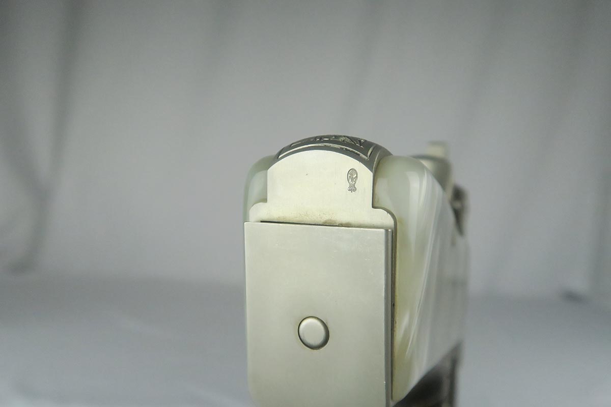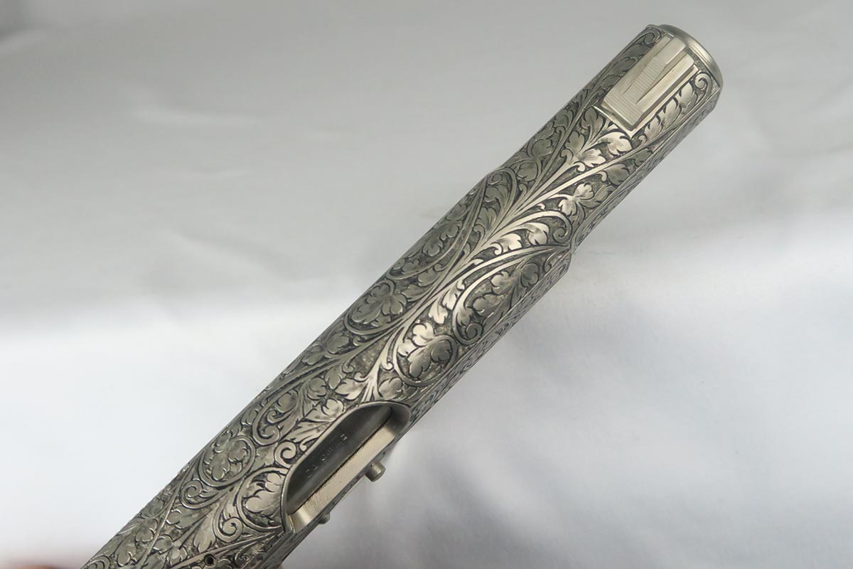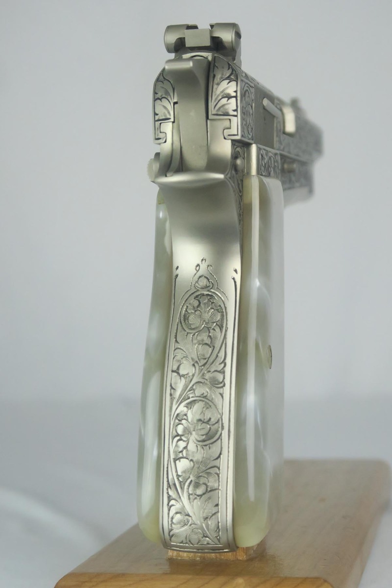 1/31/18 – This is a beautifully engraved Browning Renaissance High Power, with original leather pouch and display case.  This pistol is especially rare as it is a target model, which is extremely difficult to find amongst the Renaissance engraved pistols.  The gun is in excellent original condition, with no minor or major areas of wear to mention.  The production of these pistols was discontinued at the end of 1978, and this serial dates to that period so it is one of the last ones made.  It features mother of pearl grips and a gold plated trigger that draw a striking contrast to the factory engraving.  Simply one of the cooler pistols we’ve had come through the office recently.  It comes in an excellent display case and includes the leather pouch with Browning logo.