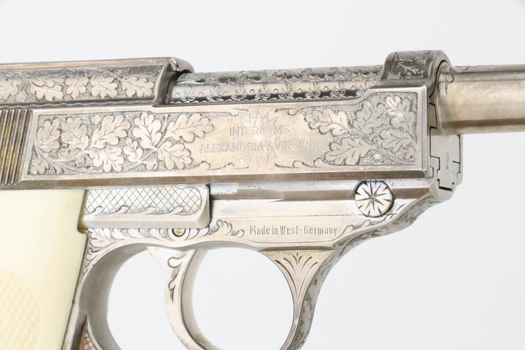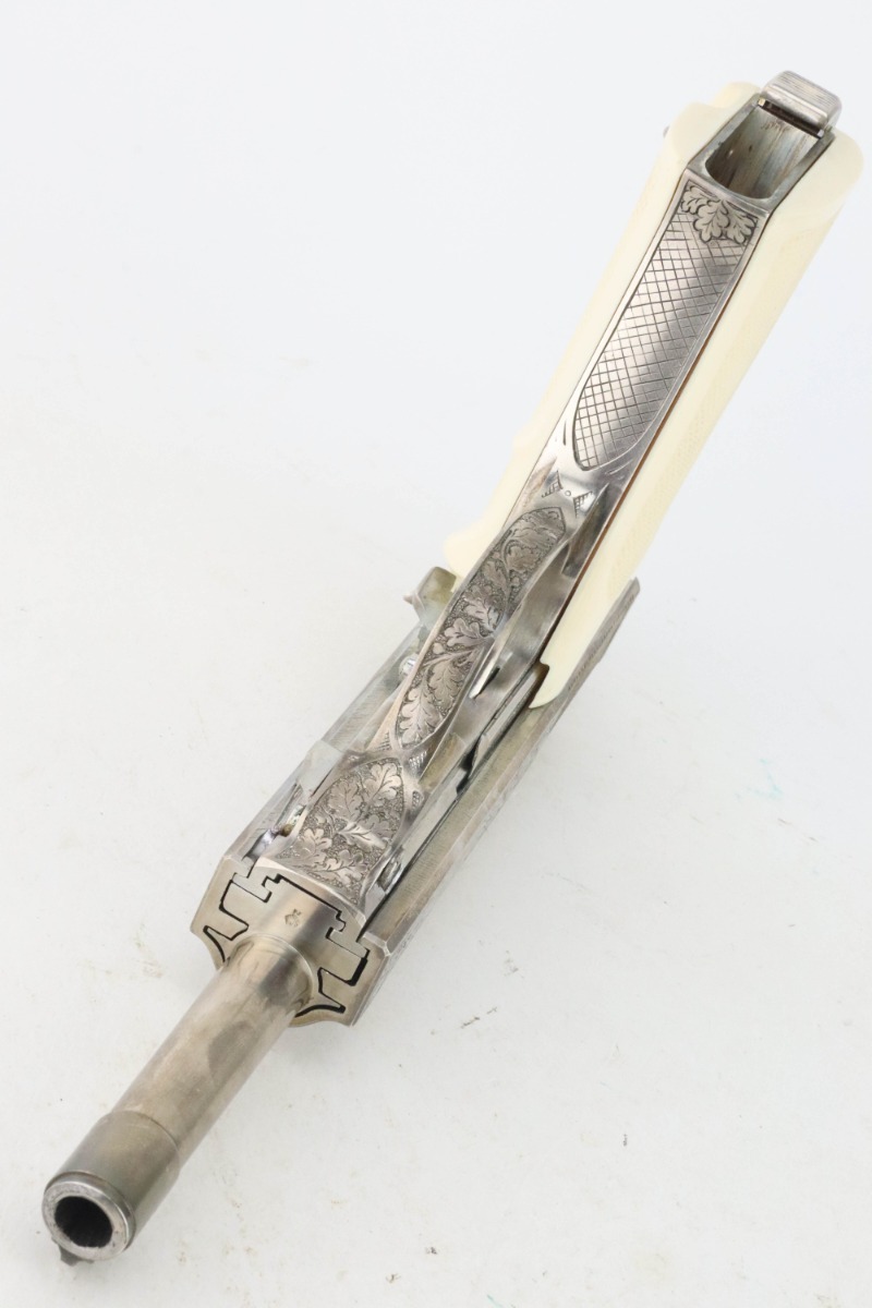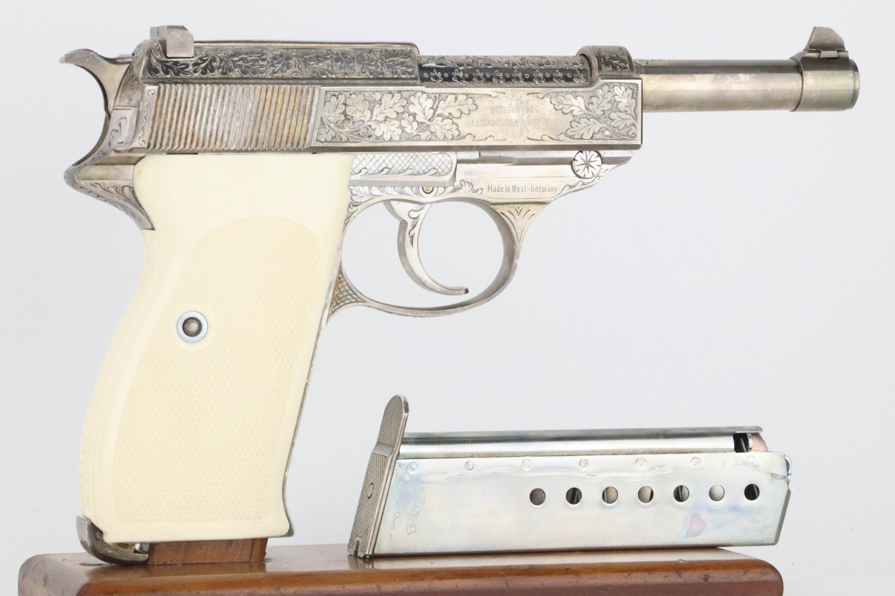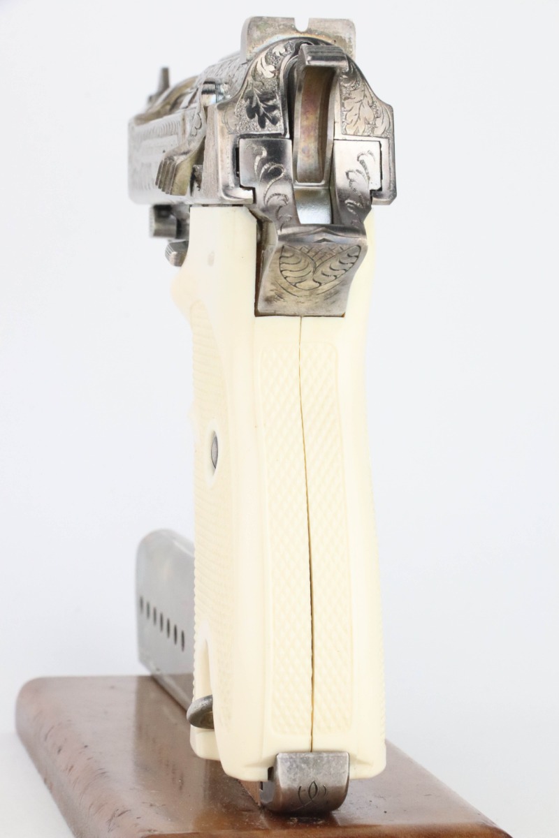 8/27/24 – This is a beautiful example of a factory-engraved, nickel-plated Walther P.38 from 1970. All matching with West German proofs and an Interarms marking on the slide. The entire gun features a beautiful, detailed Oak Leaf and Acorn engraving pattern. It has an excellent shiny nickel finish with just a few areas of very minor discoloration that almost looks like tarnish. Fitted with really nice ivory-colored plastic grips and comes with an engraved, nickel-plated magazine. Minty bore. De-cocker is functional.