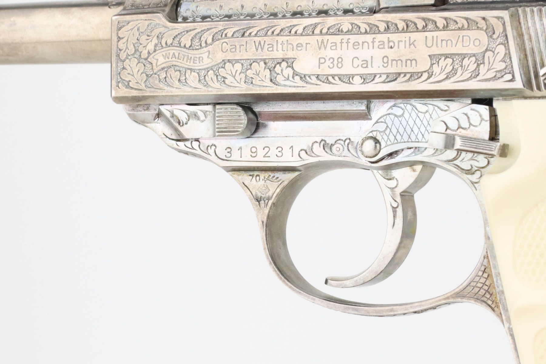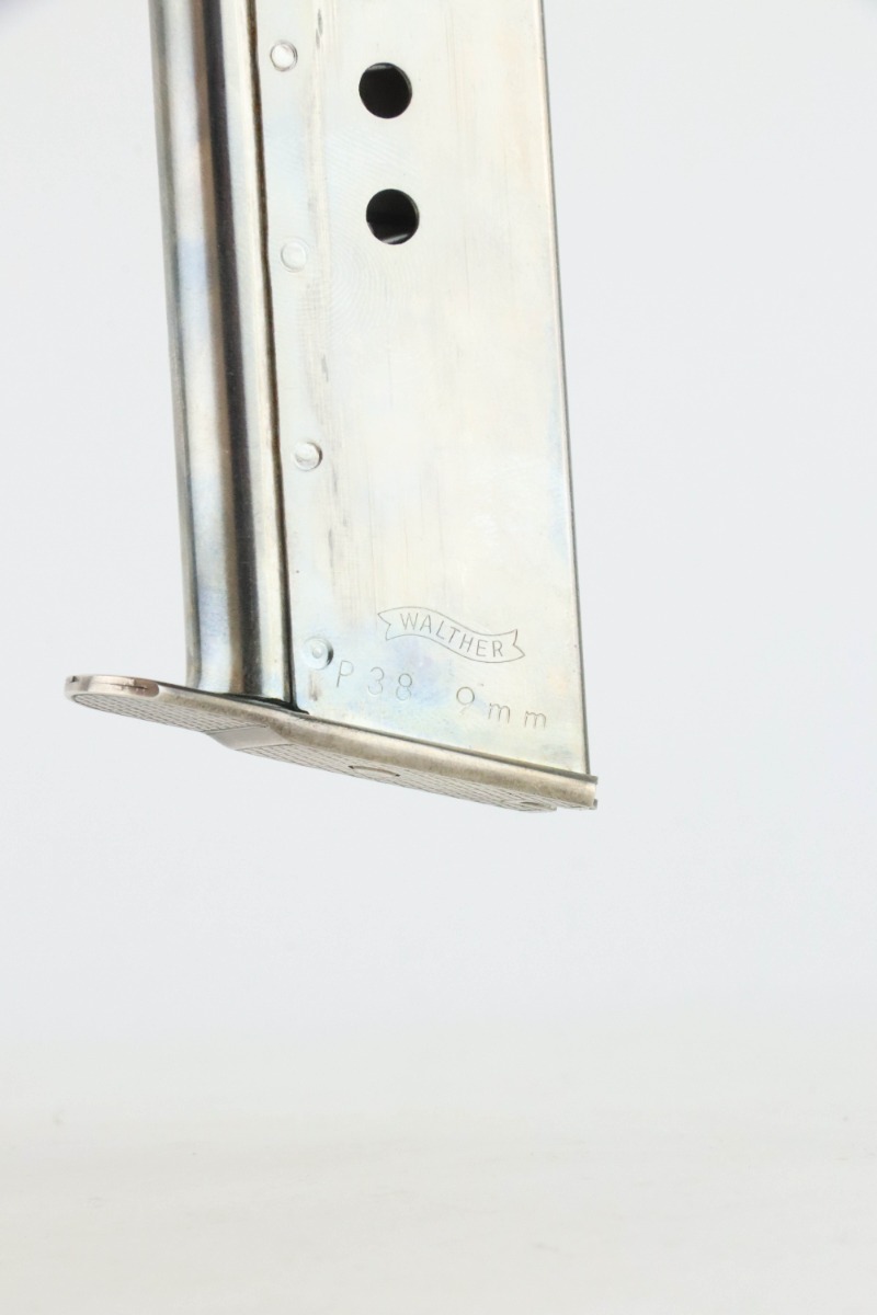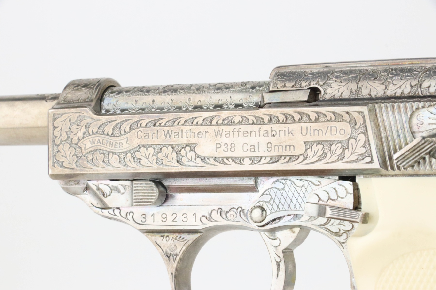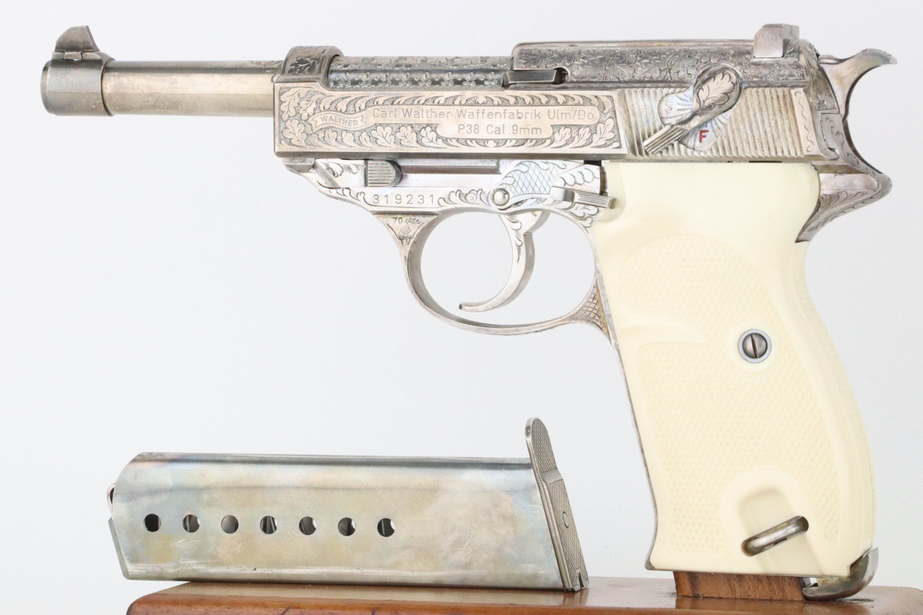 8/27/24 – This is a beautiful example of a factory-engraved, nickel-plated Walther P.38 from 1970. All matching with West German proofs and an Interarms marking on the slide. The entire gun features a beautiful, detailed Oak Leaf and Acorn engraving pattern. It has an excellent shiny nickel finish with just a few areas of very minor discoloration that almost looks like tarnish. Fitted with really nice ivory-colored plastic grips and comes with an engraved, nickel-plated magazine. Minty bore. De-cocker is functional.