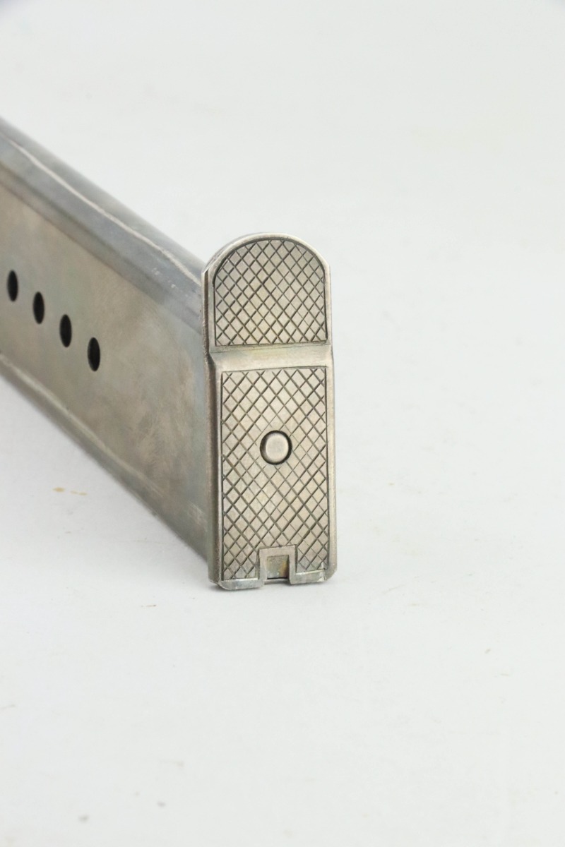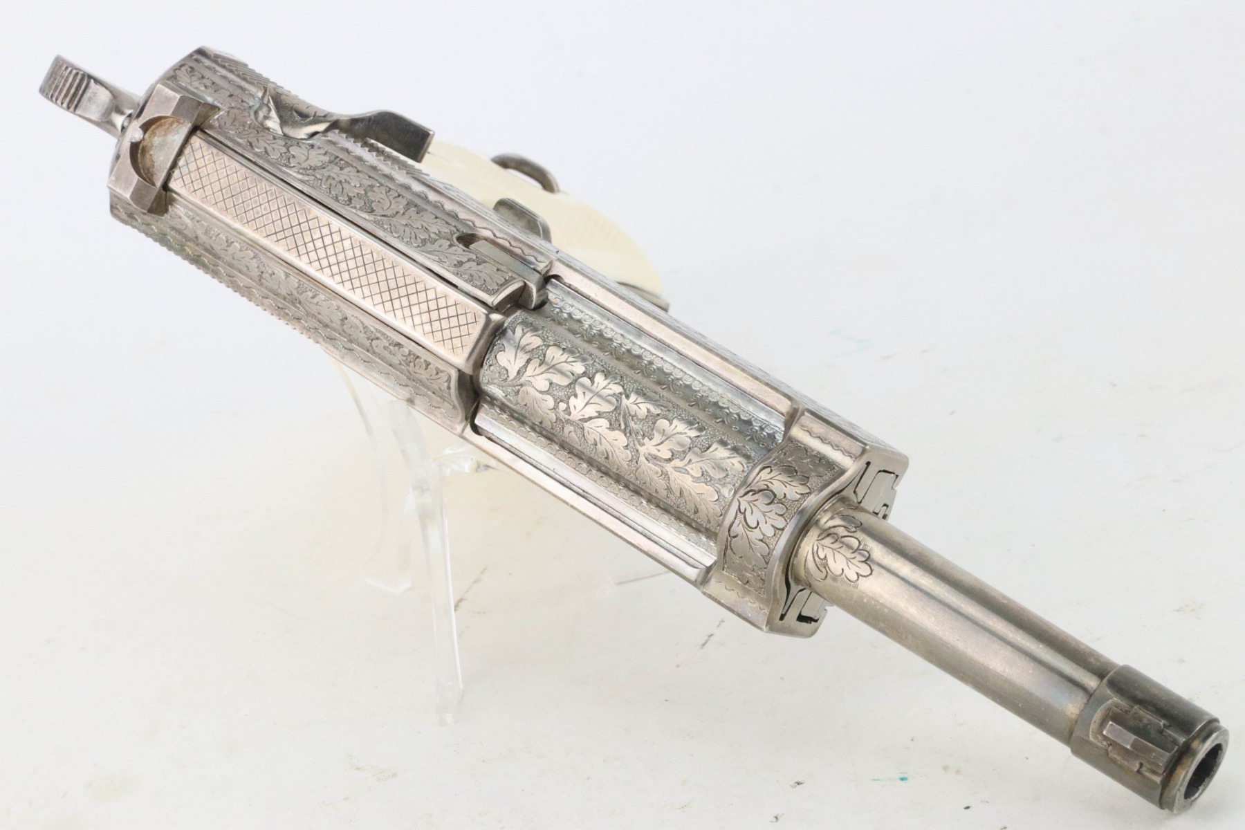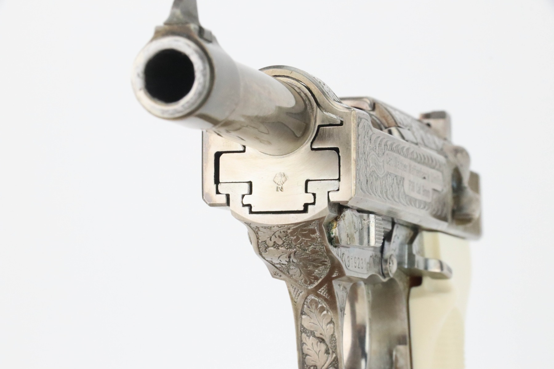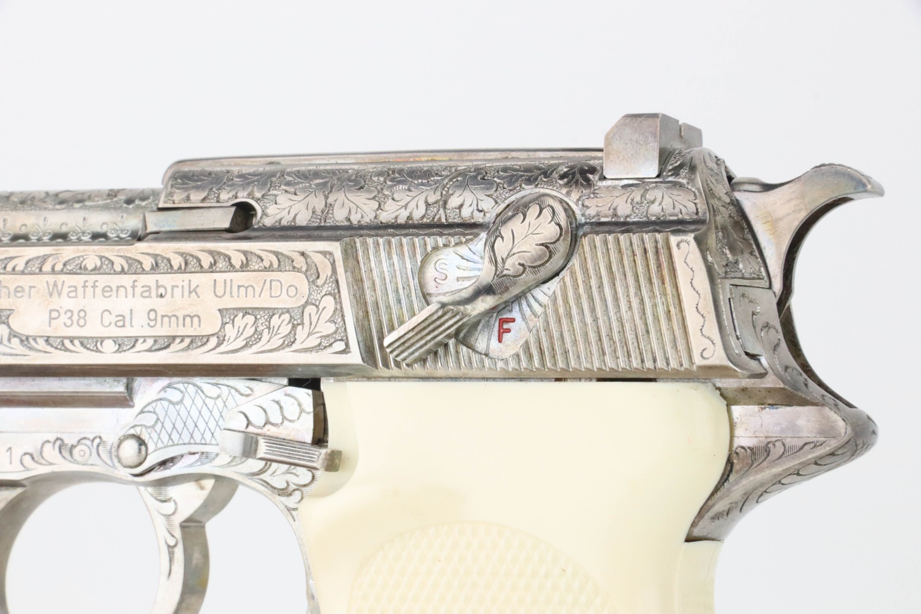 8/27/24 – This is a beautiful example of a factory-engraved, nickel-plated Walther P.38 from 1970. All matching with West German proofs and an Interarms marking on the slide. The entire gun features a beautiful, detailed Oak Leaf and Acorn engraving pattern. It has an excellent shiny nickel finish with just a few areas of very minor discoloration that almost looks like tarnish. Fitted with really nice ivory-colored plastic grips and comes with an engraved, nickel-plated magazine. Minty bore. De-cocker is functional.