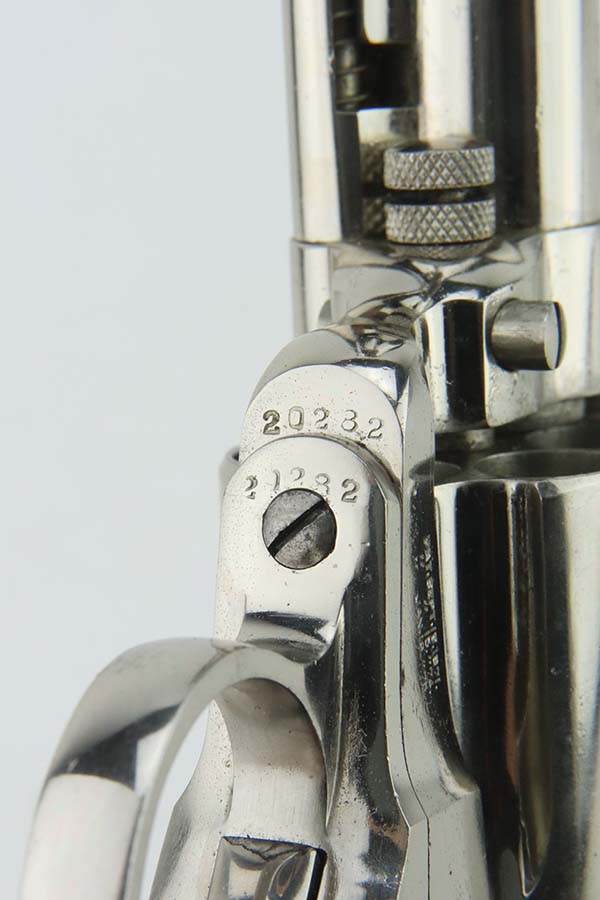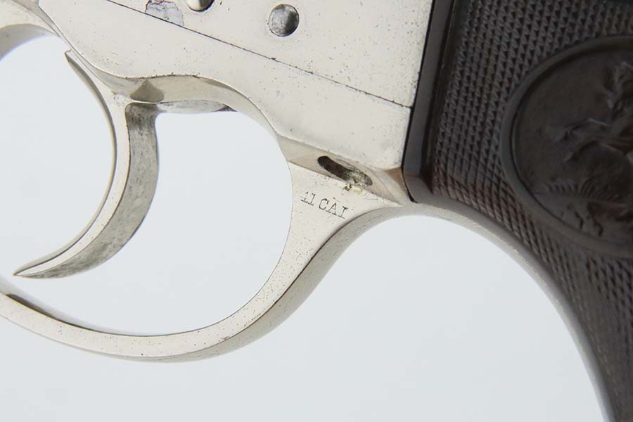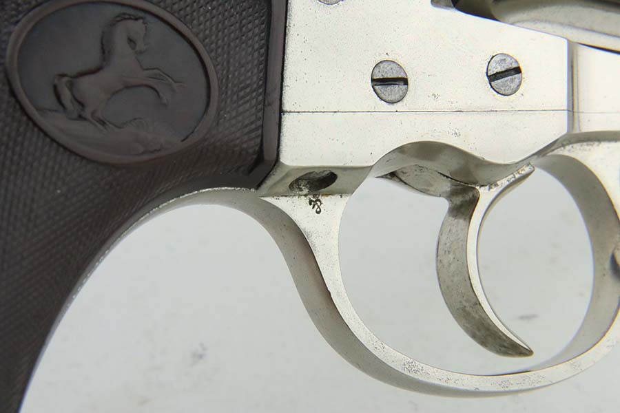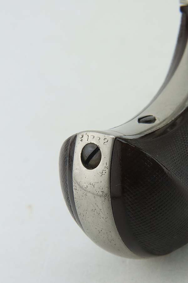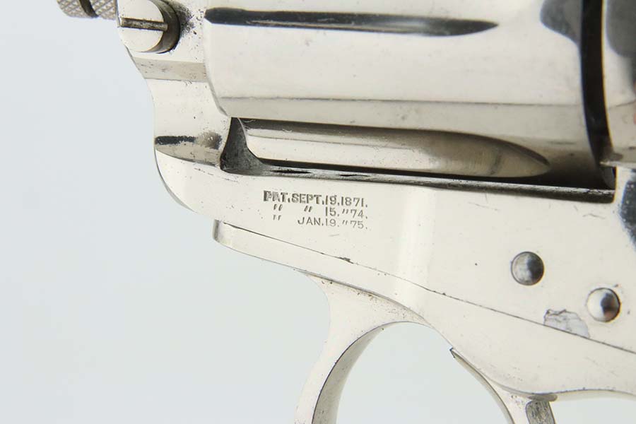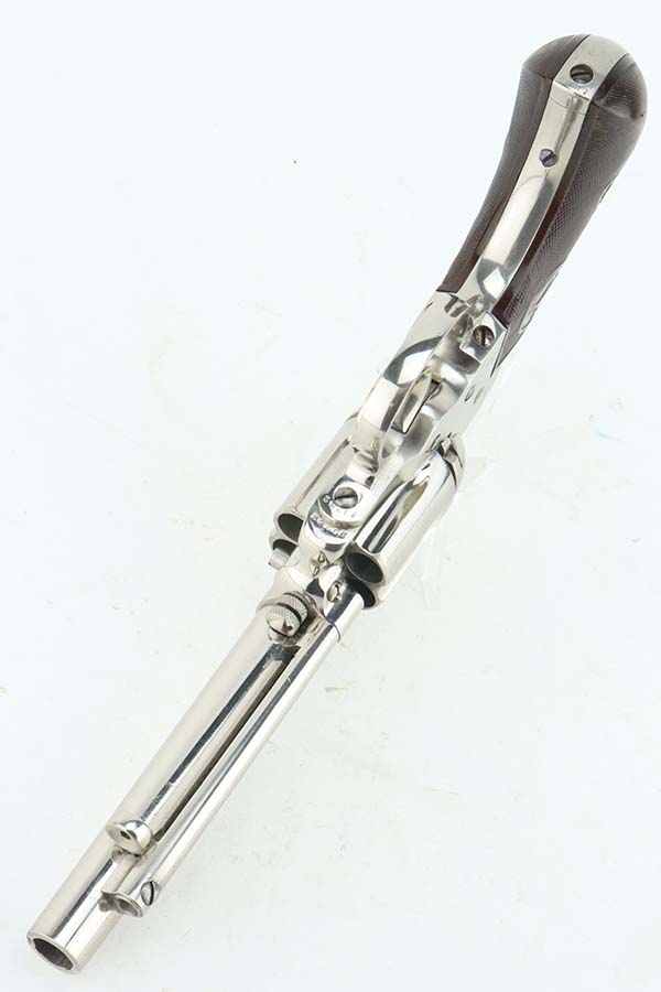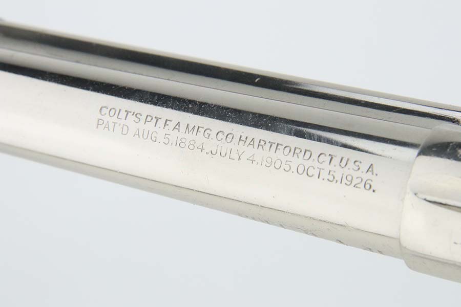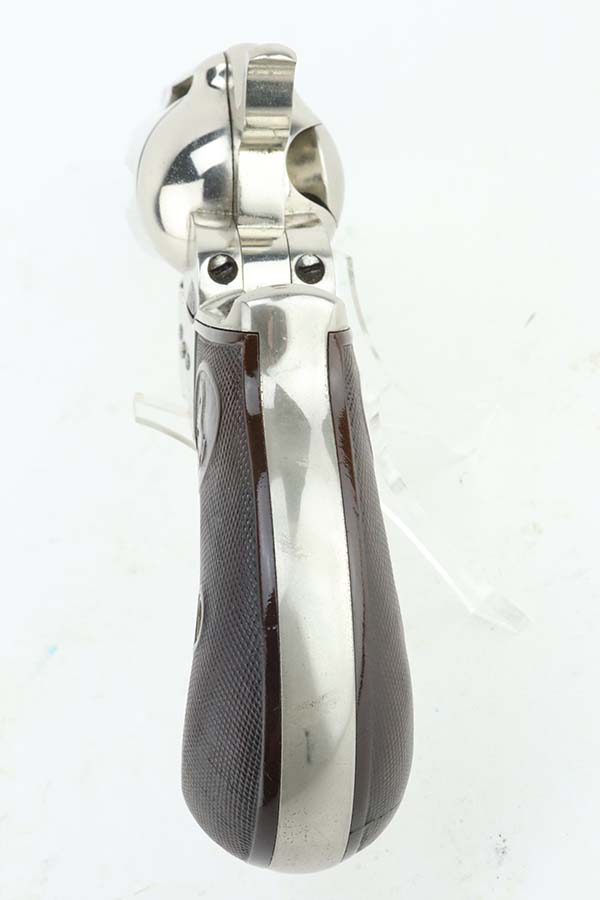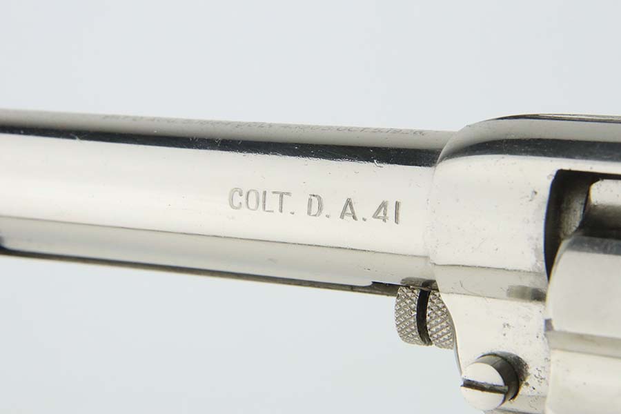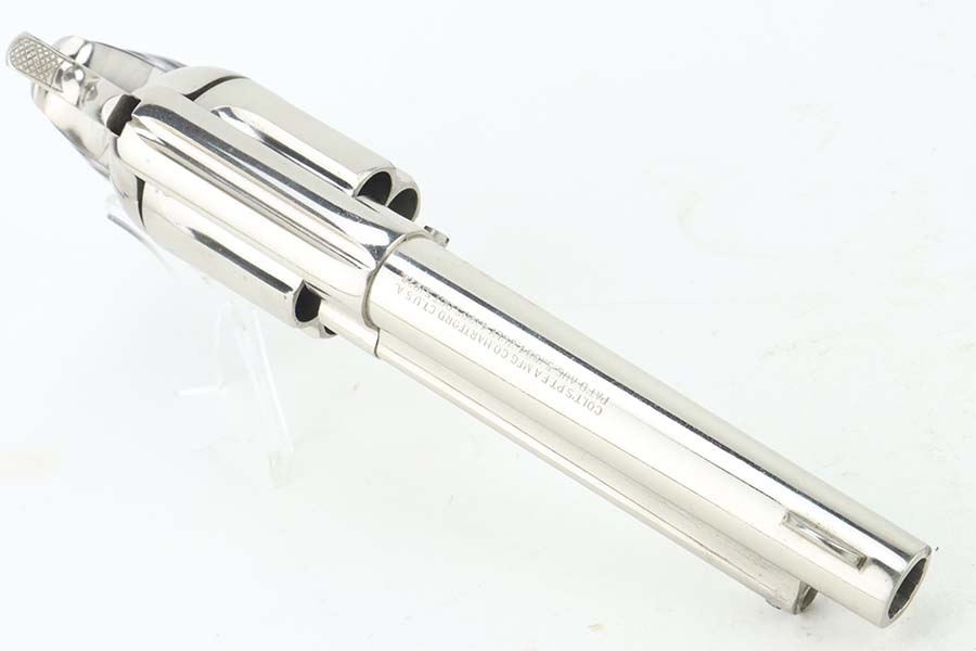 3/28/24 – This is a minty example of a factory-nickeled Colt Model 1877 “Thunderer” revolver, manufactured in 1880 and chambered in .41 Caliber. The gun is all matching and has retained virtually all of its finish, just very light micro-scratches throughout (typical). The bore has great rifling, but there is light spotty surface oxidation throughout and some small pits here and there. Fitted with period-correct hard rubber grips.