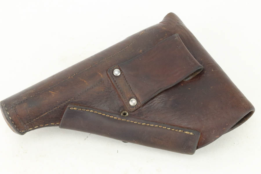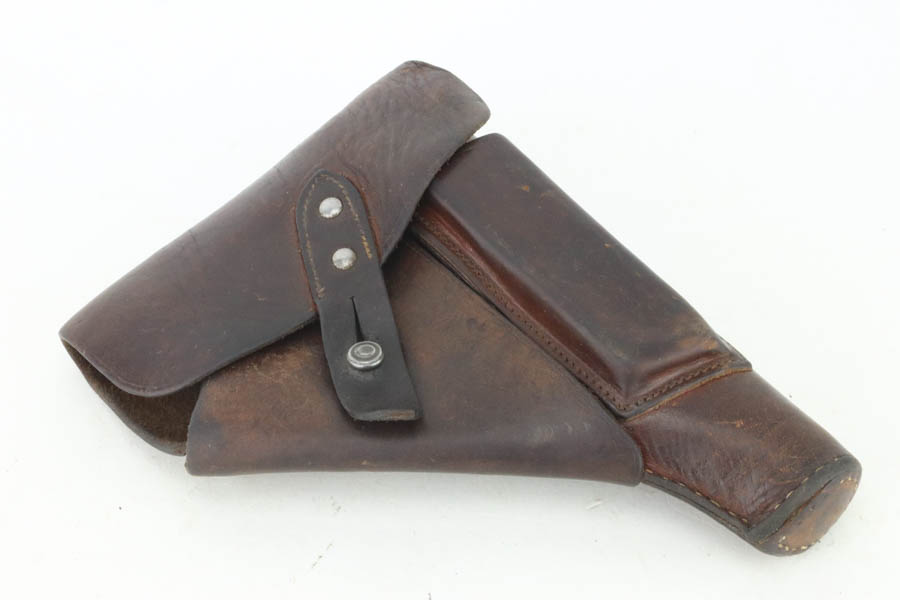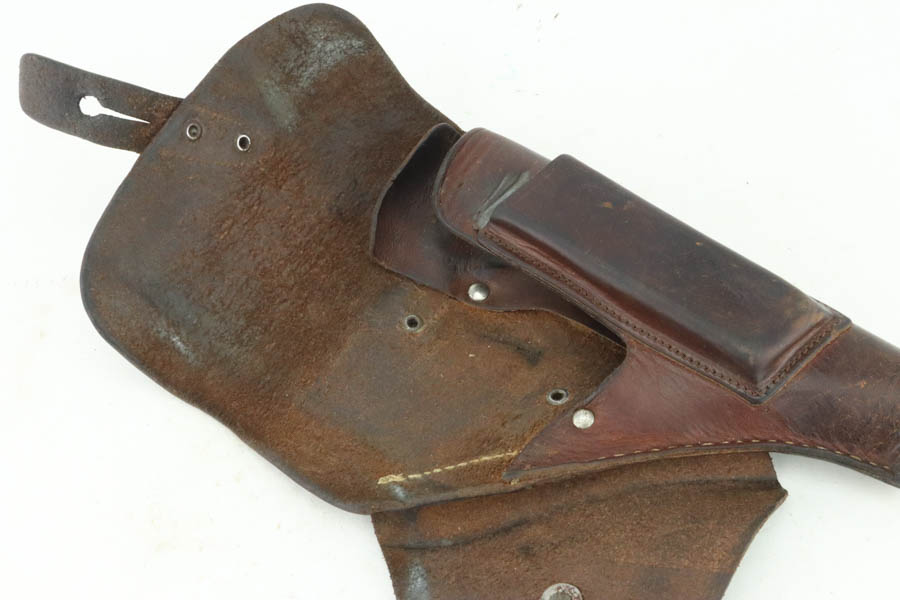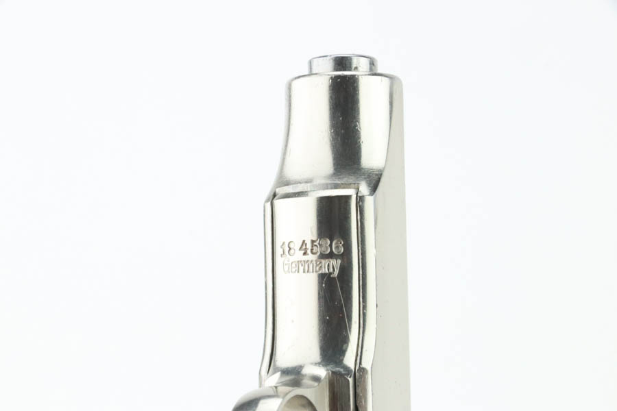 9/18/24 – This is an excellent example of a factory-nickel Erfurt Ortgies Pistol, manufactured in the 1920’s and chambered in 7.65mm. “Germany” export marking on the underside of the frame. This one has a really nice factory nickel-plated finish. It has retained nearly all of this finish, but there are some tiny chips in the finish around the slide serrations and micro-scratches in the finish throughout. Fitted with correct wood grips. It comes as a rig with a leather holster, a cleaning rod, two factory-nickeled magazines. The bore has good rifling with very light pin-pricking throughout.