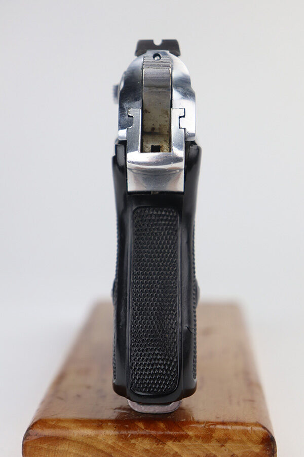 6/17/21 – This is an excellent example of a factory-nickeled Walther PPK sold in the commercial market in 1944. It is all matching and has the proper “Eagle N” commercial proofs. It has a blued rear sight, as we’d expect to see with a factory-nickeled gun. It has retained about 96% of its nickel plating with minor wear around the muzzle and along the left side of the slide. Tiny micro-scratches in the finish throughout. Comes with an excellent late-war black grip and a nickel-plated black finger extension magazine. Excellent bore – shiny with strong rifling.