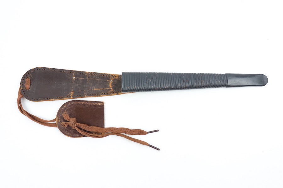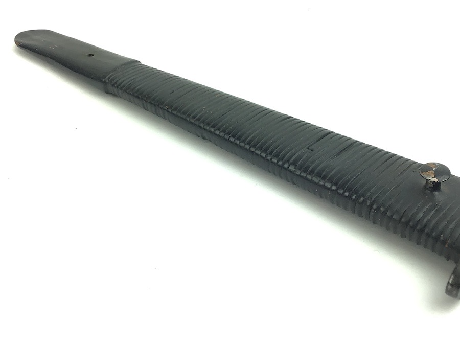 4/12/22 – This is an original Fairbairn & Sykes stiletto from WW2 era. The stiletto is a more scarce variation with a wider grip and lack of a beaded pattern. The hand guard is stamped “ENGLAND” on one side. The blade is minty with almost no finish loss. The scabbard is interesting and unique, in that it’s wrapped metal and not leather. The metal has a painted finish just like the handle, and is unmarked. The knife does not fit snug in the scabbard. The leather frog is in nice shape but the stitching is missing around the top. The other scabbard is a typical WWI pattern of metal and leather. Great stitching and nice fittings. All unmarked.