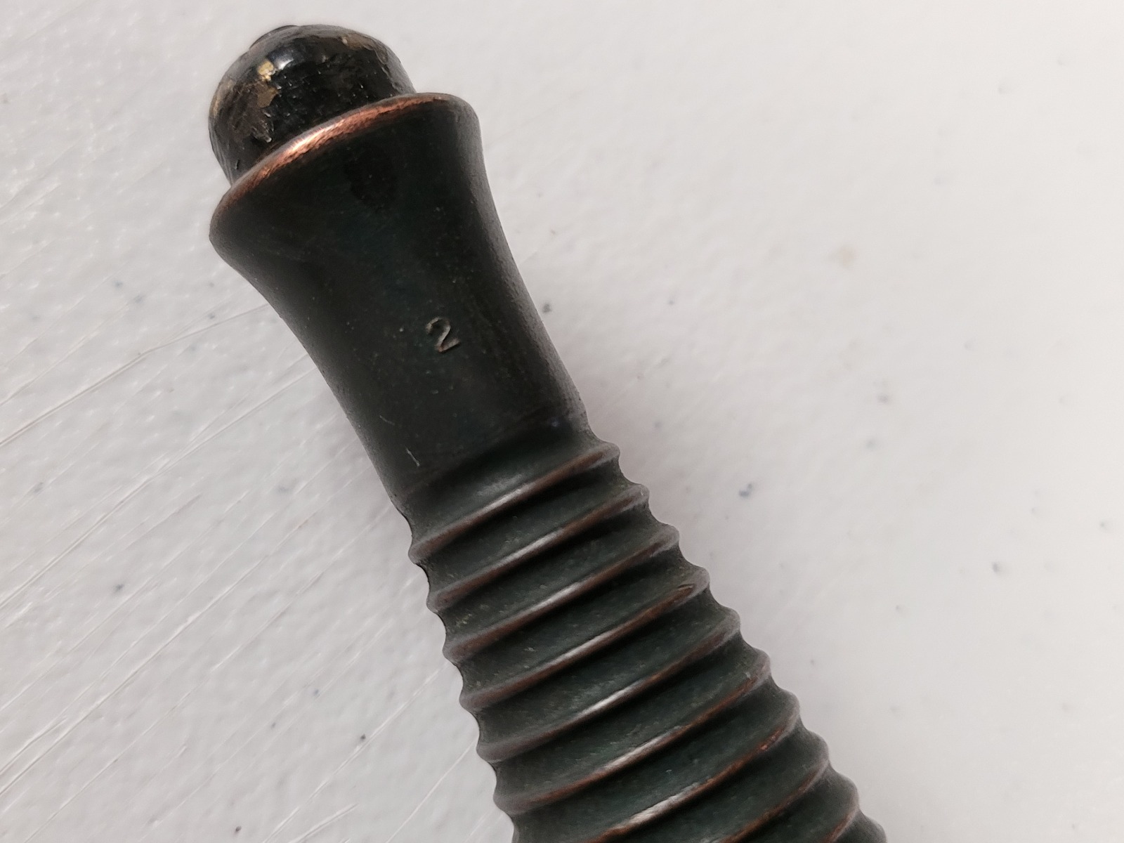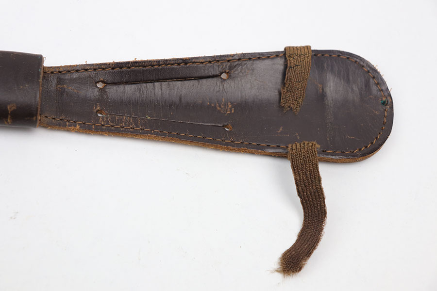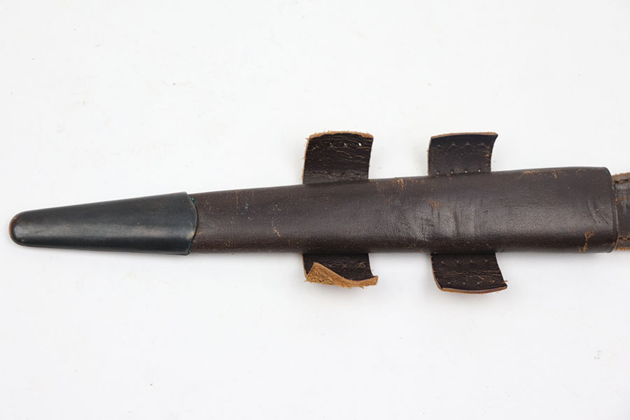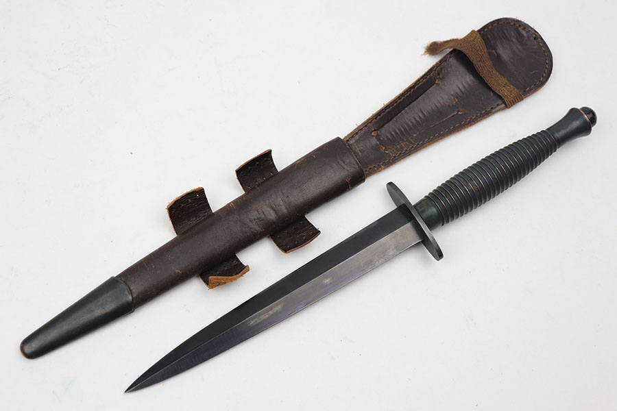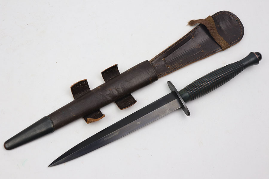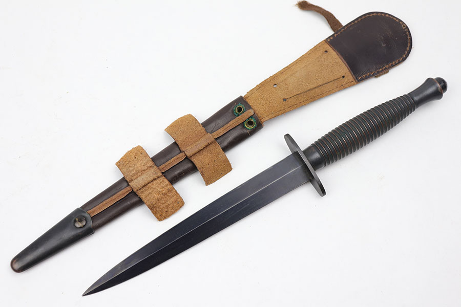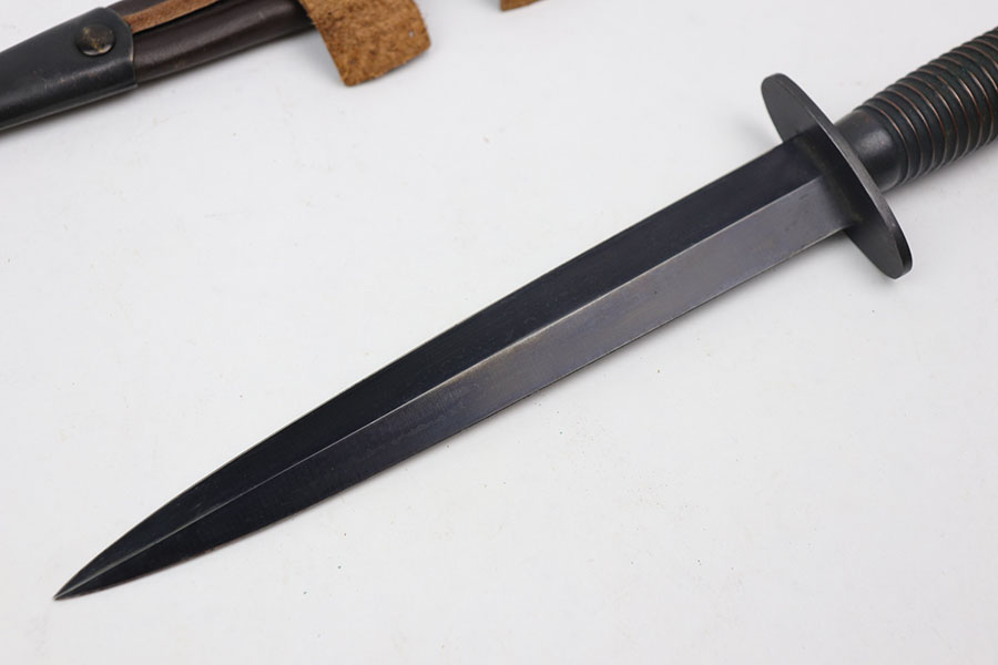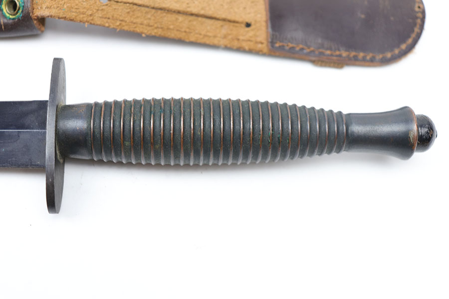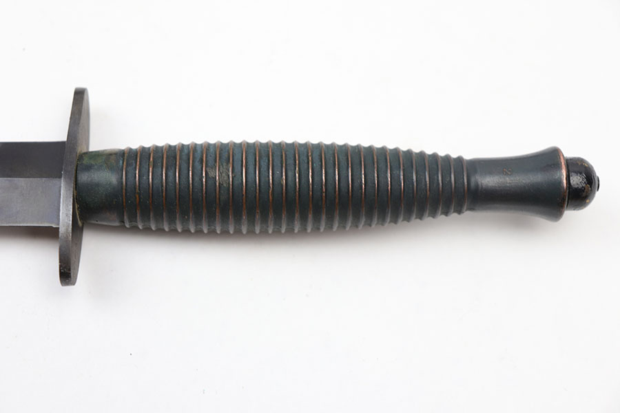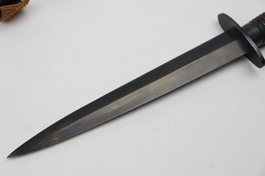 11/19/20 – This is a 3rd model Fairbairn-Sykes stiletto. Late WW2 production. Comes with the original leather sheath. The stiletto is stamped “ENGLAND” on the hand guard. The handle is maker stamped with a “2” manufacturer code. Most likely Wilkinson Sword. Excellent bluing on the blade with minimal wear. Handle shows some aging but generally in great condition. The fastening loop on the top of the frog is broken, as shown. No other notable flaws.