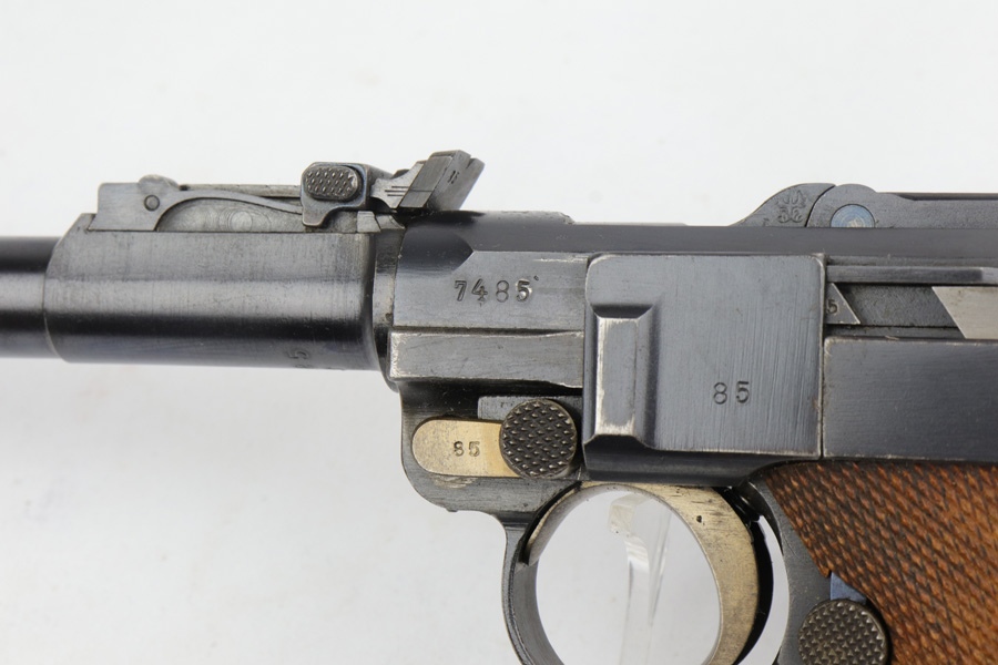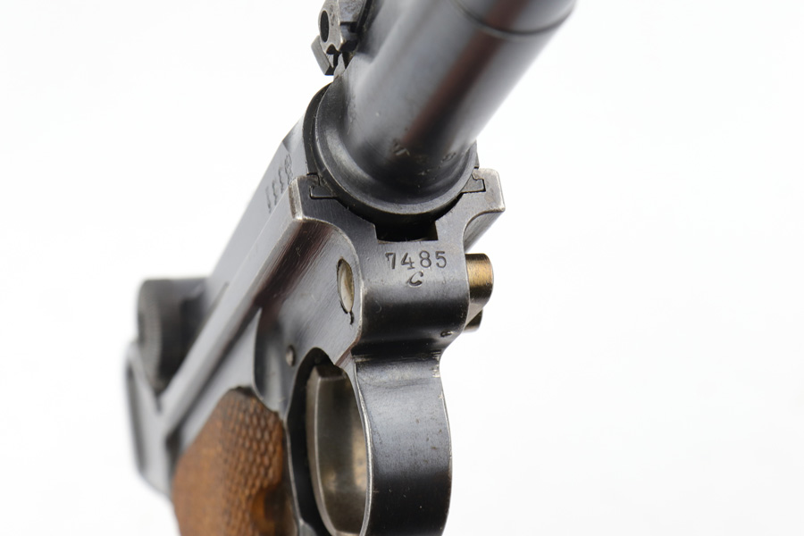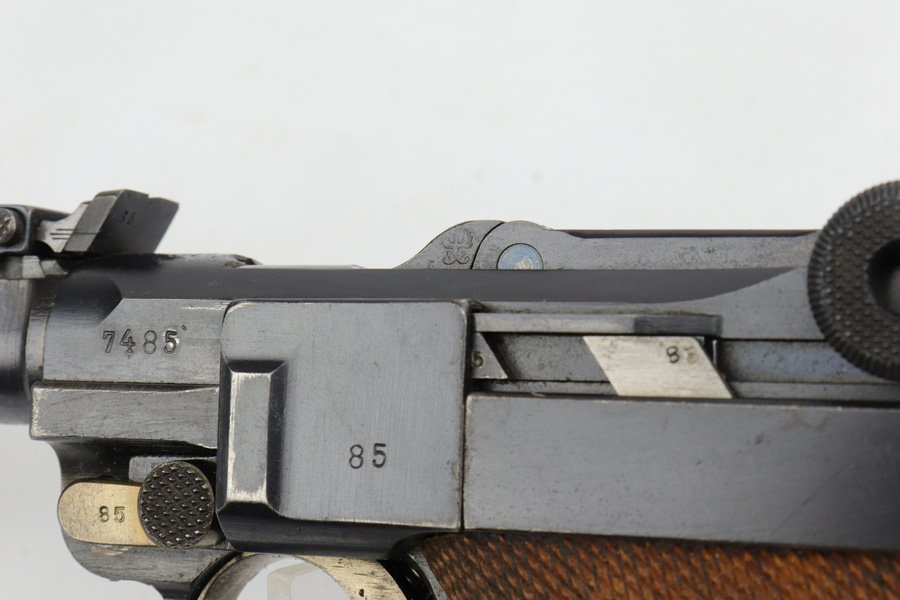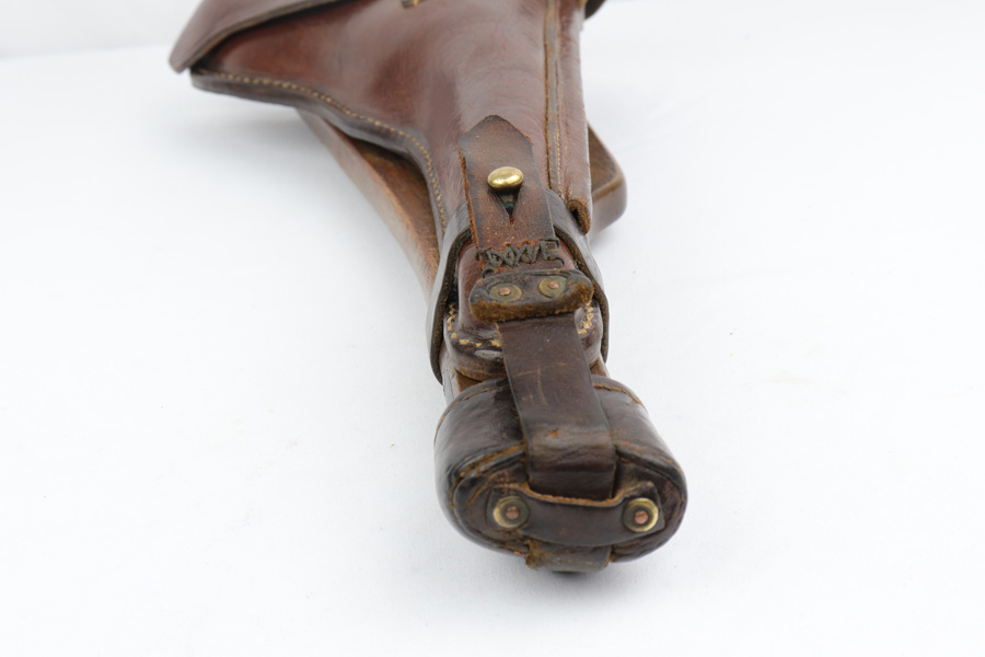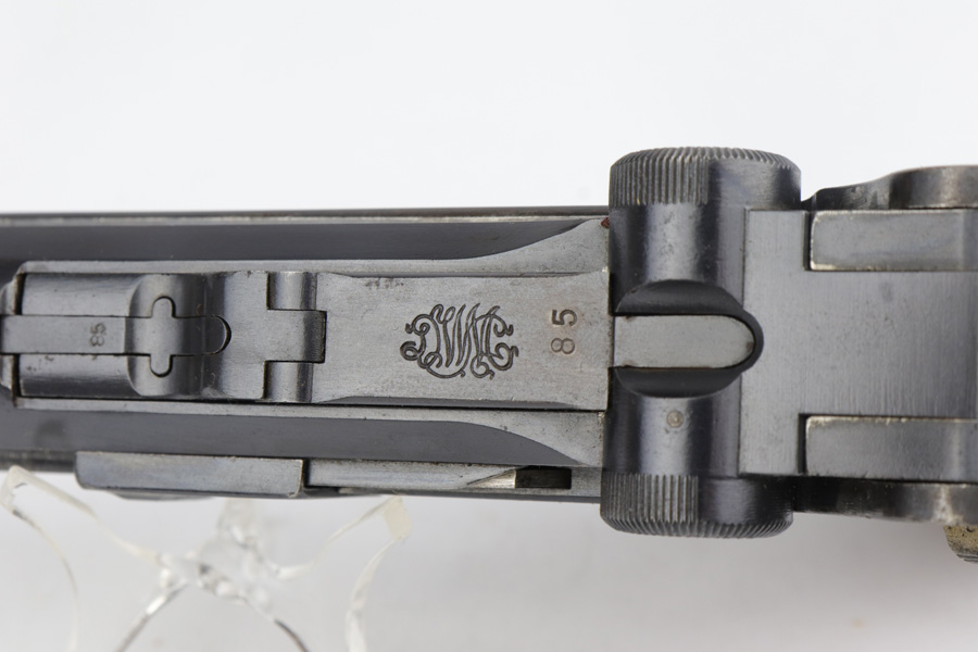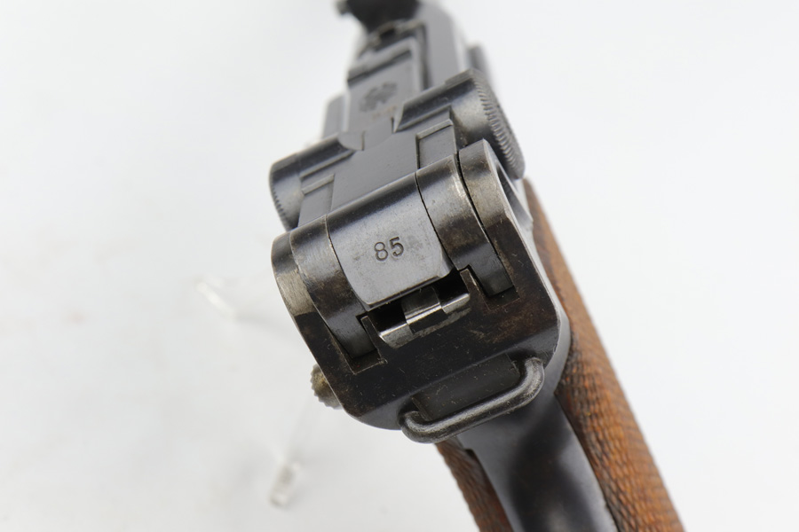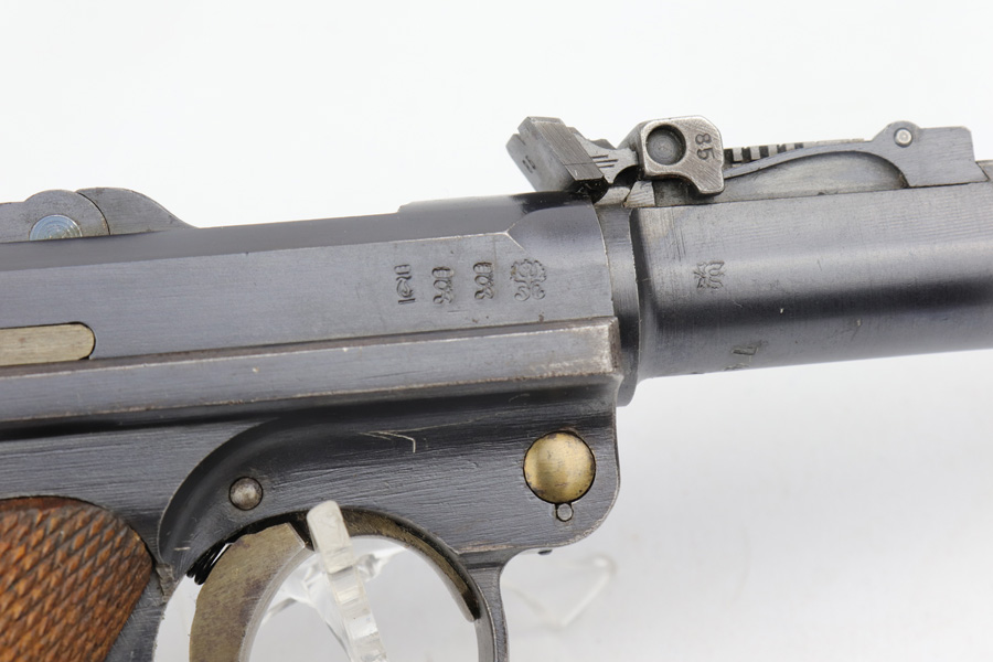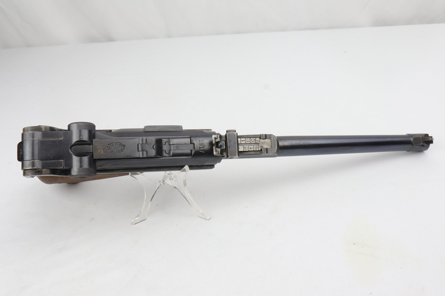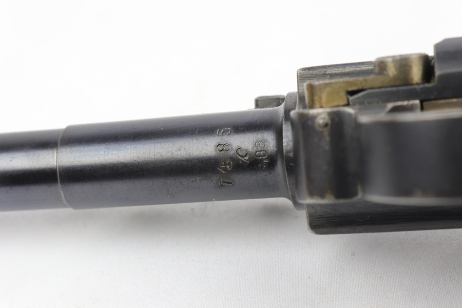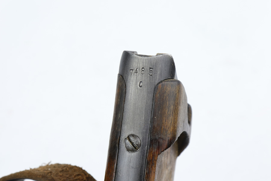 3/8/19 – This is a terrific example of a 1917 DWM Artillery Luger rig with matching magazine and stock, cleaning rod and holster. The pistol is all original and correct with about 97% blue remaining, with very minor edge wear from the holster and a little bit of finish loss on each strap. Small parts still show excellent straw, and the excellent grips are also matching to the pistol. The magazine is numbered to the pistol but as you can see in the photo, the last digit can’t be seen easily as there is a large ding in the wood bottom there. The stock is also matching to the gun and has clear Imperial proof mark on the back. The leather on the stock attachments is original but the cup strap has been repaired. The holster is in excellent condition with clear 1917 date and maker mark on the back. We did swap in a nicer but original holster as the one that came with the pistol was worn and badly damaged. Original cleaning rod is present and in very good condition. Pistol bore is mint – hardly looks used.