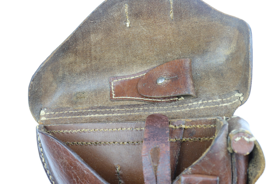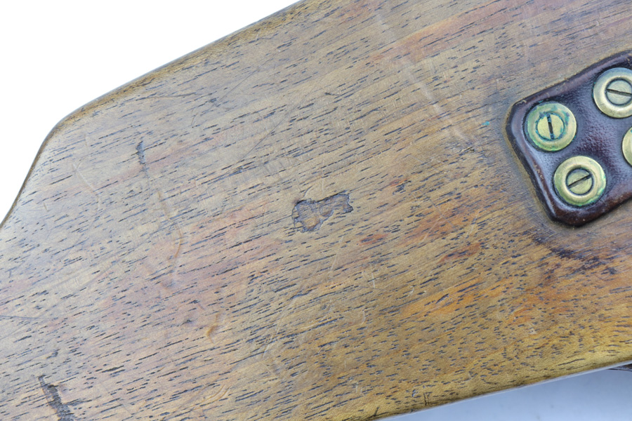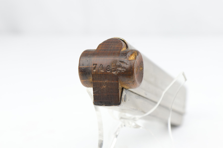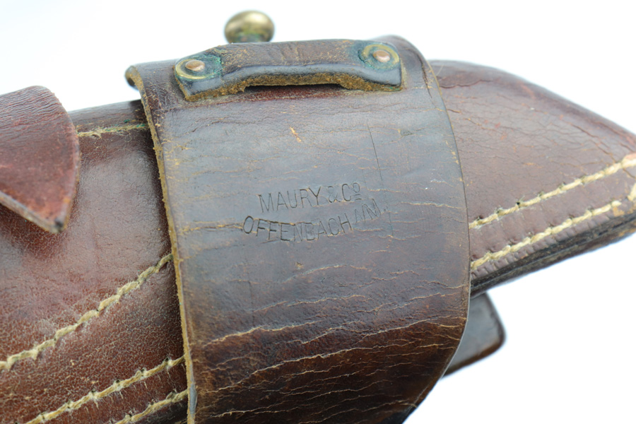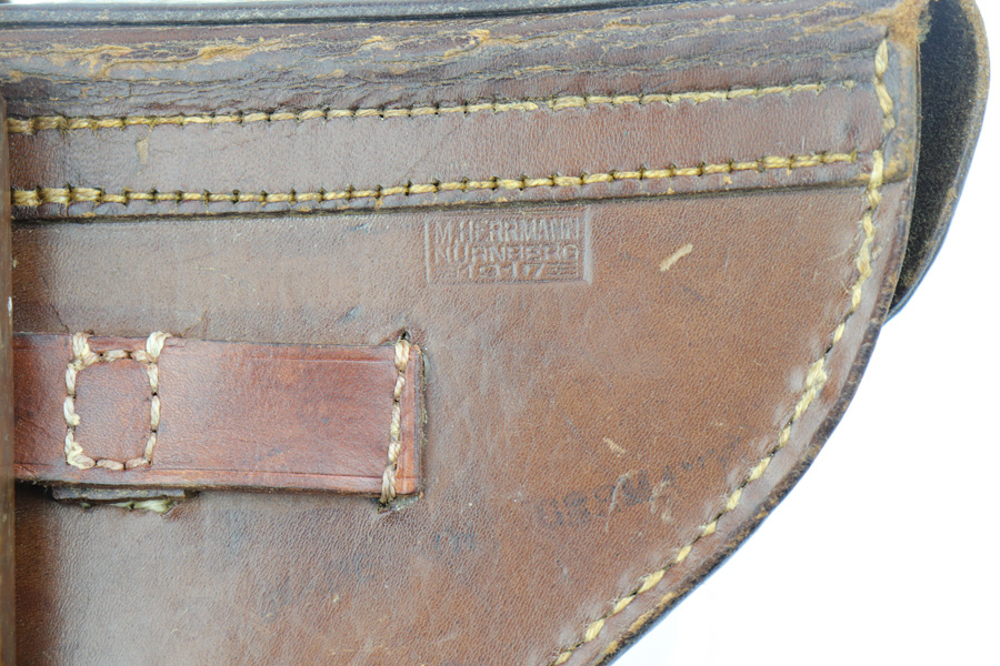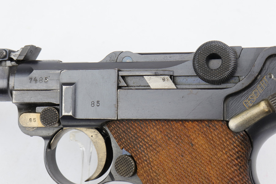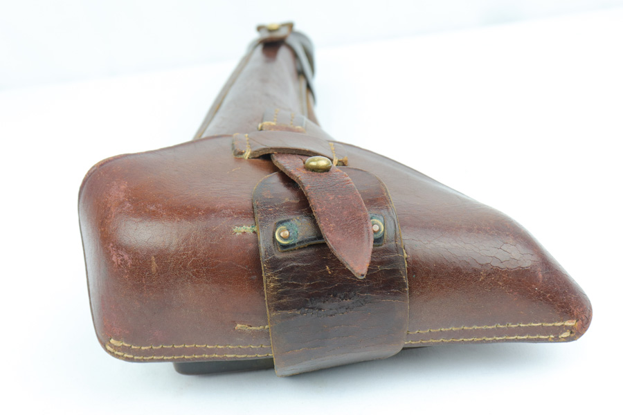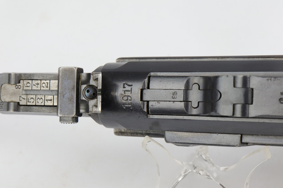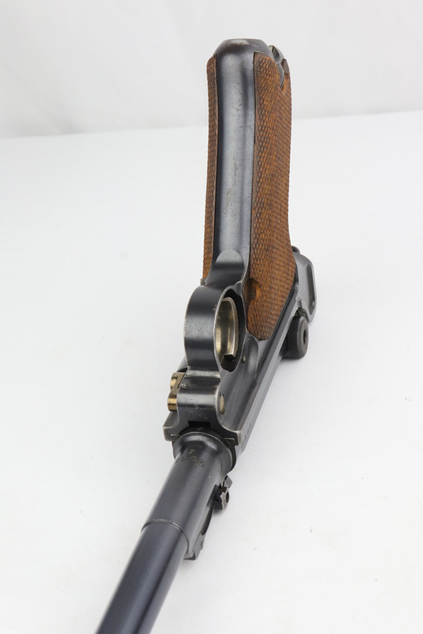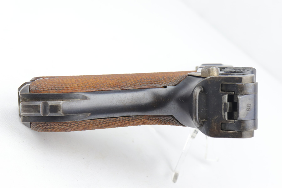 3/8/19 – This is a terrific example of a 1917 DWM Artillery Luger rig with matching magazine and stock, cleaning rod and holster. The pistol is all original and correct with about 97% blue remaining, with very minor edge wear from the holster and a little bit of finish loss on each strap. Small parts still show excellent straw, and the excellent grips are also matching to the pistol. The magazine is numbered to the pistol but as you can see in the photo, the last digit can’t be seen easily as there is a large ding in the wood bottom there. The stock is also matching to the gun and has clear Imperial proof mark on the back. The leather on the stock attachments is original but the cup strap has been repaired. The holster is in excellent condition with clear 1917 date and maker mark on the back. We did swap in a nicer but original holster as the one that came with the pistol was worn and badly damaged. Original cleaning rod is present and in very good condition. Pistol bore is mint – hardly looks used.