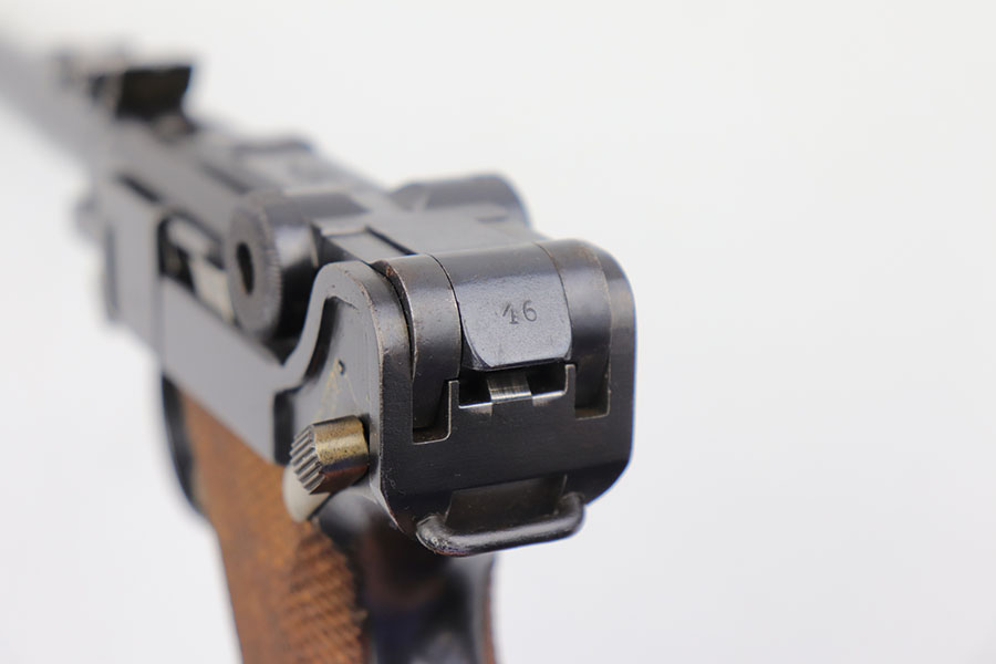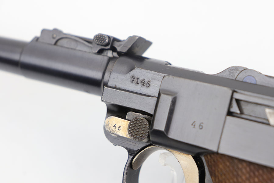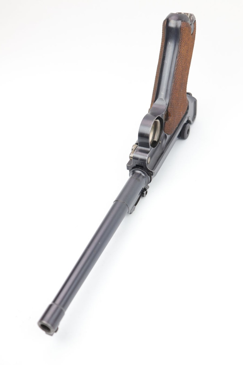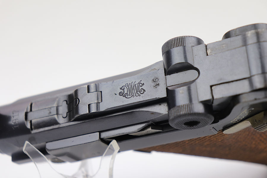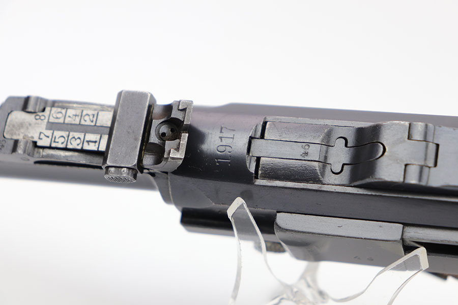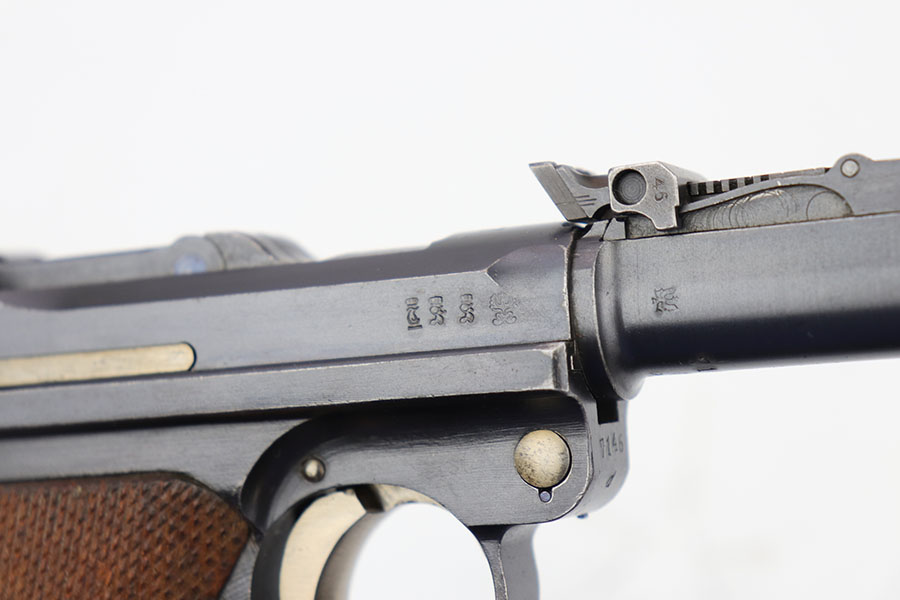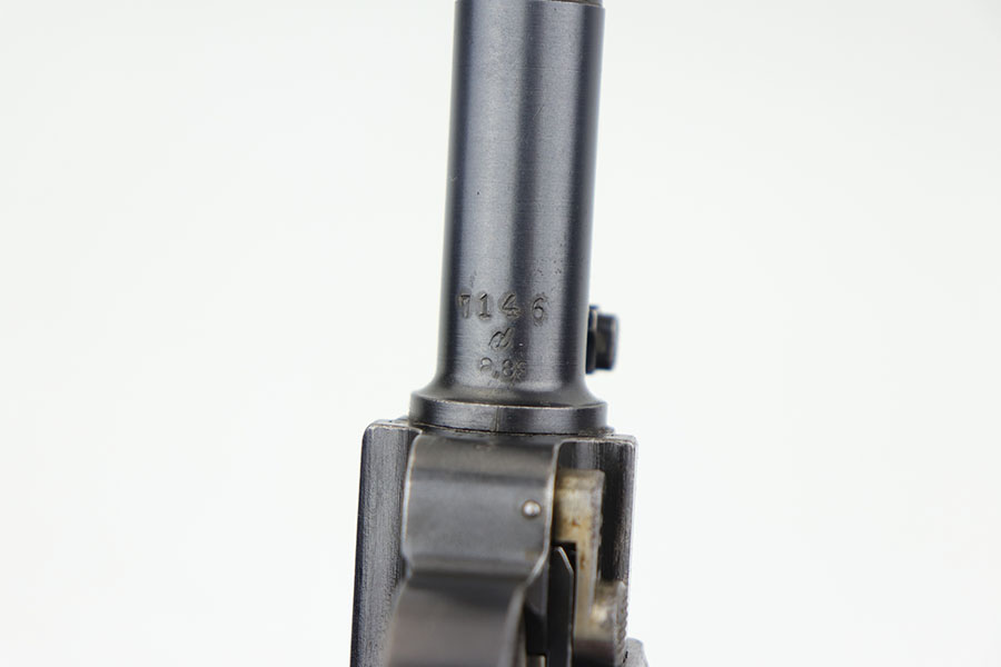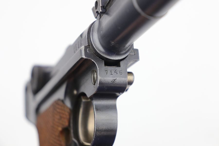 3/12/20 – This is a near-mint DWM Artillery Luger from 1917 with matching magazine and mint holster. The pistol is all matching, including the grips. It has 98-99% of the original blue, with most of the finish loss on the left side of the muzzle, and a couple very minor scuffs on the front strap. The small parts have excellent straw with hardly any rub wear. Grips are minty too, and bore is shiny with strong rifling. Comes with a 1916 dated holster that may be the finest artillery holster you’ll ever see.