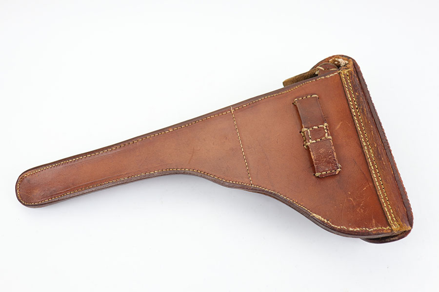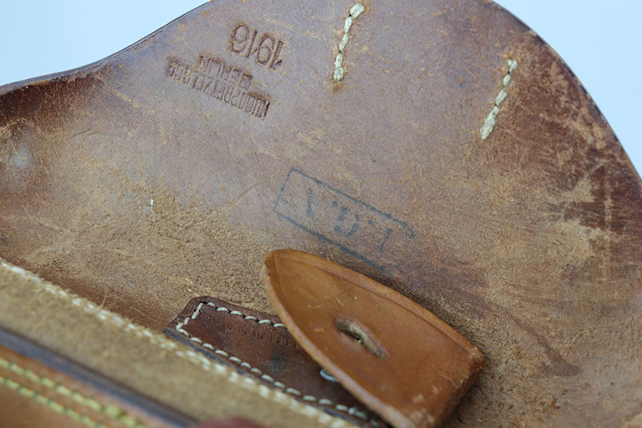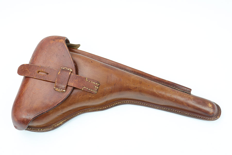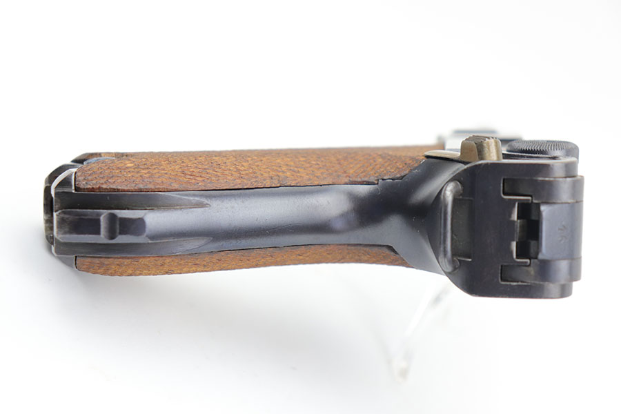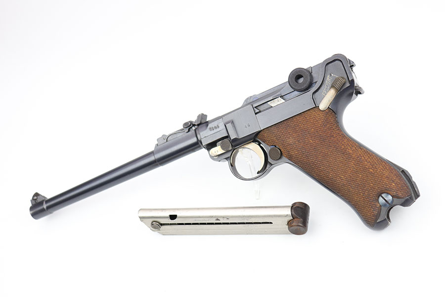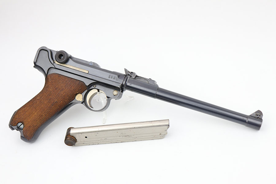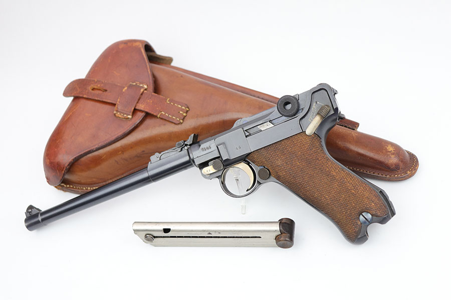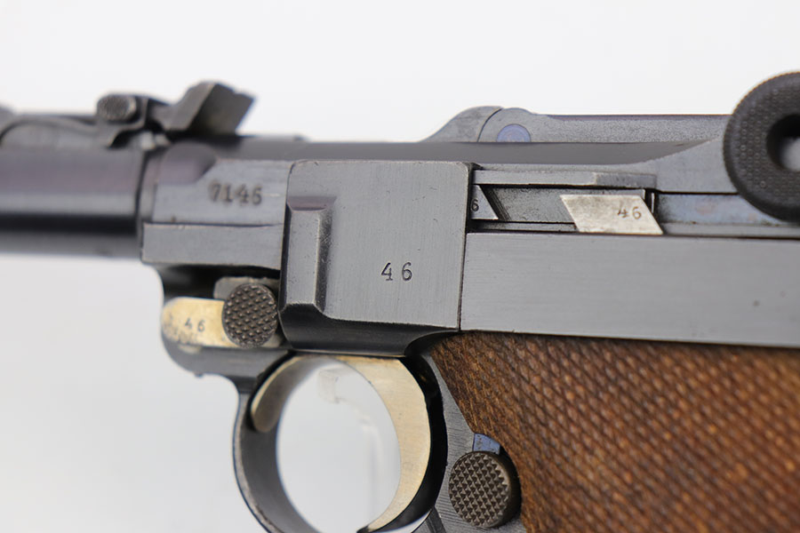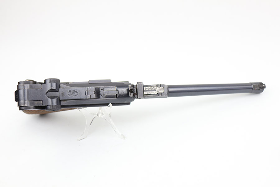 3/12/20 – This is a near-mint DWM Artillery Luger from 1917 with matching magazine and mint holster. The pistol is all matching, including the grips. It has 98-99% of the original blue, with most of the finish loss on the left side of the muzzle, and a couple very minor scuffs on the front strap. The small parts have excellent straw with hardly any rub wear. Grips are minty too, and bore is shiny with strong rifling. Comes with a 1916 dated holster that may be the finest artillery holster you’ll ever see.