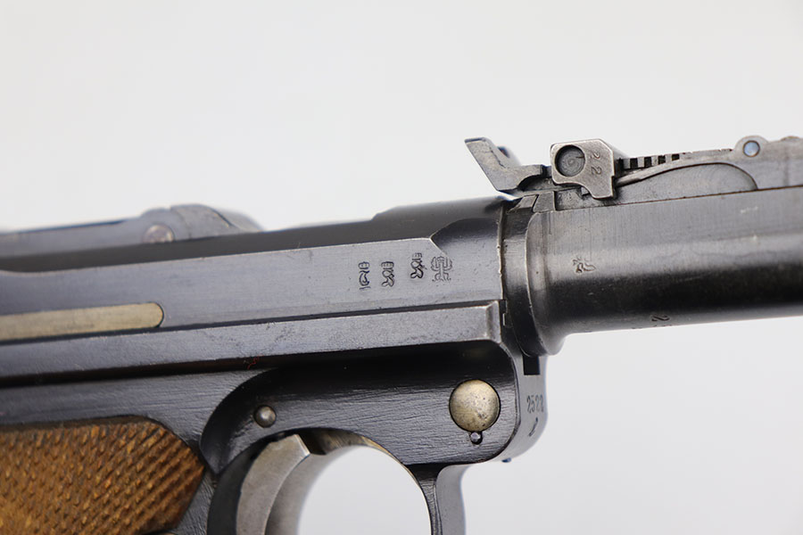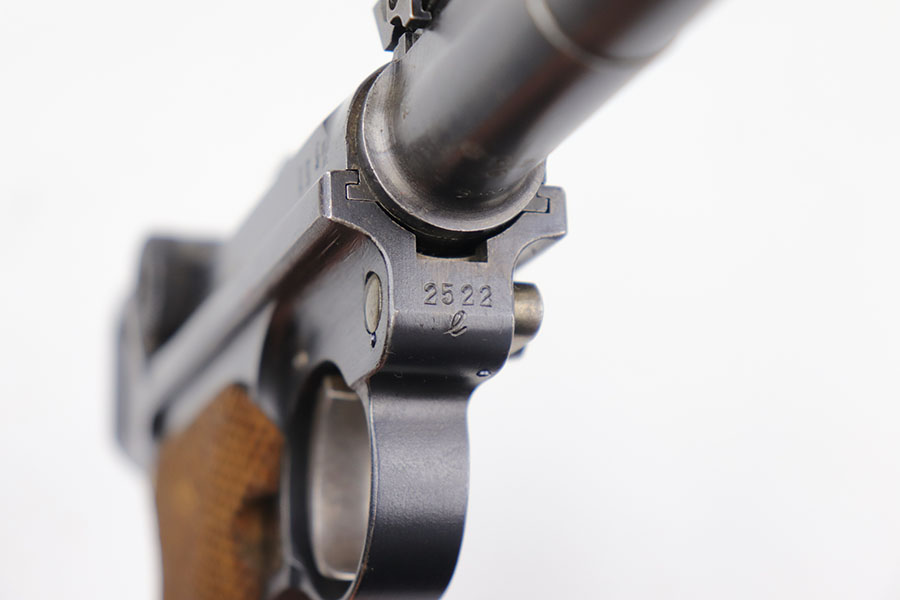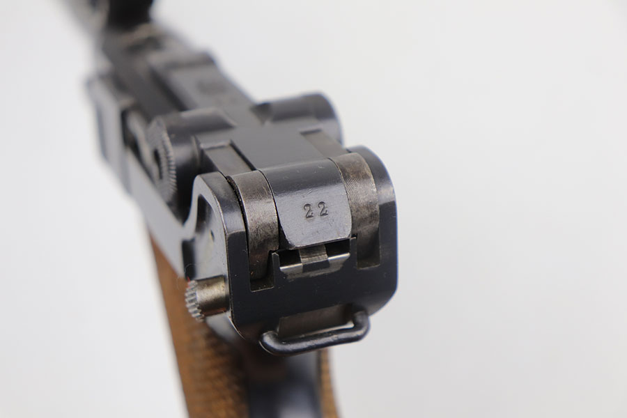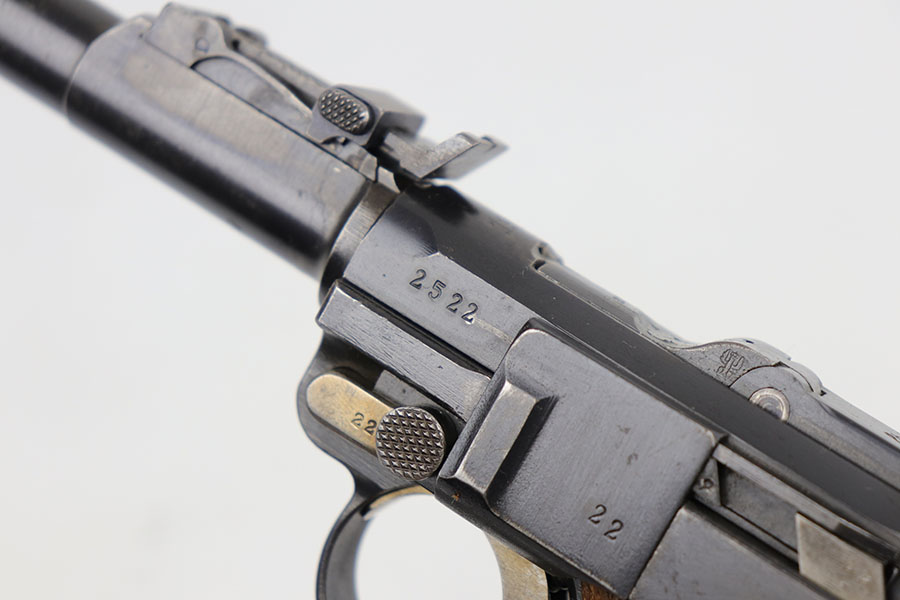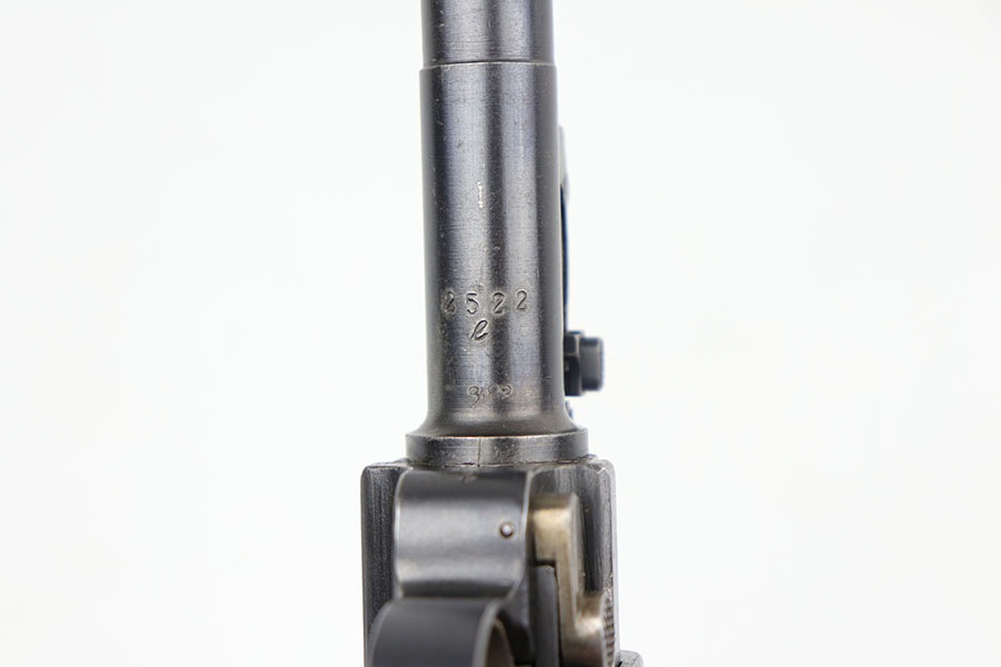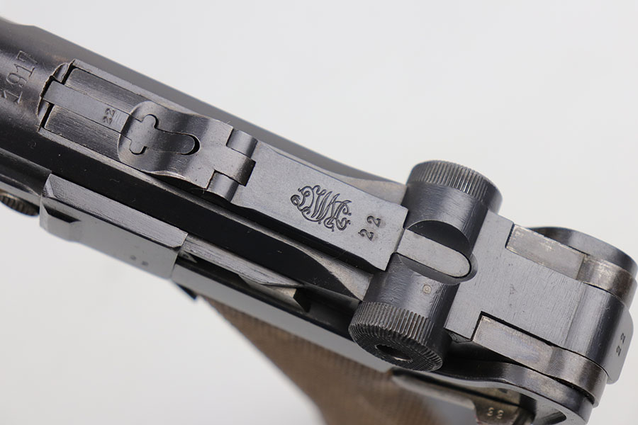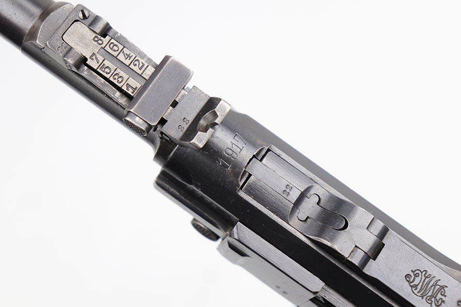 1/8/20 – This is a terrific 1917 DWM Artillery Luger rig with the original matching grips, stock and magazine. The pistol is all original with 97% blue remaining, as there’s minor muzzle wear on each side, as well as a little finish loss on the ears of the receiver and a small area of patina on the back strap. Small parts have about 70-80% of the original straw. Grips are in excellent condition with minimal signs of handling. Bore is shiny with strong rifling but does have minor frost and a little pitting closer to the muzzle. Stock is in excellent condition with matching number to pistol and crisp imperial proof. Original cup and excellent holster are included. The holster is 1916 dated with G.A. Roever maker mark. It’s in similar condition to the pistol, but does have a serial number on the back that does not match the Luger. Rig is completed by an unmarked tool and original cleaning rod.