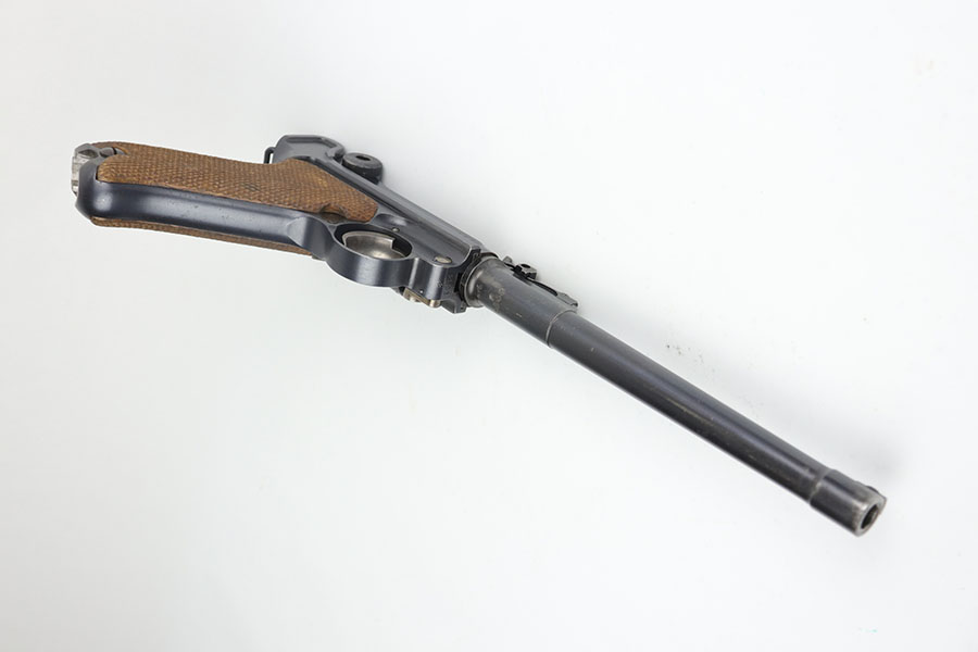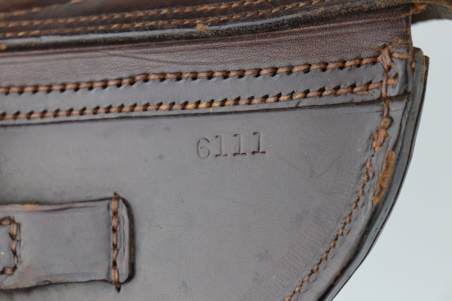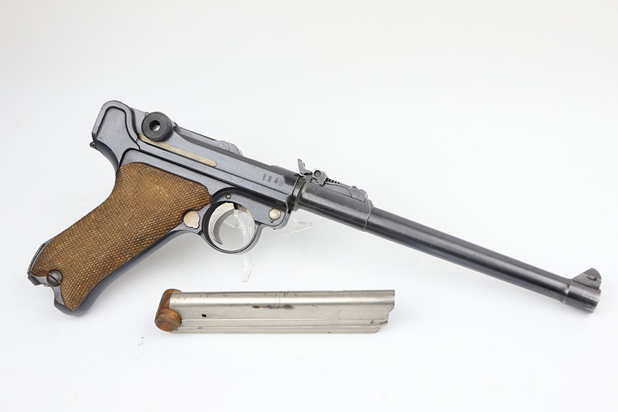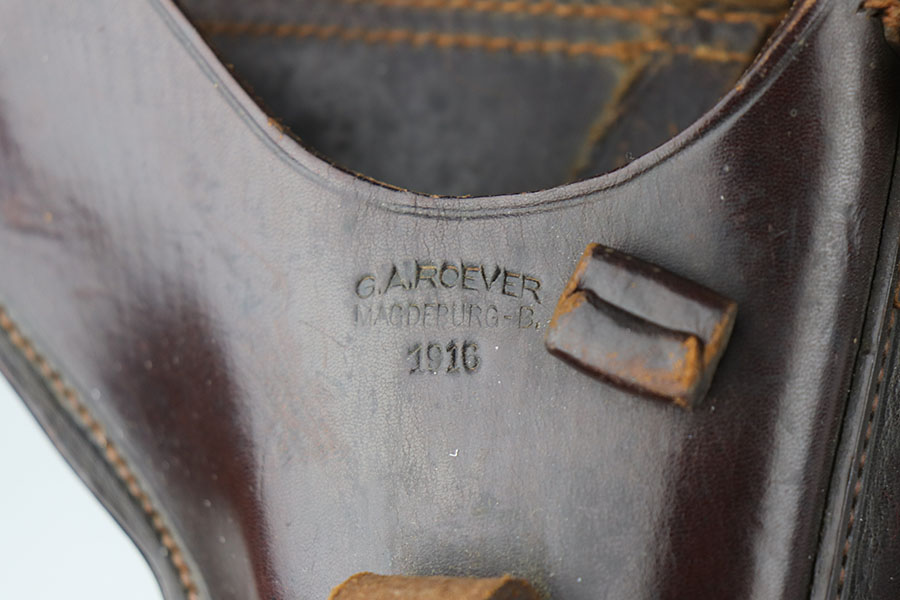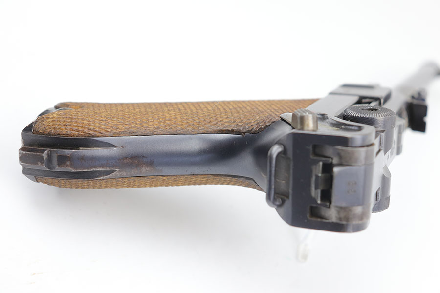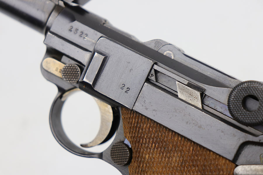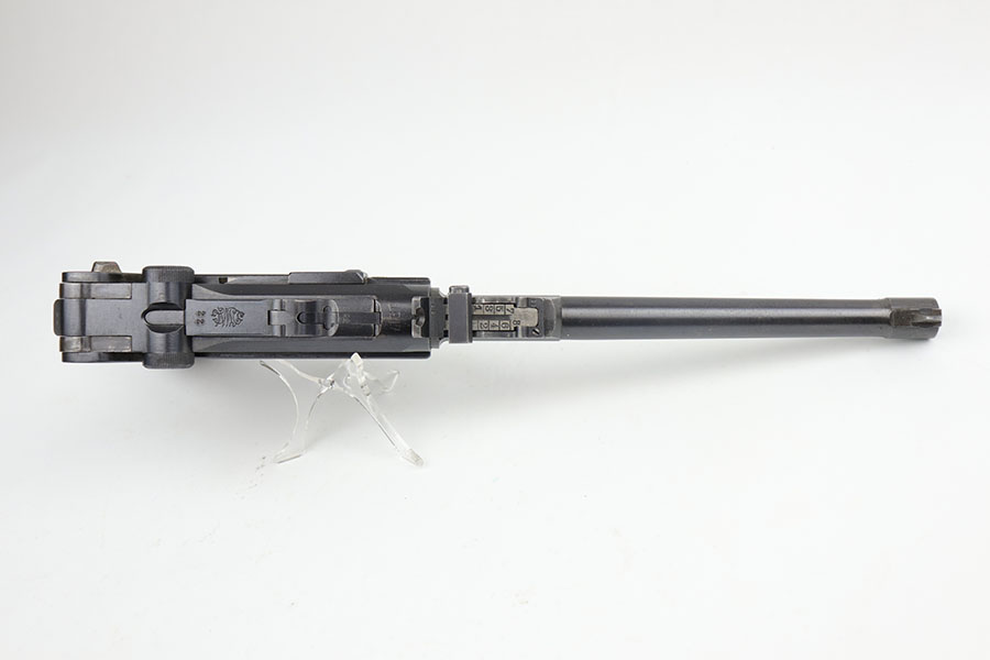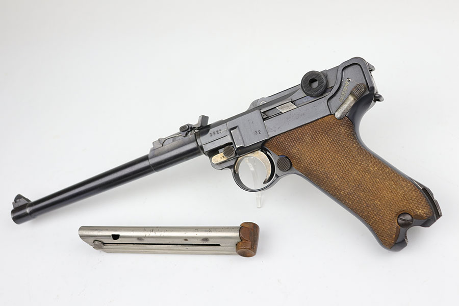 1/8/20 – This is a terrific 1917 DWM Artillery Luger rig with the original matching grips, stock and magazine. The pistol is all original with 97% blue remaining, as there’s minor muzzle wear on each side, as well as a little finish loss on the ears of the receiver and a small area of patina on the back strap. Small parts have about 70-80% of the original straw. Grips are in excellent condition with minimal signs of handling. Bore is shiny with strong rifling but does have minor frost and a little pitting closer to the muzzle. Stock is in excellent condition with matching number to pistol and crisp imperial proof. Original cup and excellent holster are included. The holster is 1916 dated with G.A. Roever maker mark. It’s in similar condition to the pistol, but does have a serial number on the back that does not match the Luger. Rig is completed by an unmarked tool and original cleaning rod.
