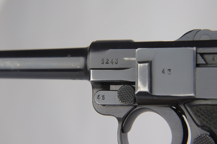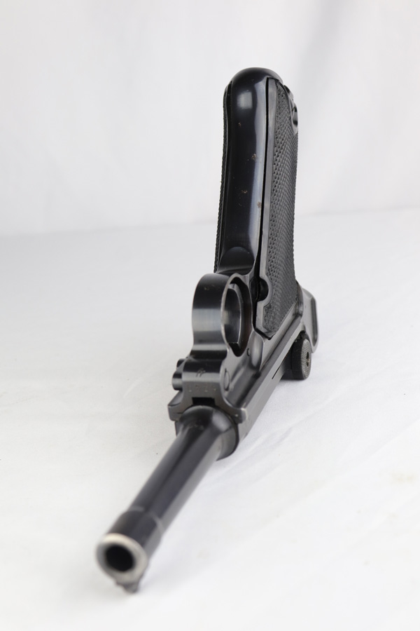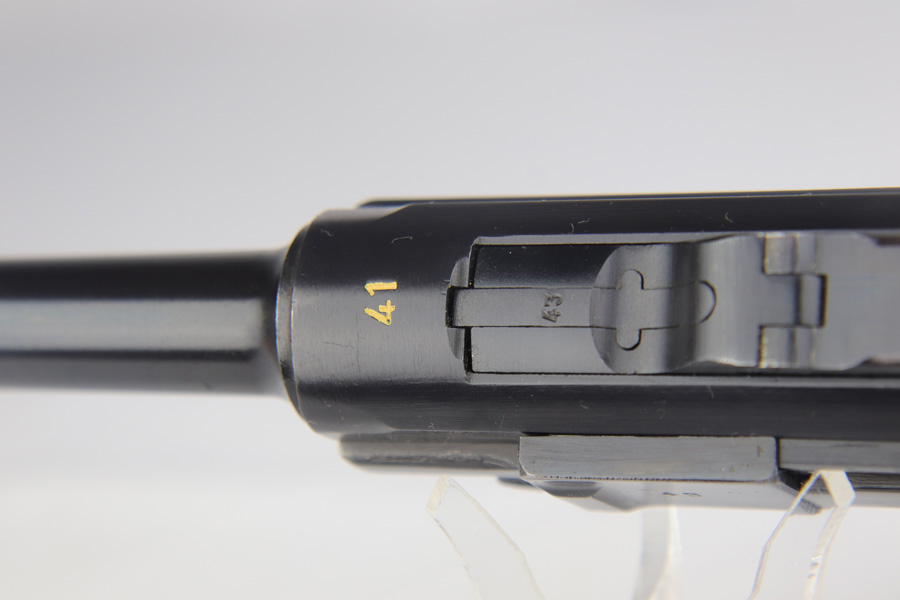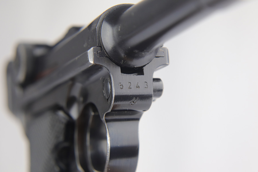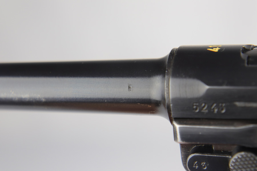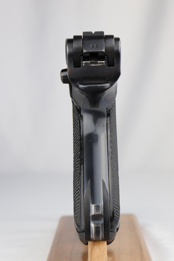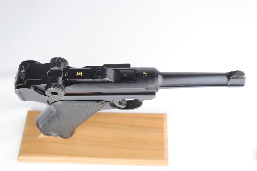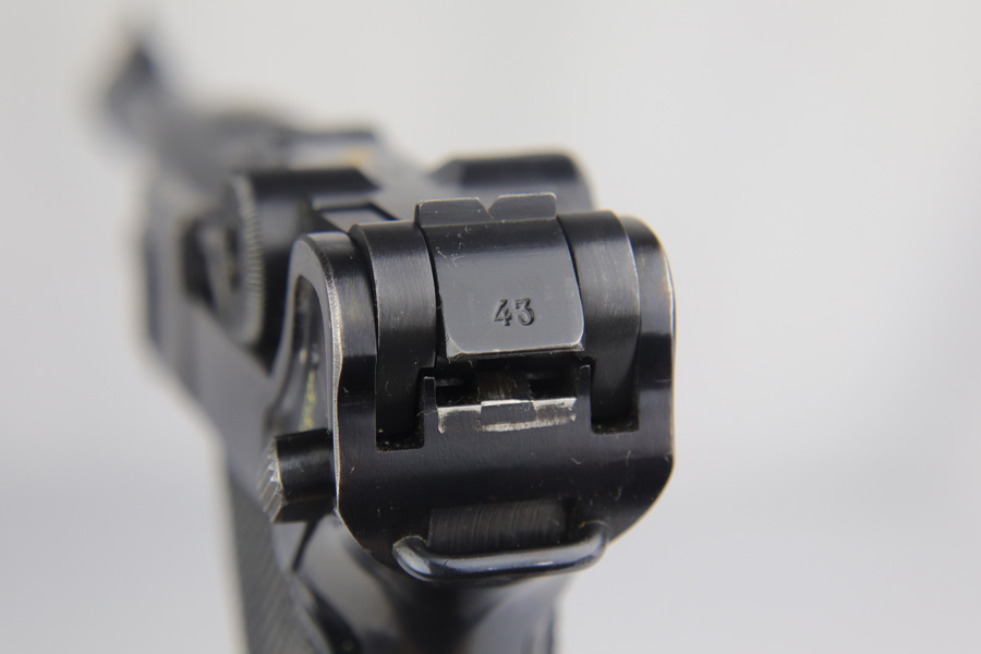 2/7/19 – This is a fantastic Black Widow Mauser Luger from 1941 in all matching and original condition. The original blue rates at about 98% with minor muzzle wear and light rub wear on the side plate and rails. There’s also a couple small spots of pinpricking on the rails. Excellent Black Widow style grips and magazine. Terrific bore.