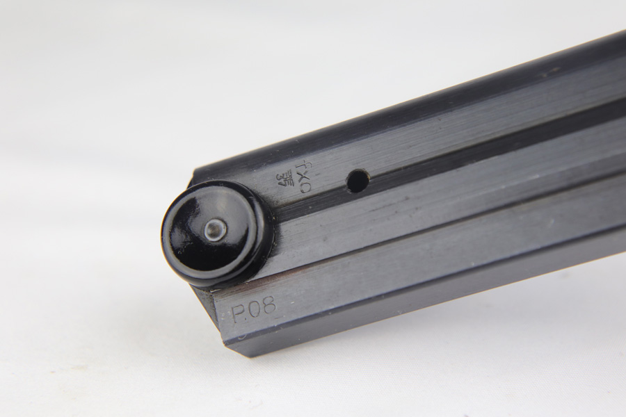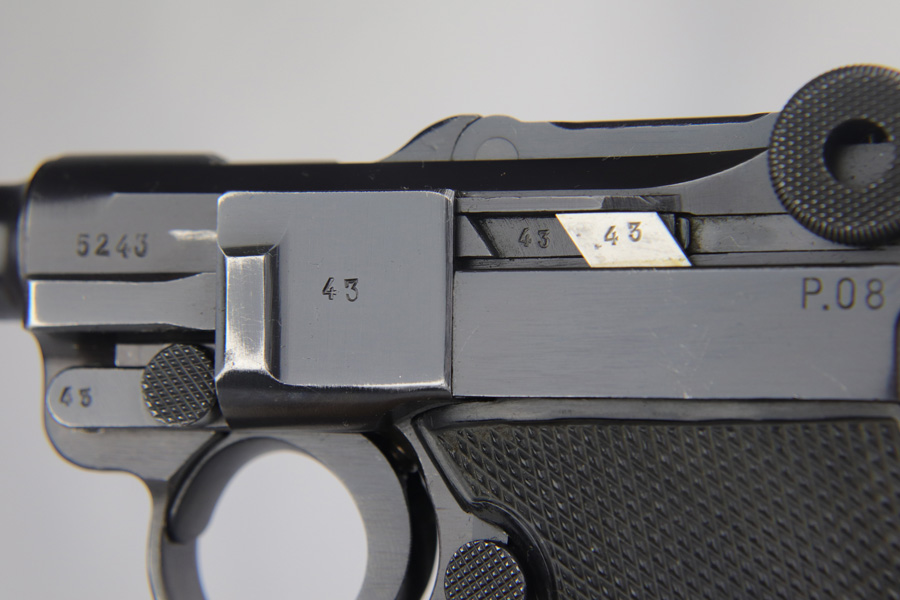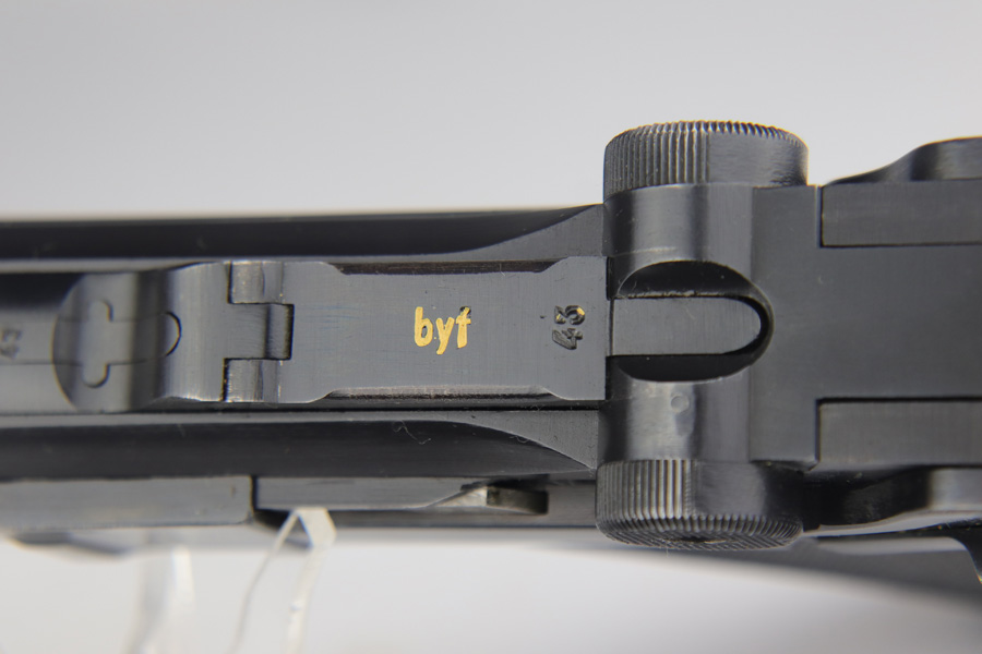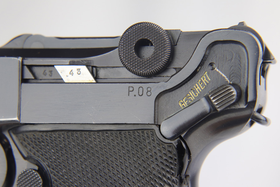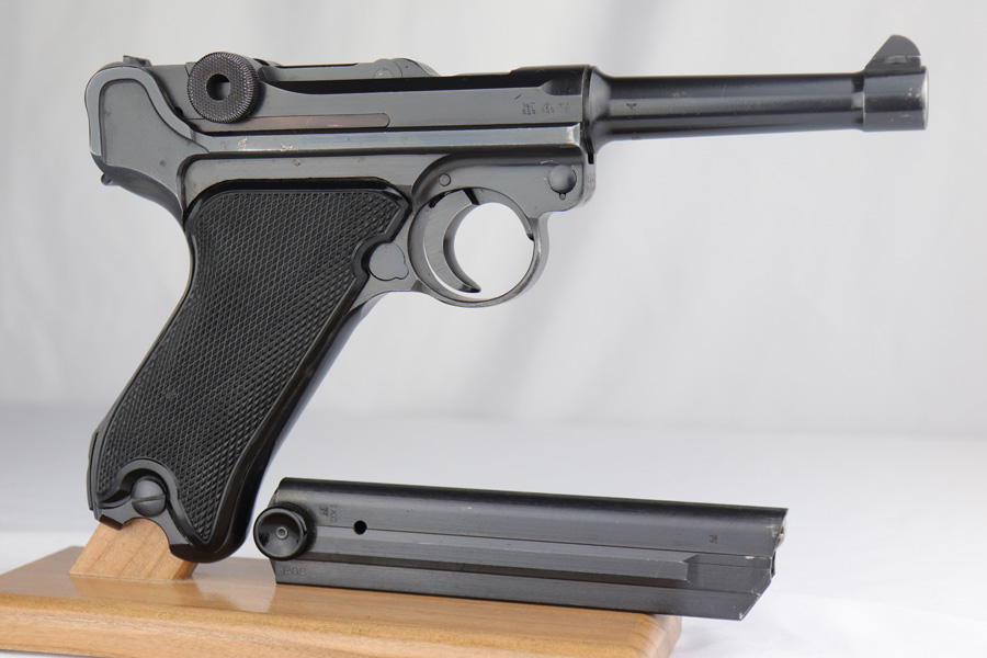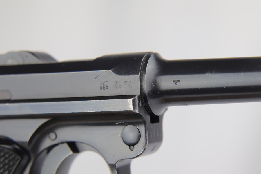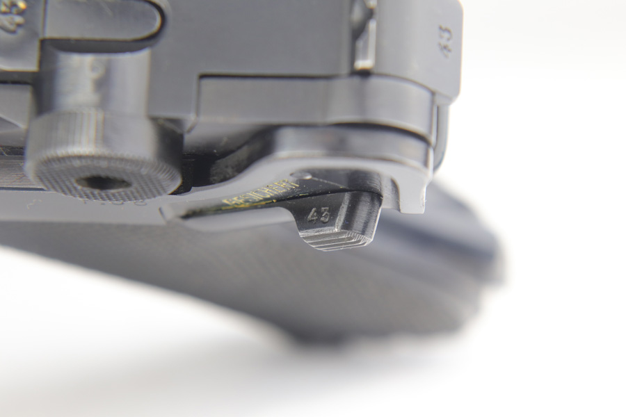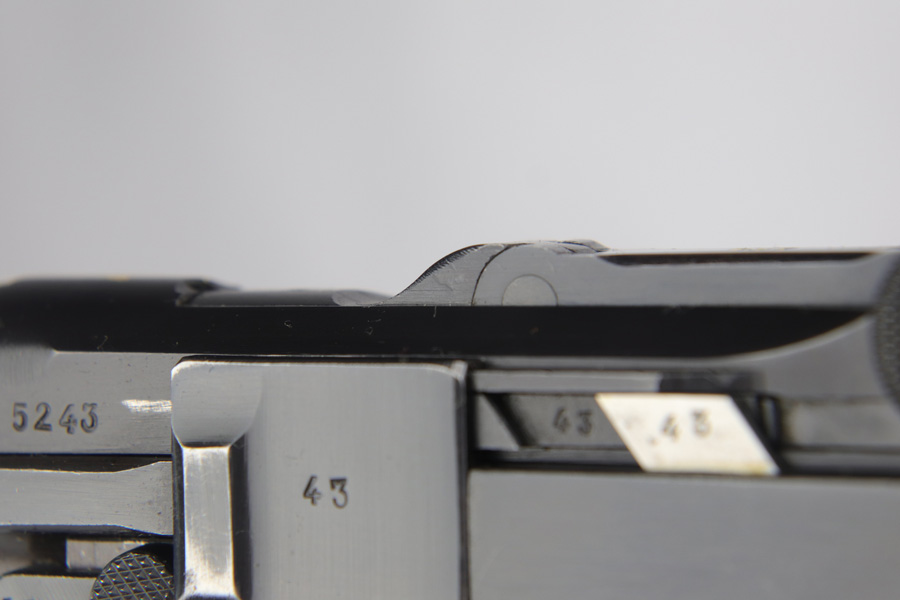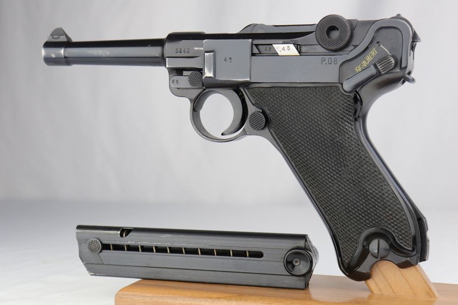 2/7/19 – This is a fantastic Black Widow Mauser Luger from 1941 in all matching and original condition. The original blue rates at about 98% with minor muzzle wear and light rub wear on the side plate and rails. There’s also a couple small spots of pinpricking on the rails. Excellent Black Widow style grips and magazine. Terrific bore.