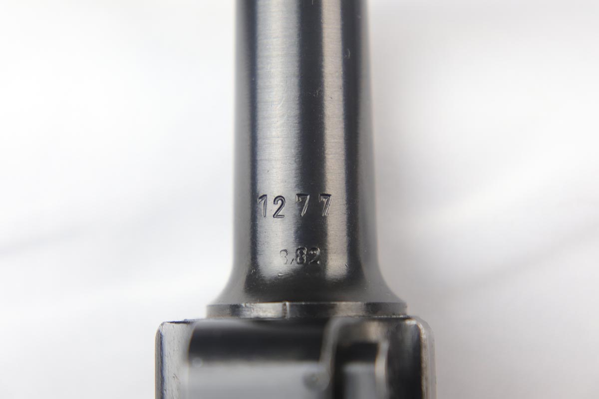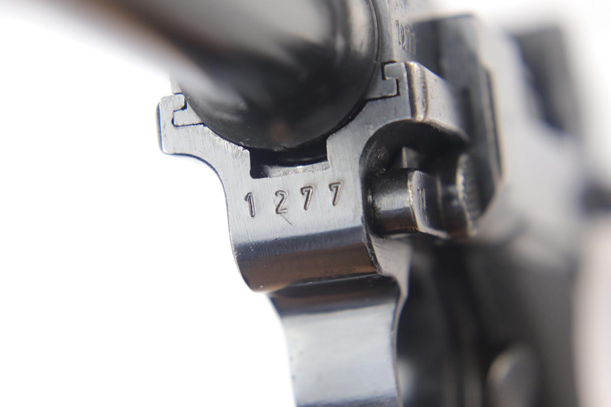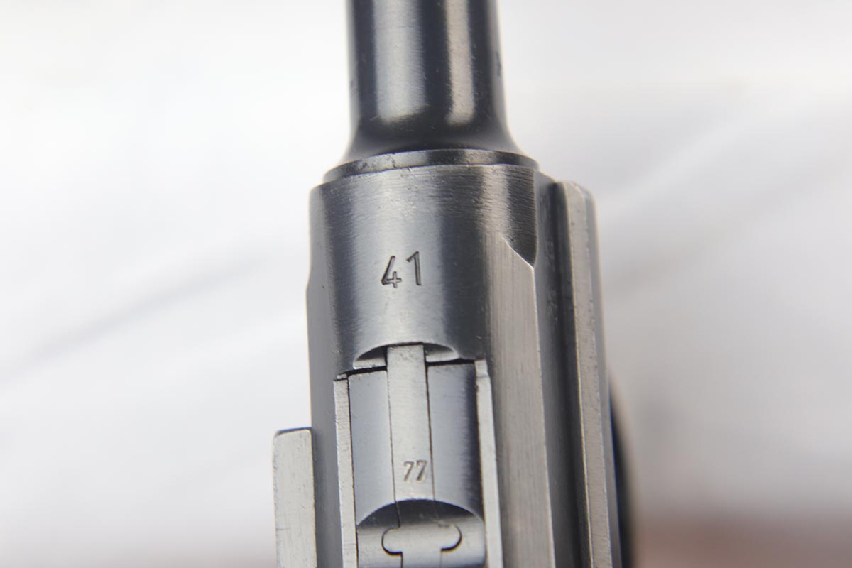 5/24/19 – This is a terrific example of an all original and matching Black Widow Mauser Luger from 1941. Original blue rates at 97-98% with minor edge wear and a spot of finish loss on the bottom of each strap. Excellent grips with only minor age/handling wear. Very nice magazine, though it’s a little tight in the gun. Bore is shiny with strong rifling, but minor frost.