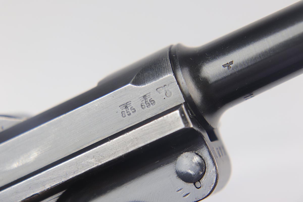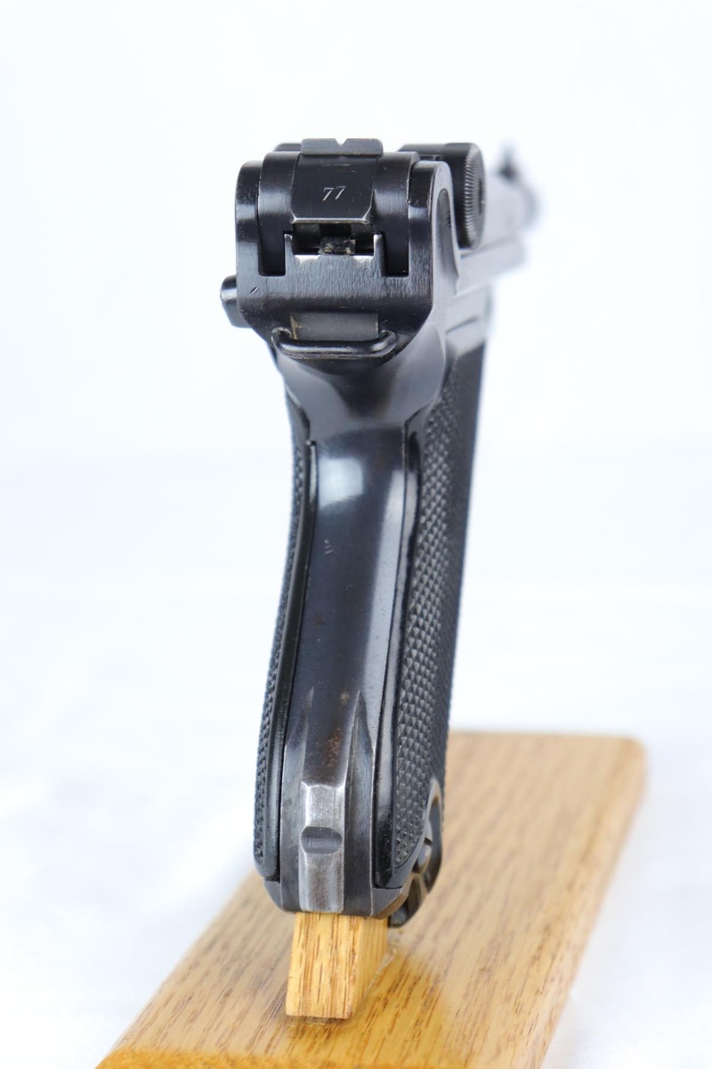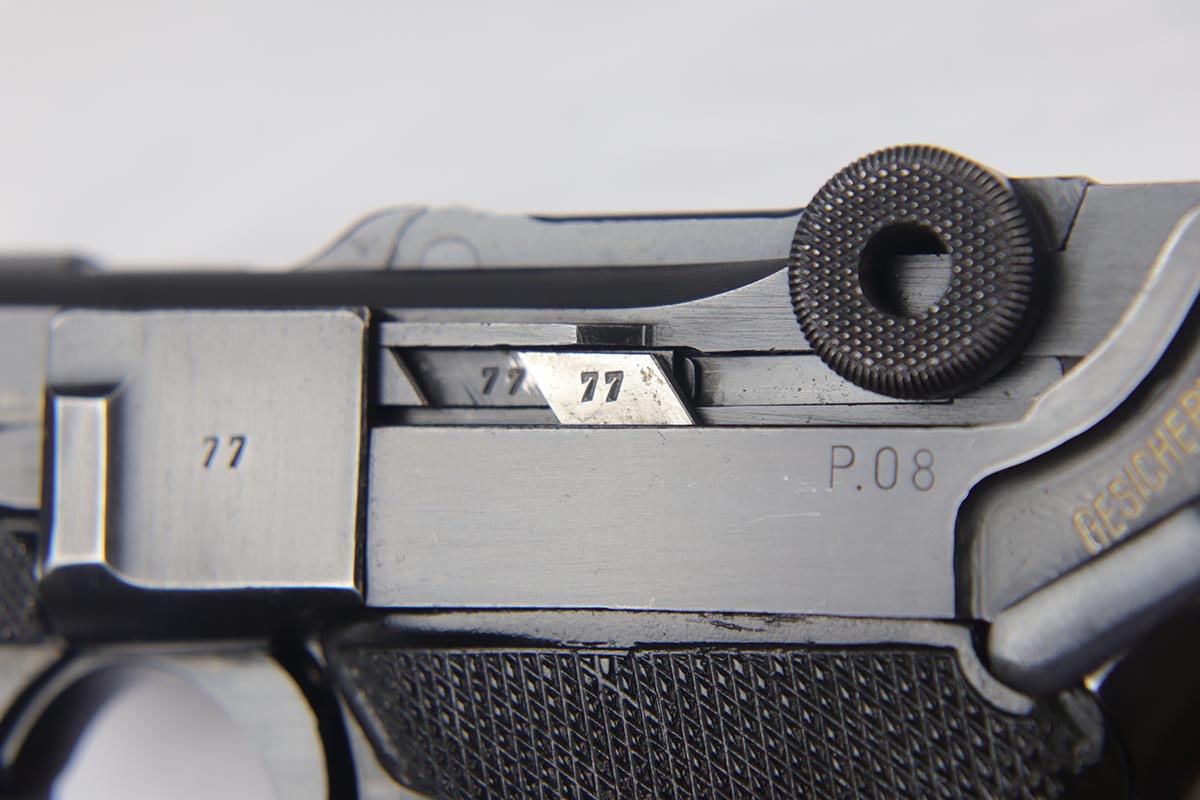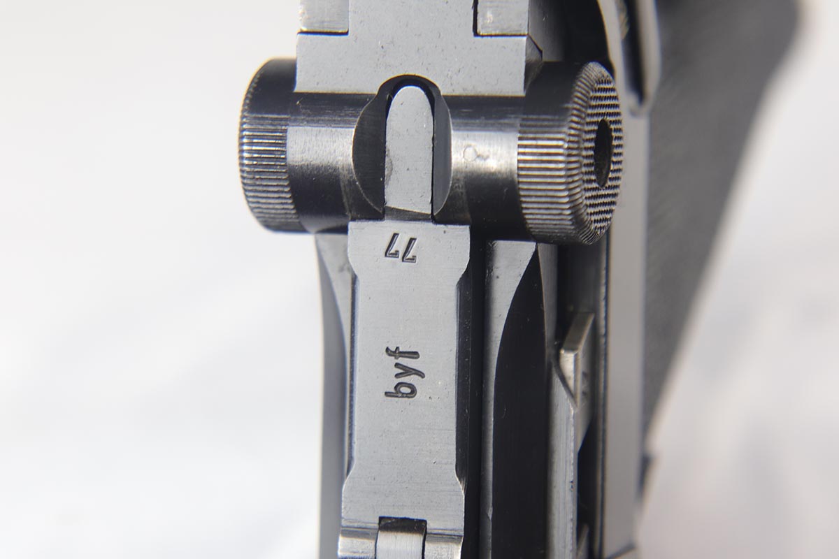 5/24/19 – This is a terrific example of an all original and matching Black Widow Mauser Luger from 1941. Original blue rates at 97-98% with minor edge wear and a spot of finish loss on the bottom of each strap. Excellent grips with only minor age/handling wear. Very nice magazine, though it’s a little tight in the gun. Bore is shiny with strong rifling, but minor frost.