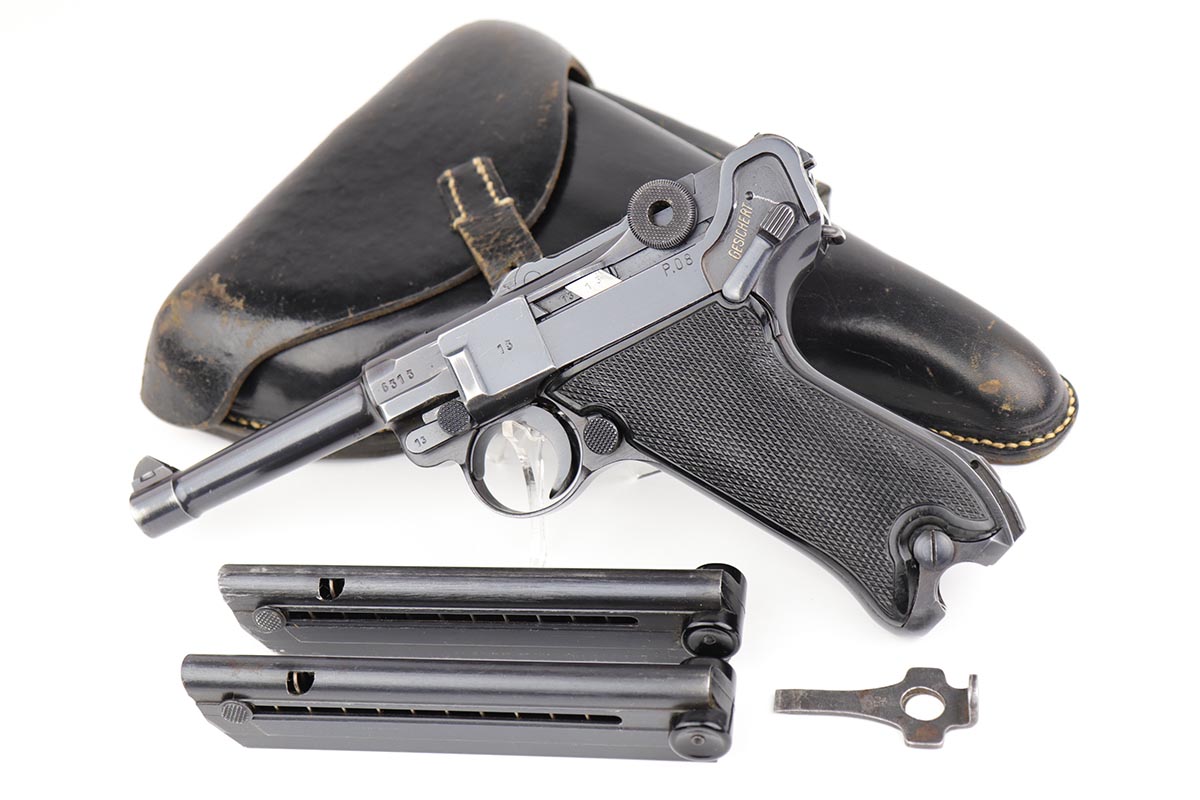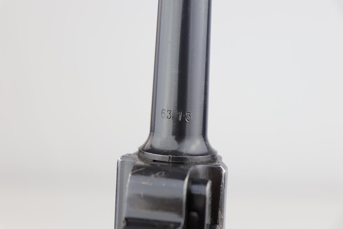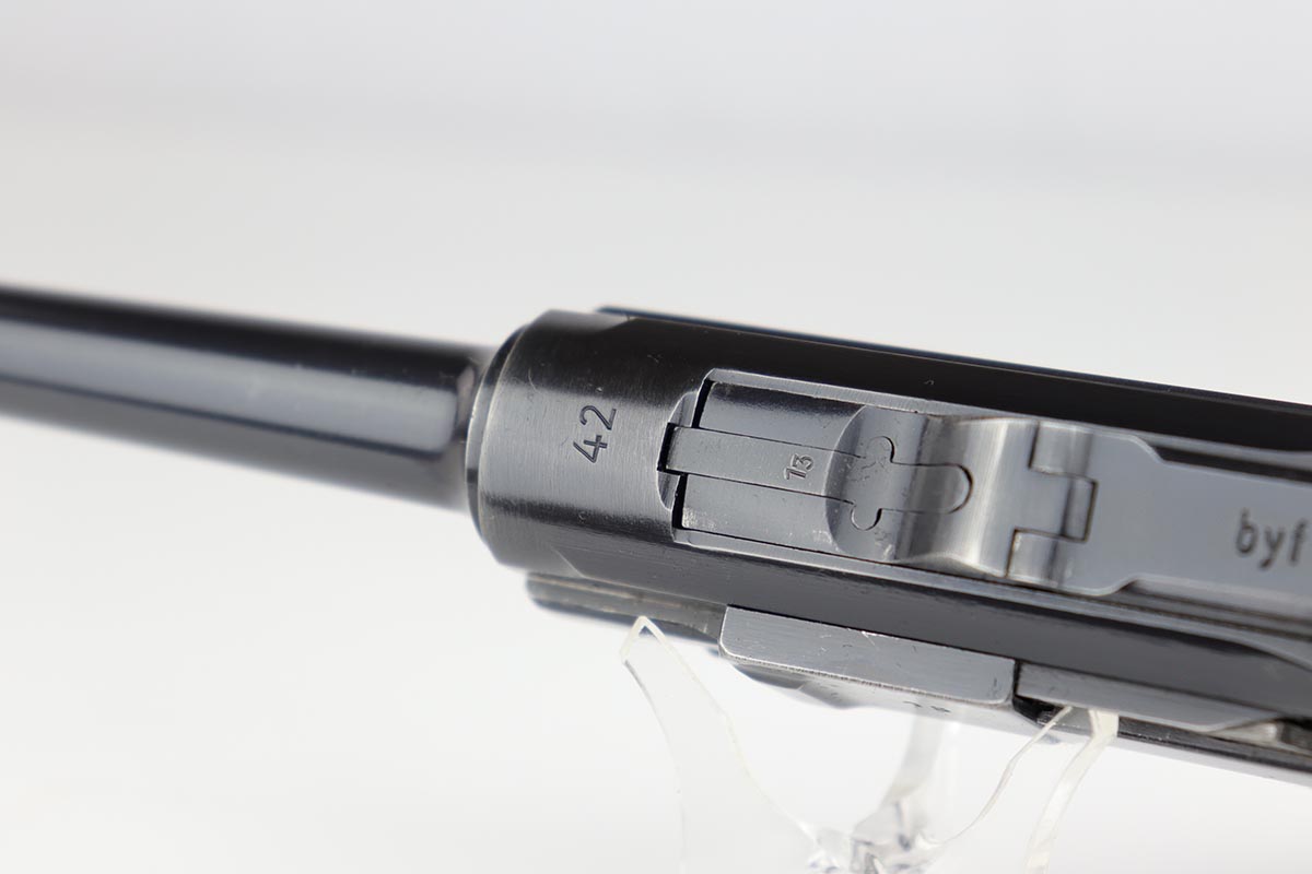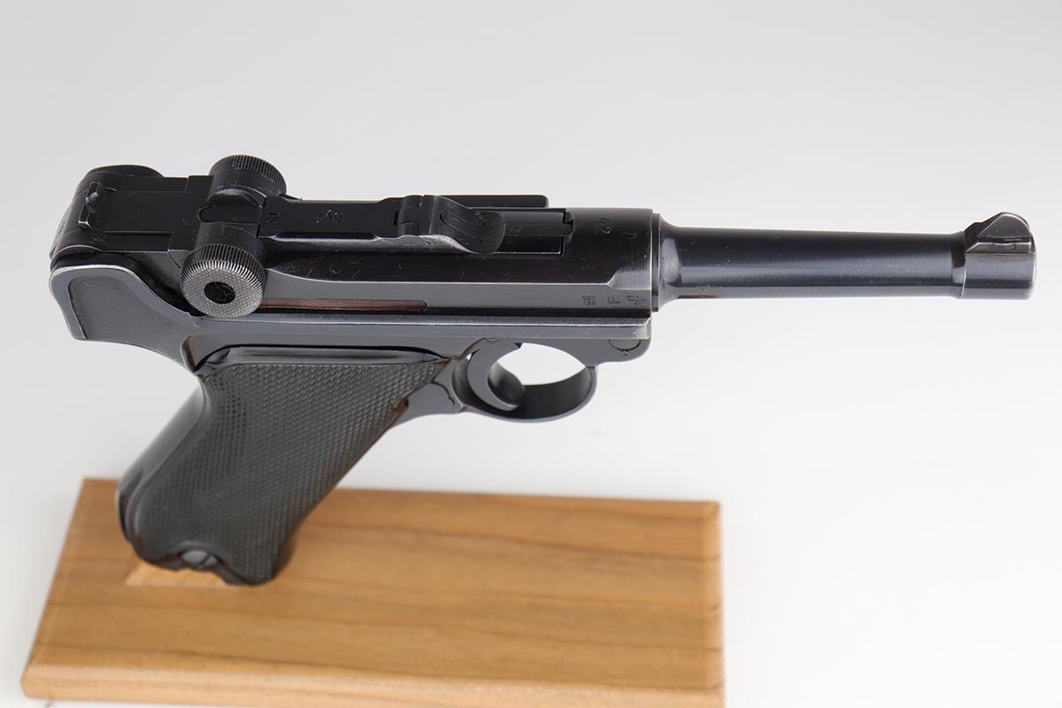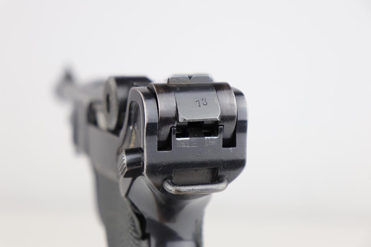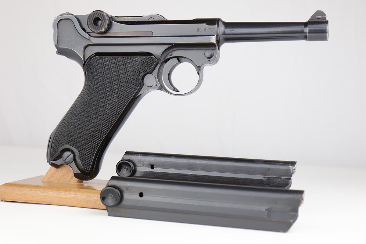5/12/20 – This is a fantastic example of a complete and original Black Widow Mauser Luger rig from 1942. The pistol is all matching and correct with 97% lustrous blue remaining, showing only basic edge wear from the holster. Minty bore, and terrific Black Widow style grips. The rig includes two total Black Widow style magazines, both in excellent condition. Original tool is present, with Eagle over 655 proof. The rig is completed by an excellent black holster, with sharp waffenamt, maker code and 1941 date.