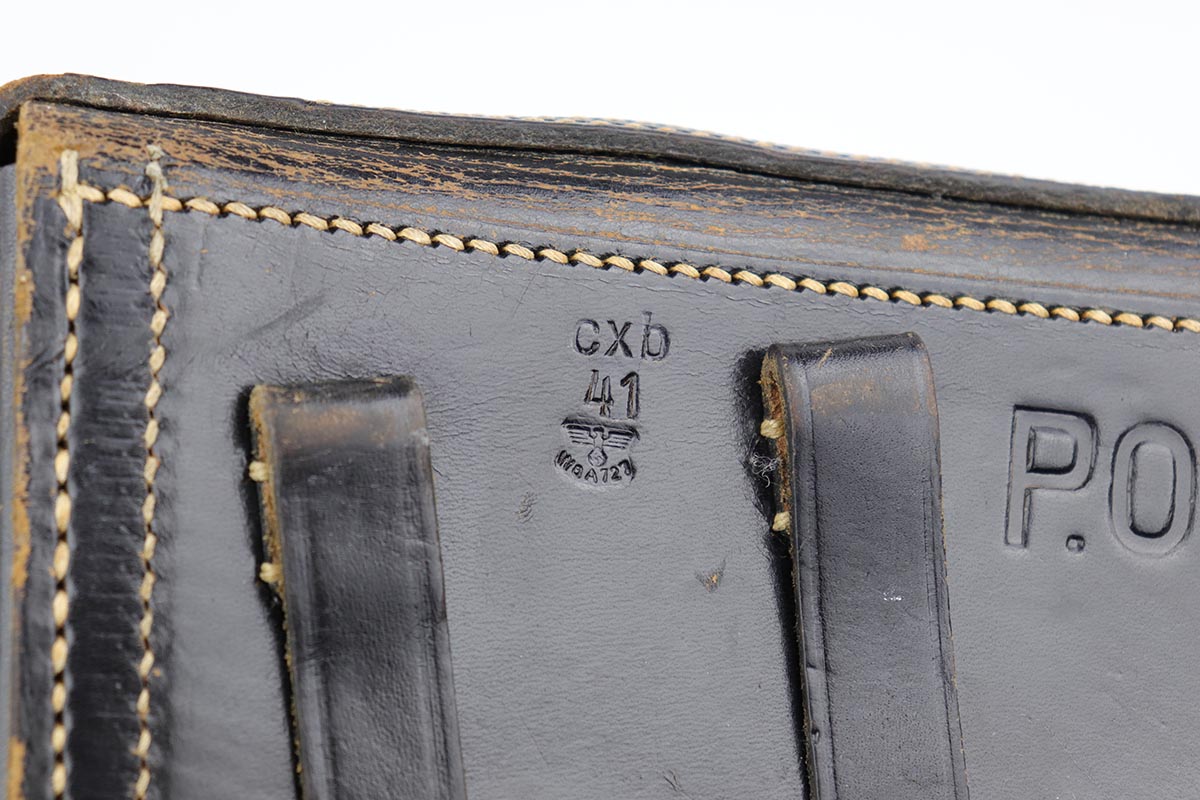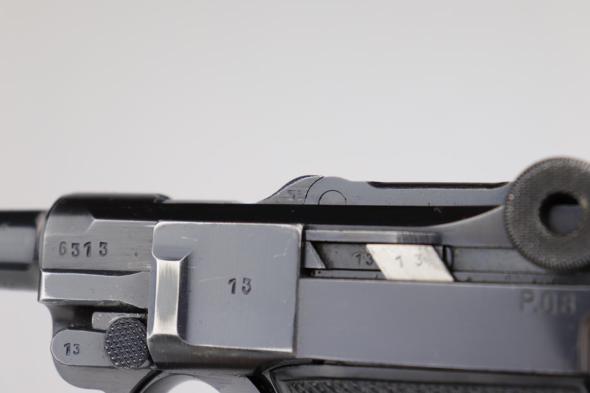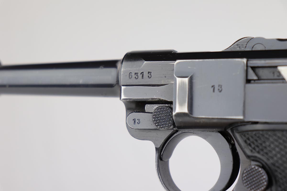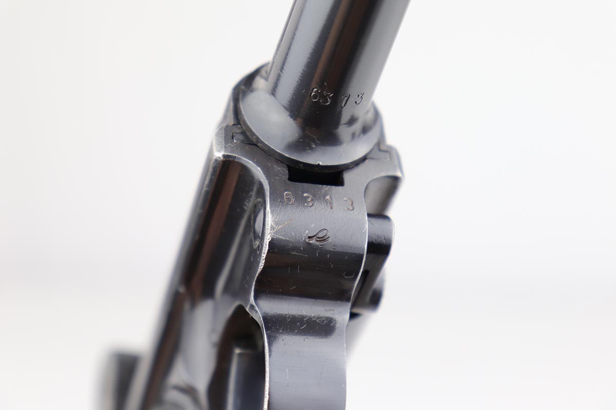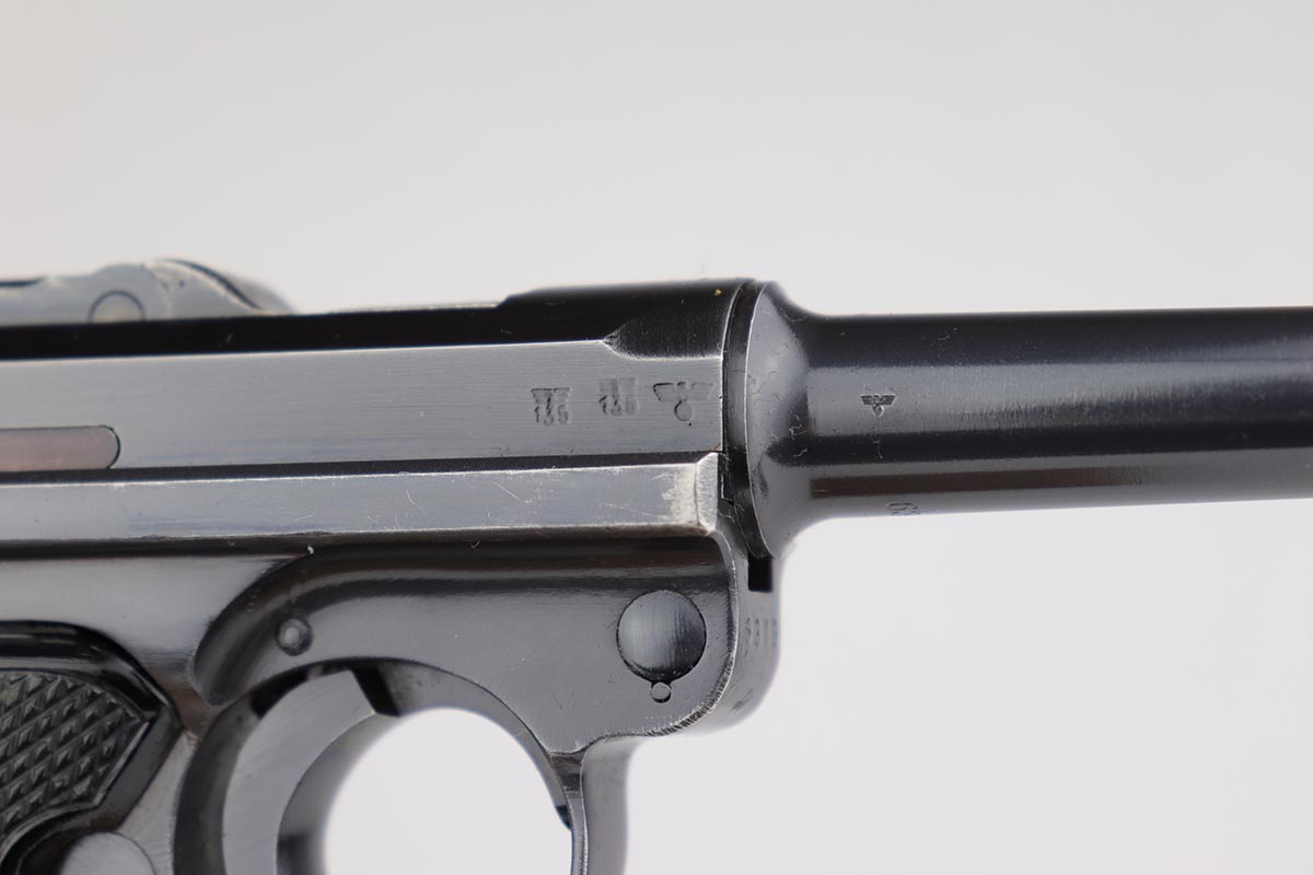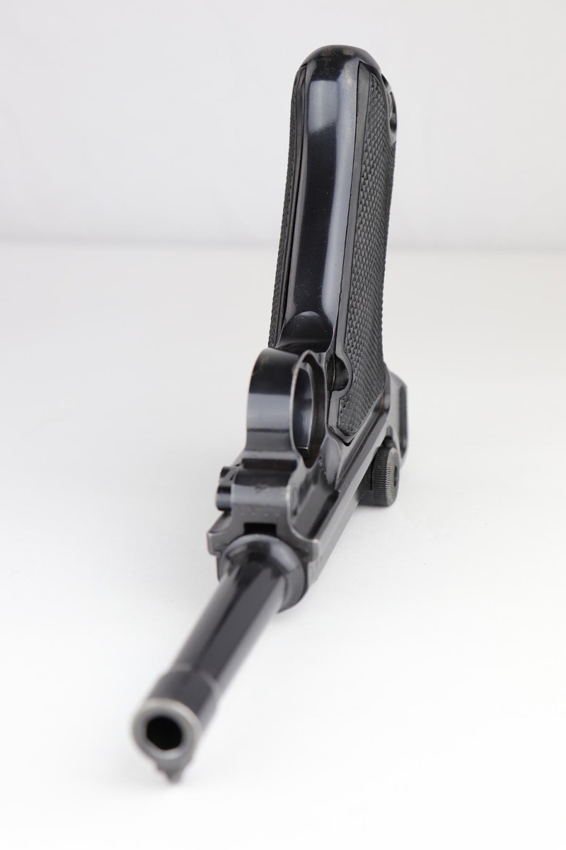 5/12/20 – This is a fantastic example of a complete and original Black Widow Mauser Luger rig from 1942. The pistol is all matching and correct with 97% lustrous blue remaining, showing only basic edge wear from the holster. Minty bore, and terrific Black Widow style grips. The rig includes two total Black Widow style magazines, both in excellent condition. Original tool is present, with Eagle over 655 proof. The rig is completed by an excellent black holster, with sharp waffenamt, maker code and 1941 date.