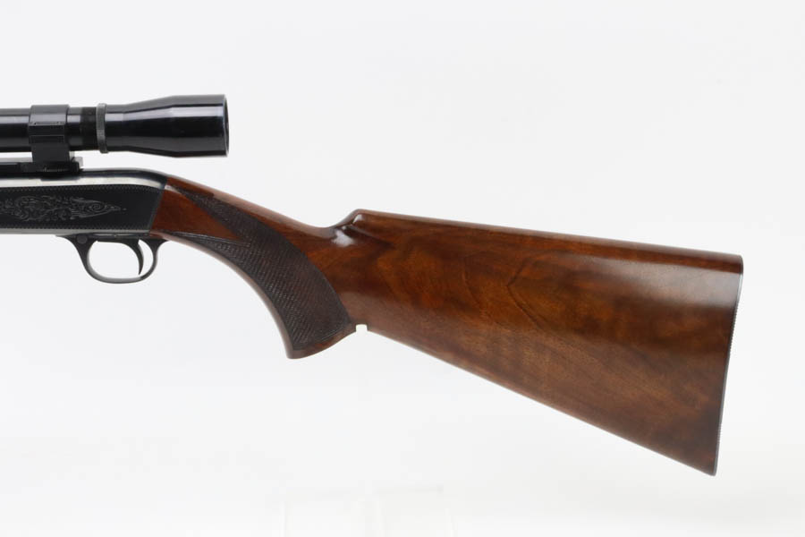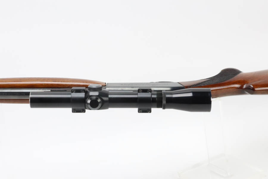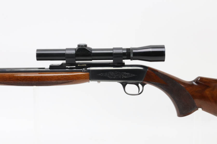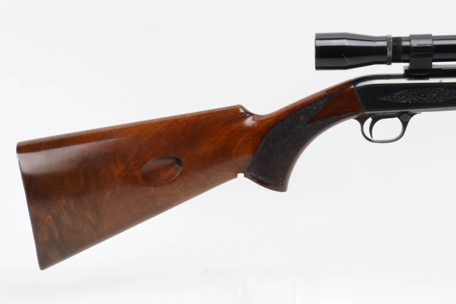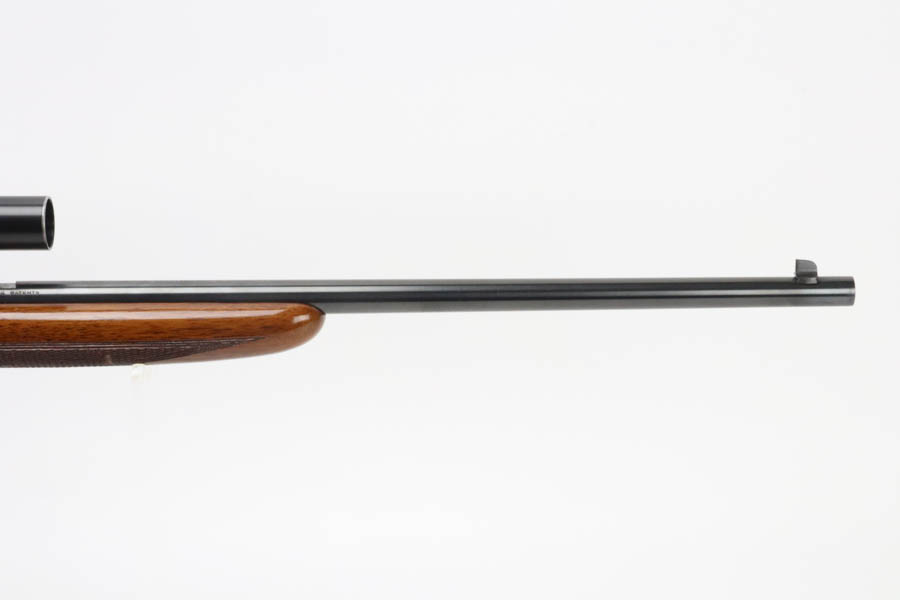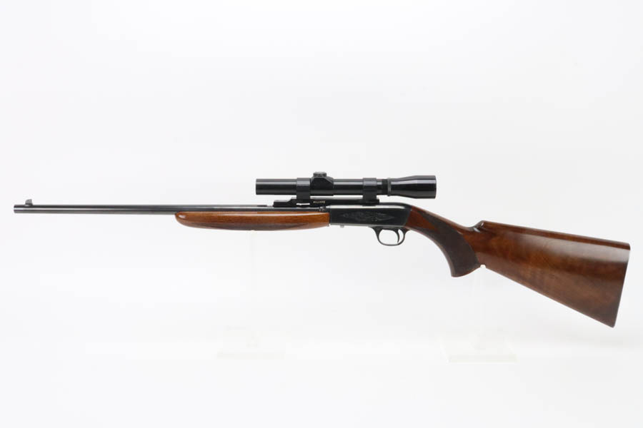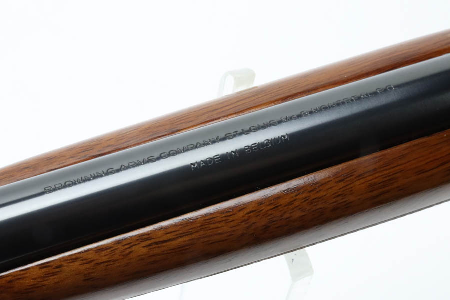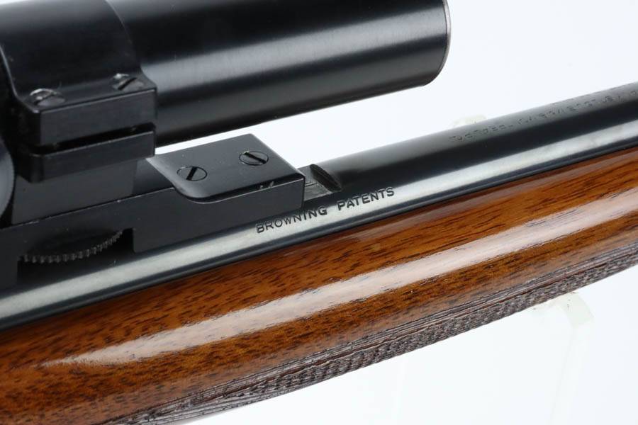 09/04/204 – For sale is a gorgeous Belgian Browning SA-22 rifle made in 1963. The rifle has an excellent high polish bluing with a simple floral engraving on the receiver. The wood furniture is excellent with no cracks. There is a very small chip missing on the right side of the stock at the buttplate. The bore is mirror bright with excellent rifling. The rifle comes equipped with a Lyman All-American optic.