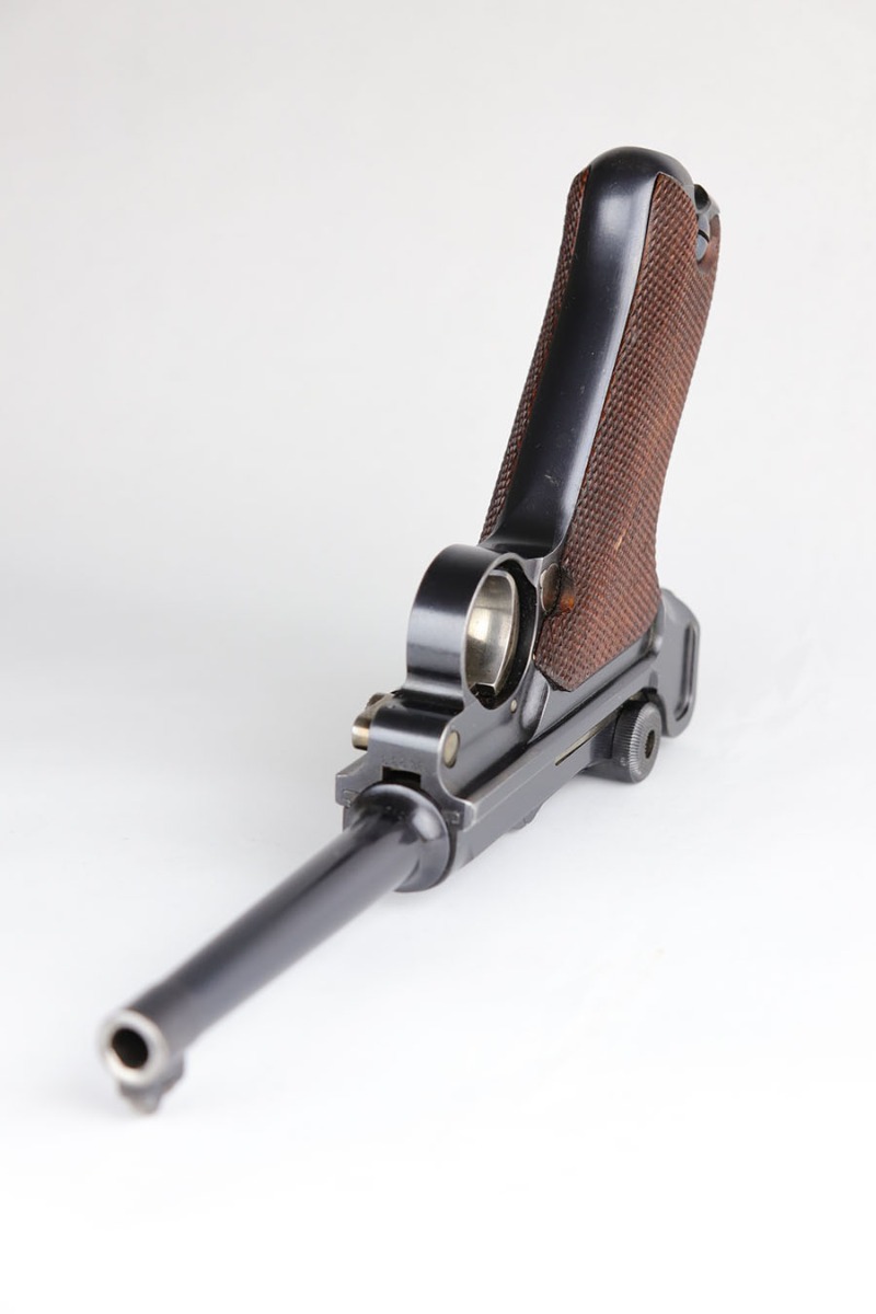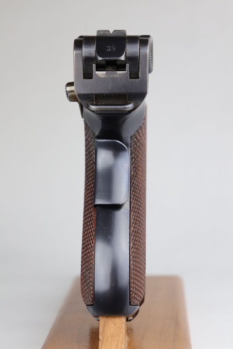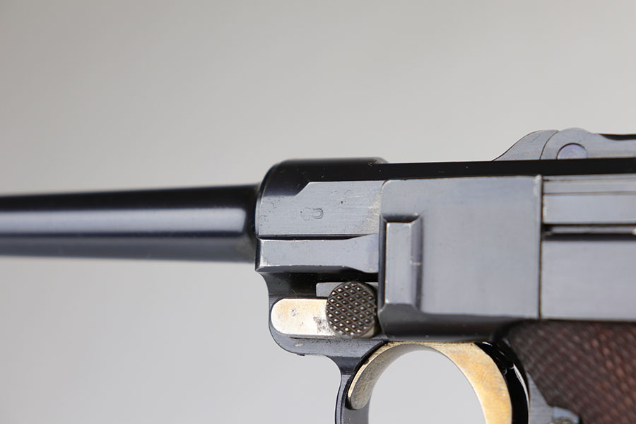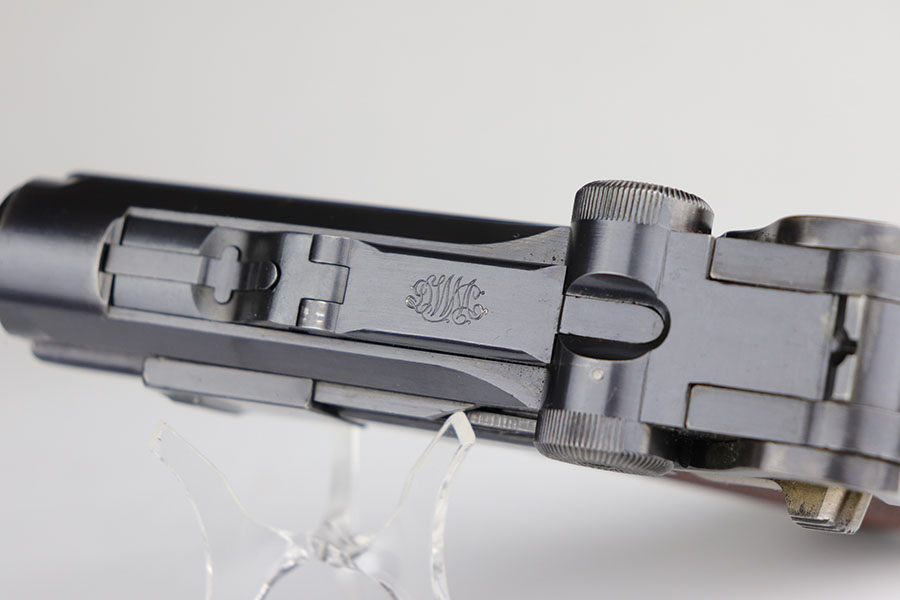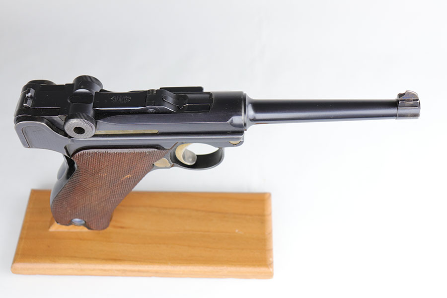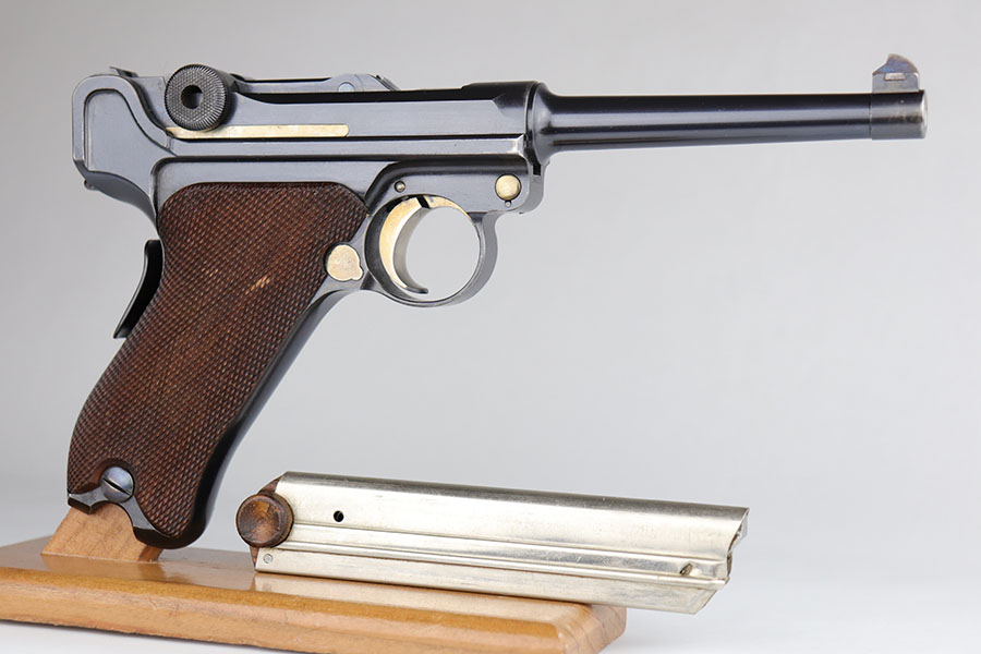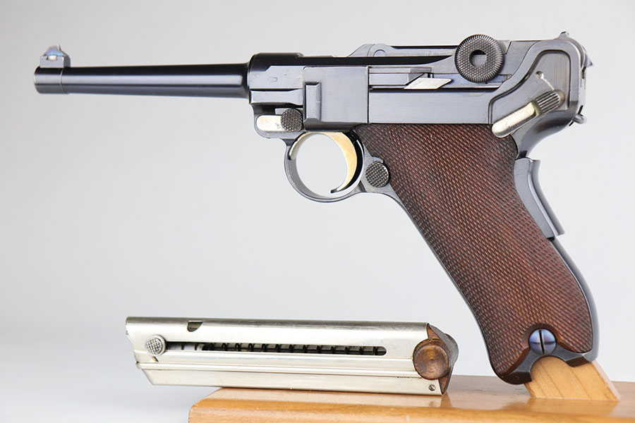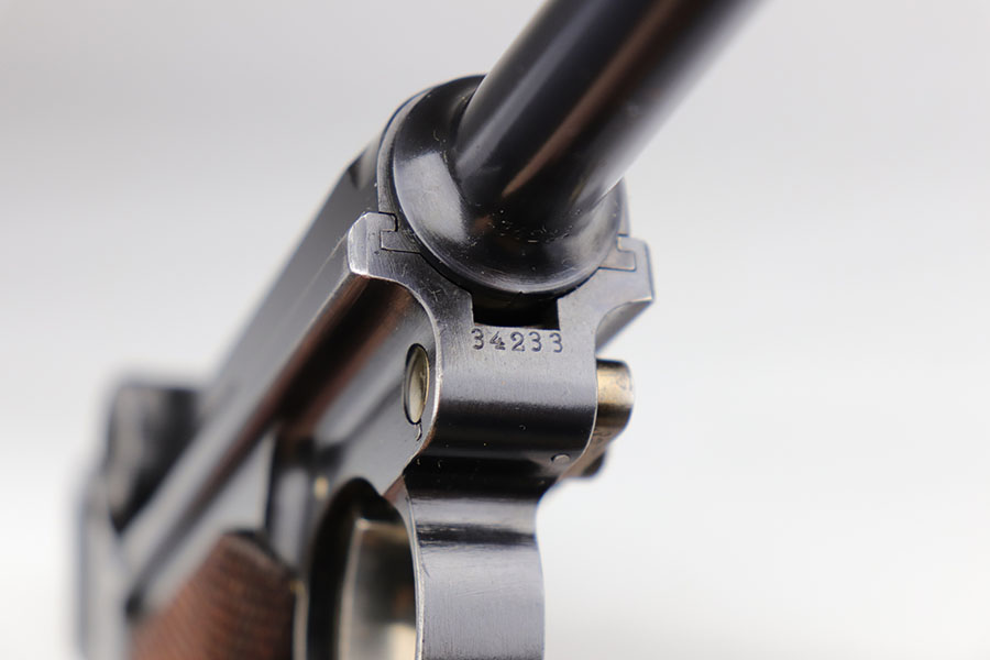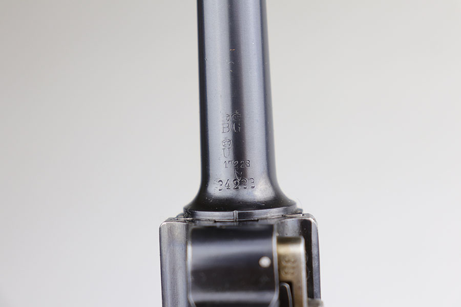 6/16/20 – This is a near-mint example of a commercial DWM Model 1906 Luger from before the Great War. It has 98-99% of the original blue, with just a tiny bit of muzzle and high edge wear. There were only about 5,000 of this specific variation produced in .30 Luger and with a 4.5 inch barrel. It has Crown BUG proofs under barrel and BU on receiver. All matching numbers with excellent original straw. Minty bore. Sharply checkered grips with just a couple of small scrapes on the right panel. No import or export marks.
