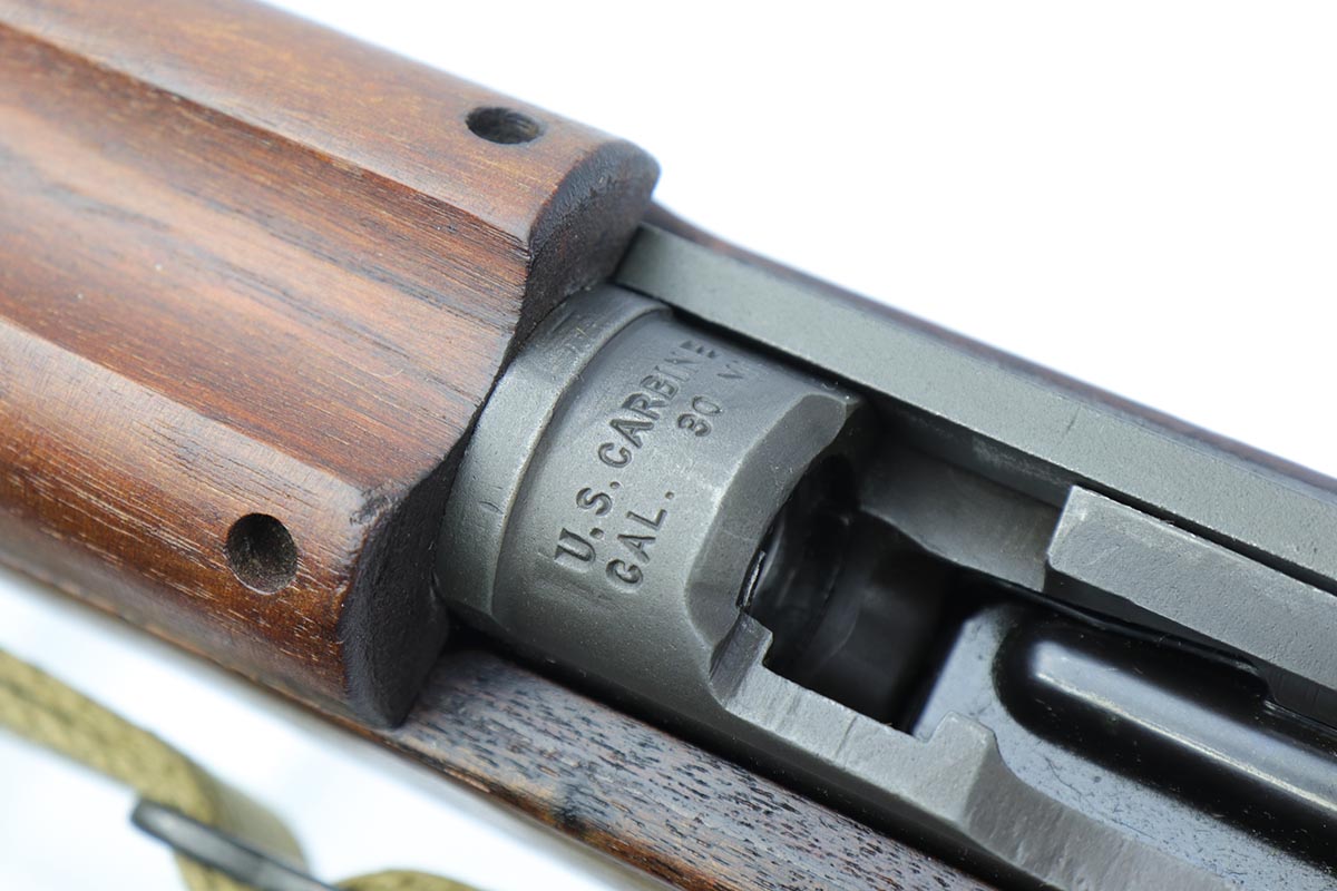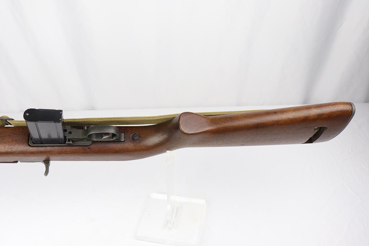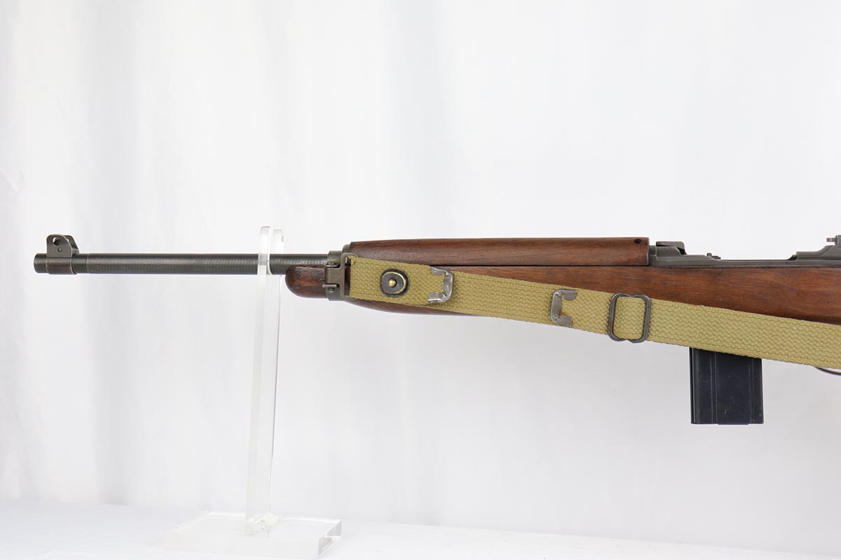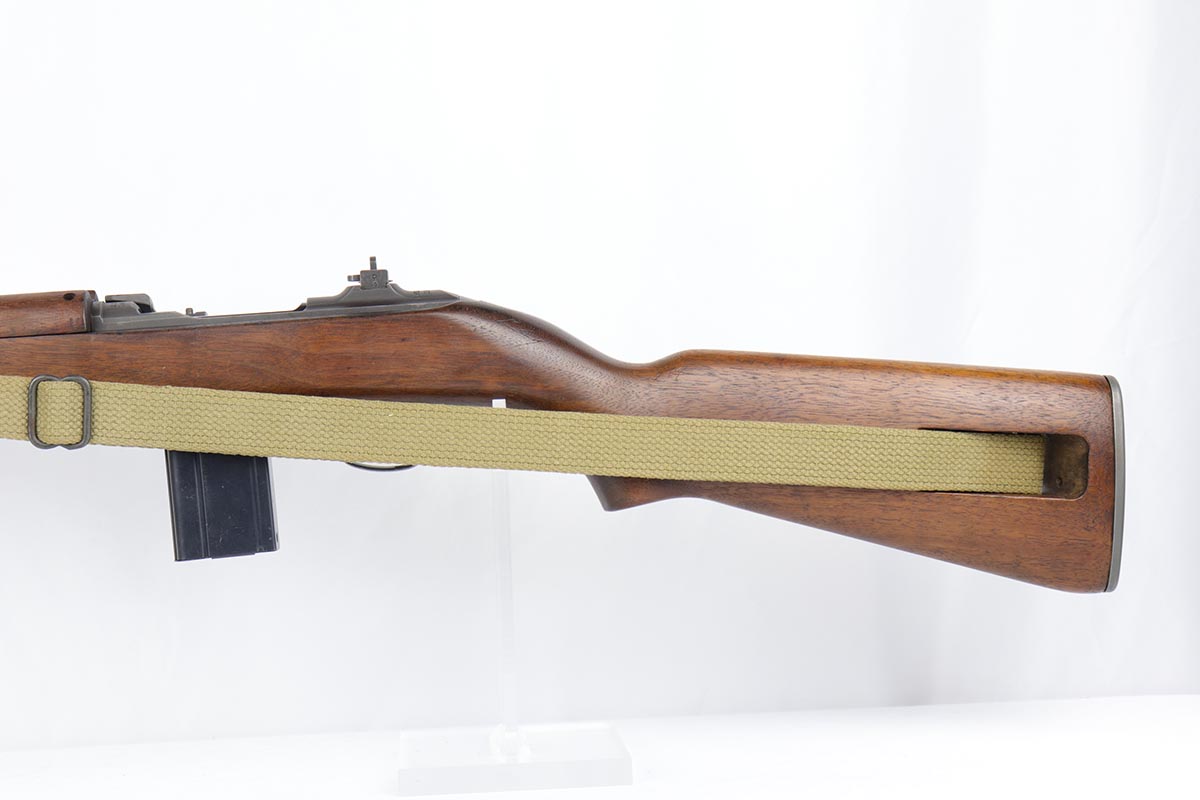 2/28/19 – This is an excellent and early example of an Inland manufactured M1 Carbine. Made in December of 1942, the finish on metal parts is original and rates in the high 90s with just minor thinning on the barrel. Early, six digit serial. High wood, I-cut stock. Original slide. Minty bore. Excellent stock with crossed cannons cartouche on right side. The sling cut is marked but it’s tough to make out the proof mark. Handguard marked IO internally.