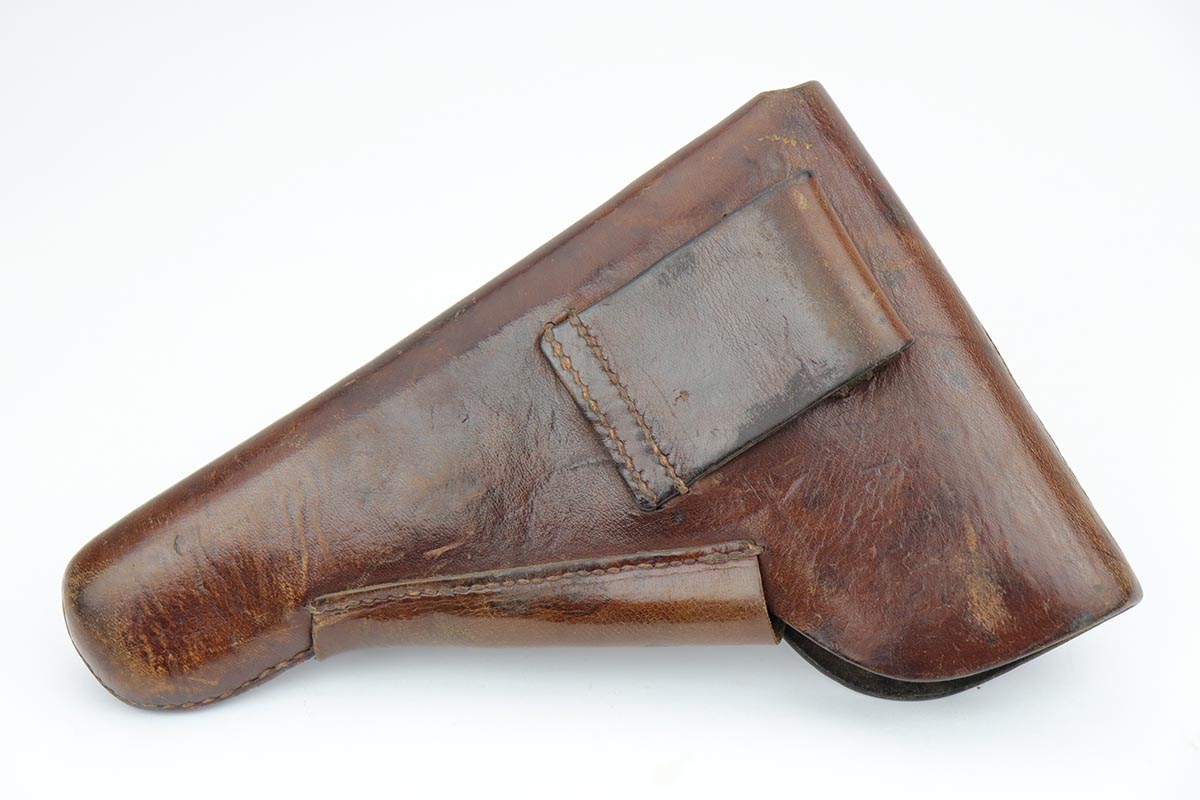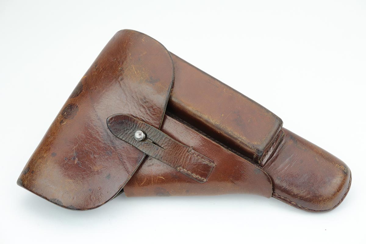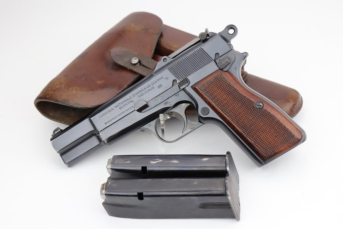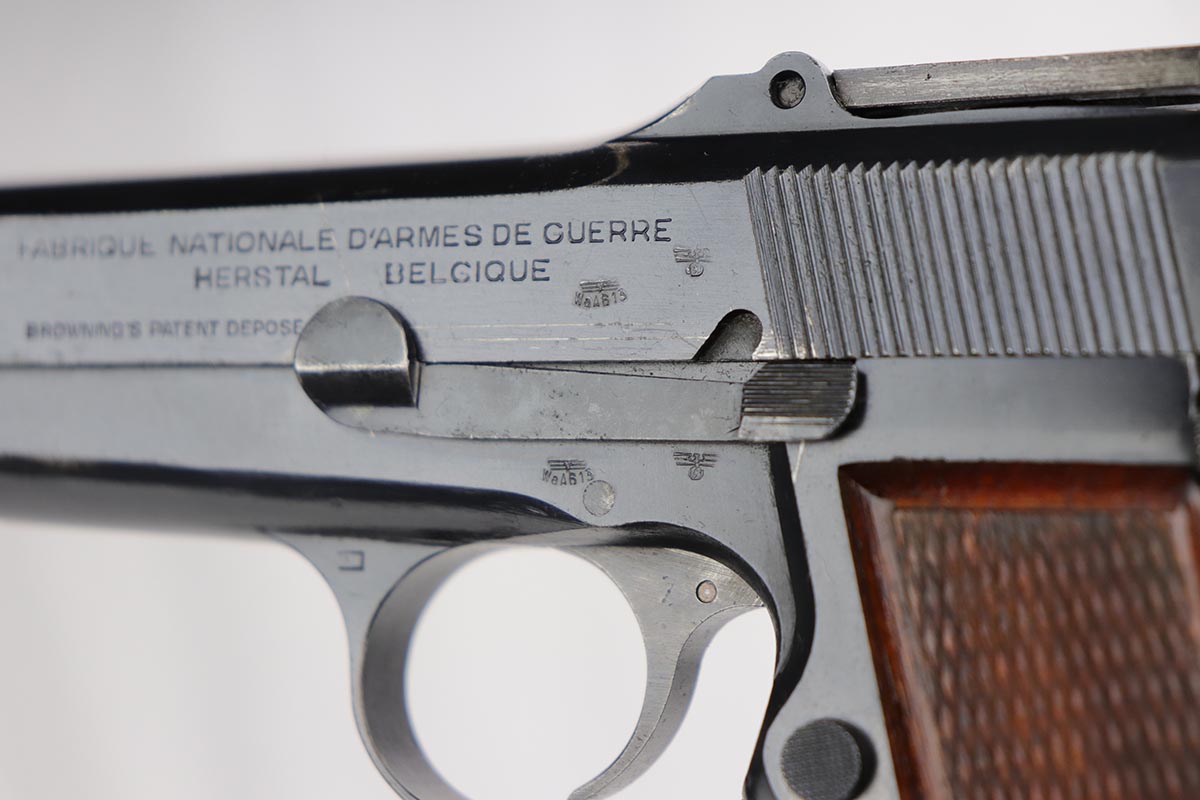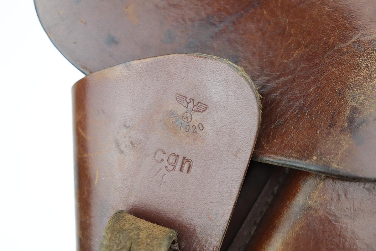 10/11/19 – This is a fantastic example of a scarce and desirable Nazi pistol. It is an FN Browning Hi Power with tangent sight, and comes with original holster and spare magazine. The gun itself has about 96-97% of the original blue, with high point wear from the holster, and an area of finish loss on the trigger guard. Beautiful straps and terrific wood grips. Both magazines are wartime original but have no waffenamts. The holster is 1944 dated with sharp ‘cgn’ maker mark and crisp WaA920 proof. It’s got some obvious signs of age and wear but no holes or tears.