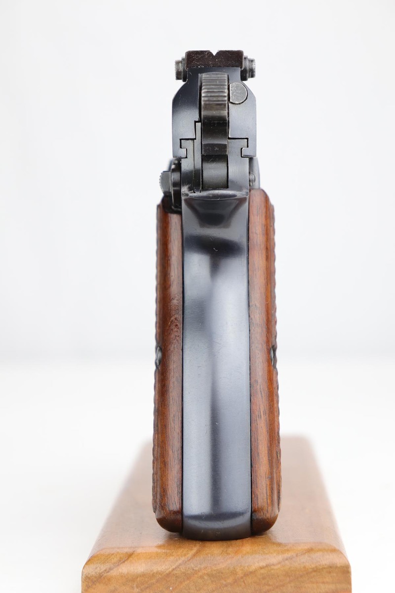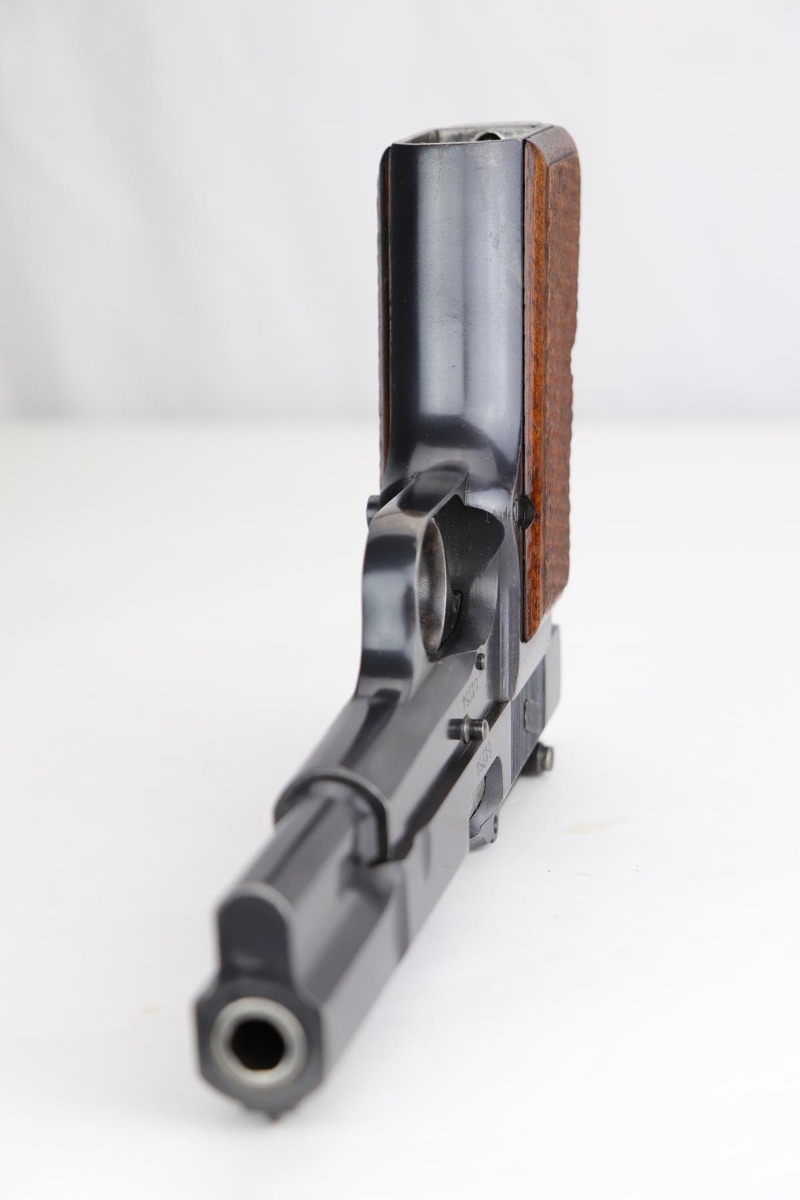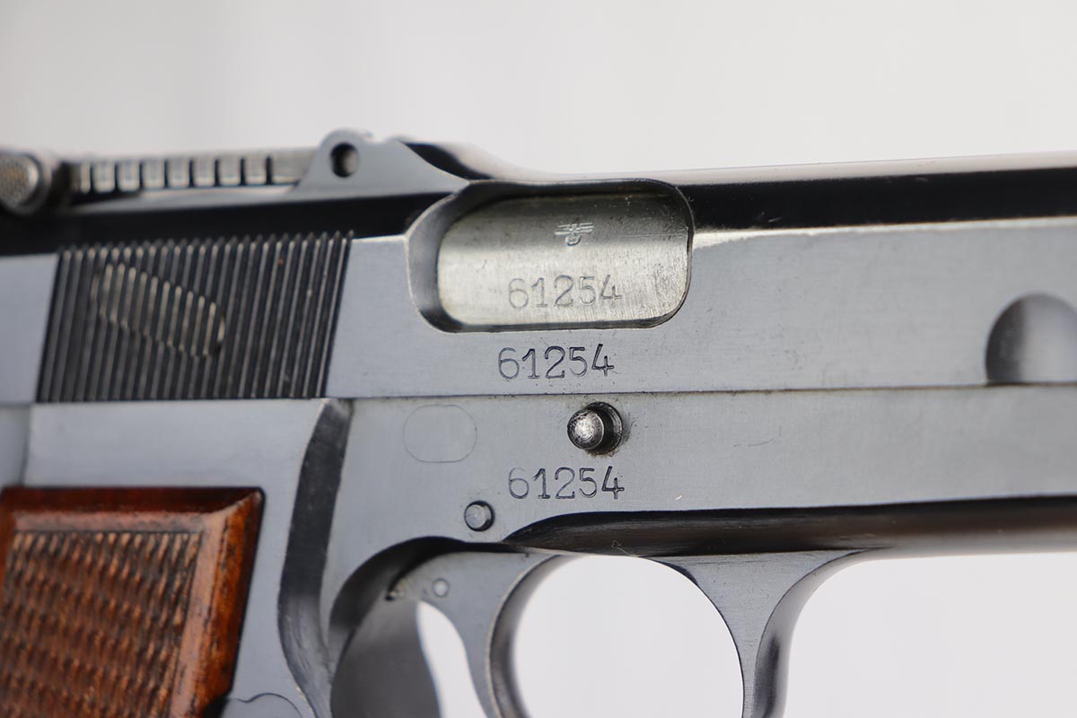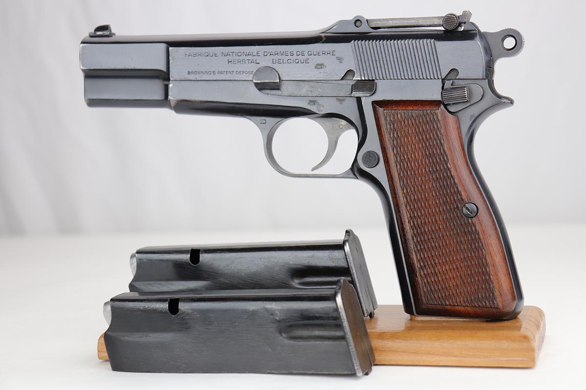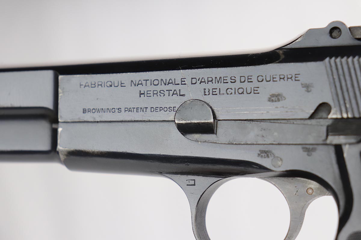 10/11/19 – This is a fantastic example of a scarce and desirable Nazi pistol. It is an FN Browning Hi Power with tangent sight, and comes with original holster and spare magazine. The gun itself has about 96-97% of the original blue, with high point wear from the holster, and an area of finish loss on the trigger guard. Beautiful straps and terrific wood grips. Both magazines are wartime original but have no waffenamts. The holster is 1944 dated with sharp ‘cgn’ maker mark and crisp WaA920 proof. It’s got some obvious signs of age and wear but no holes or tears.