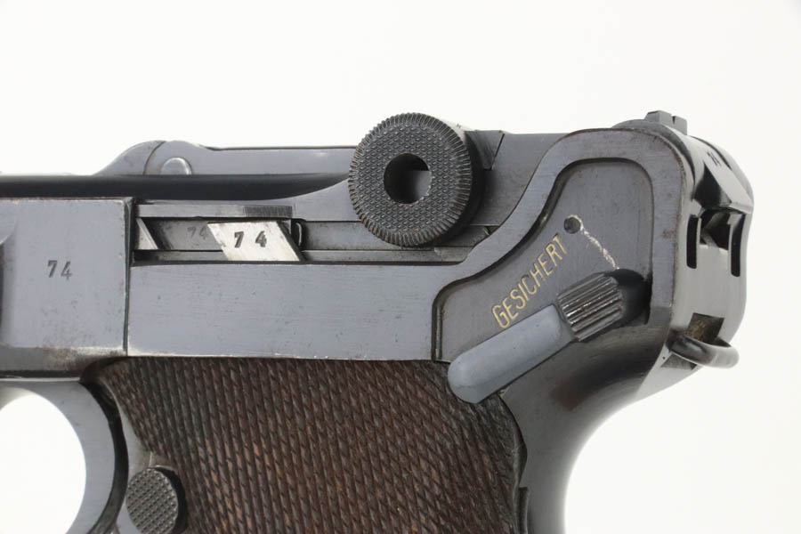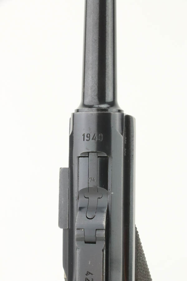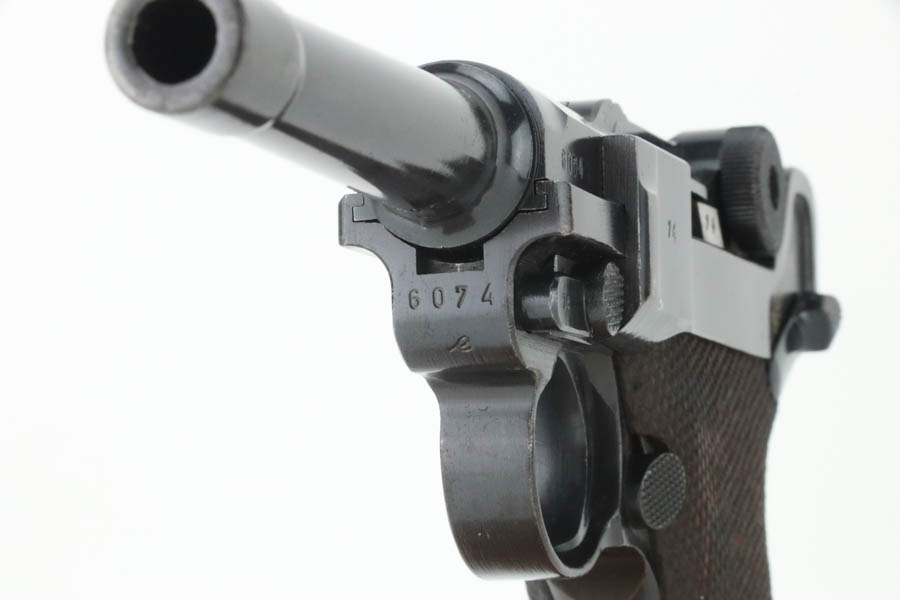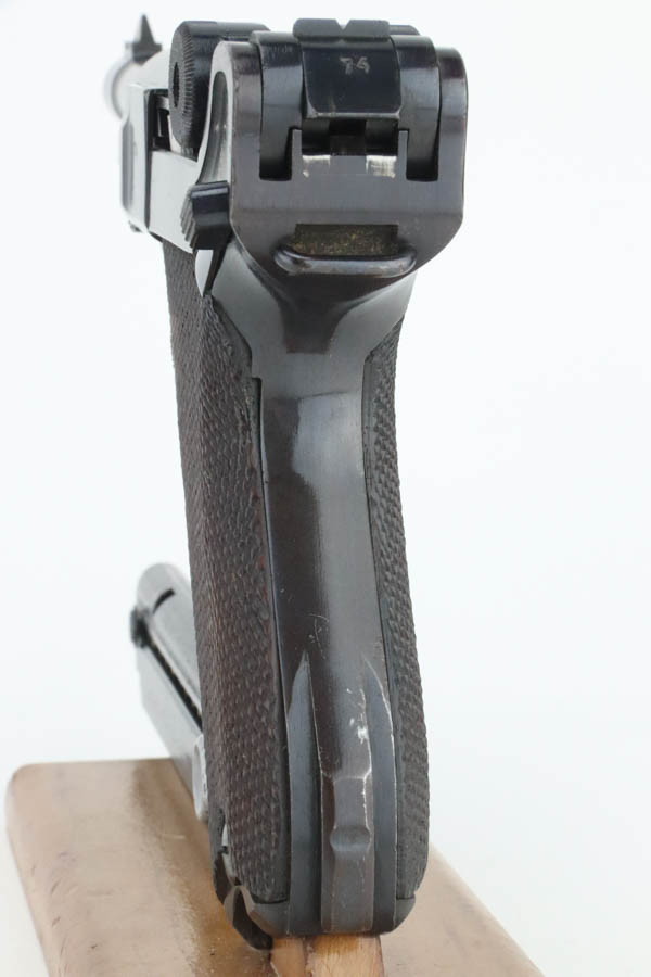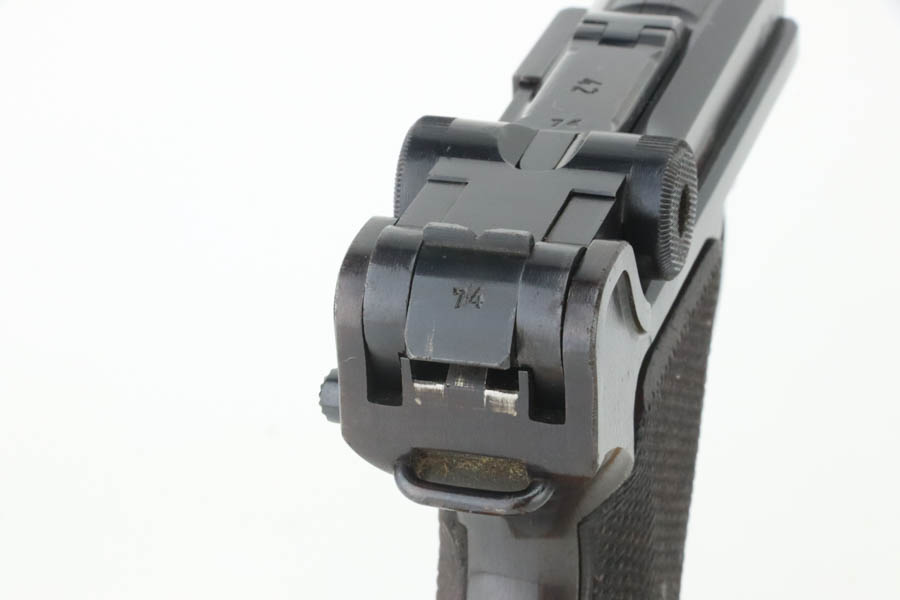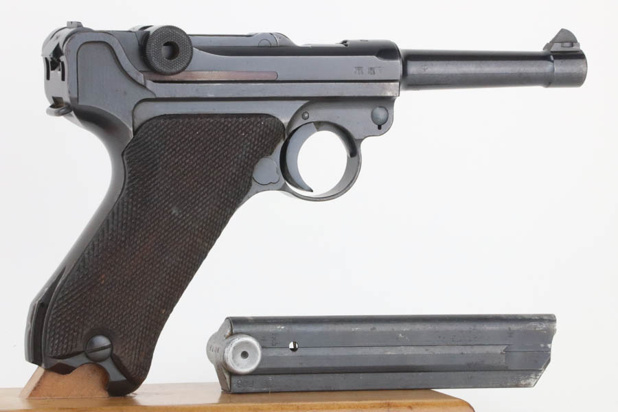 08/14/2024 – For sale is a P.08 Luger made by Mauser in 1940. The pistol is in fantastic condition surviving the war with the parts retaining a nice polished blued finish. There are some spots of freckling/oxidation visible on the finish but has not dulled the bluing on most of the parts. The most finish loss is on the side plate from rubbing against a holster and also towards the muzzle. The bore is bright with great rifling. The pistol itself is matching but has a period correct but mismatched magazine. The wood grips are not numbered but stamped Eagle/655 which is correct.