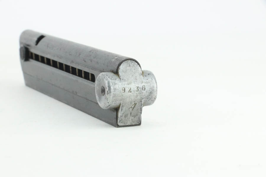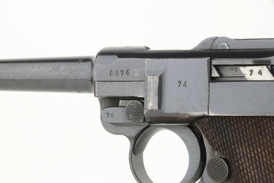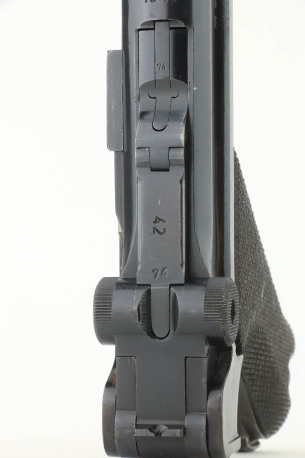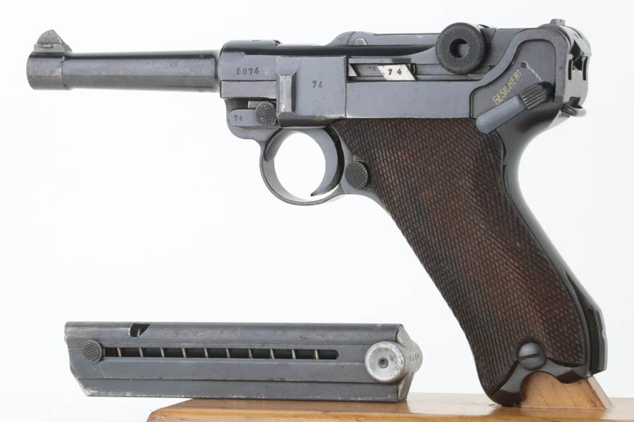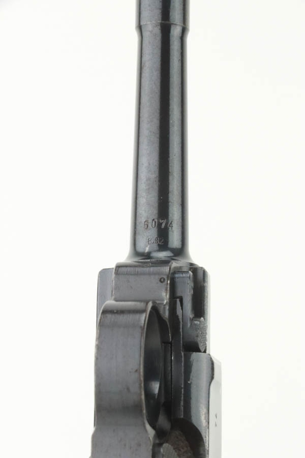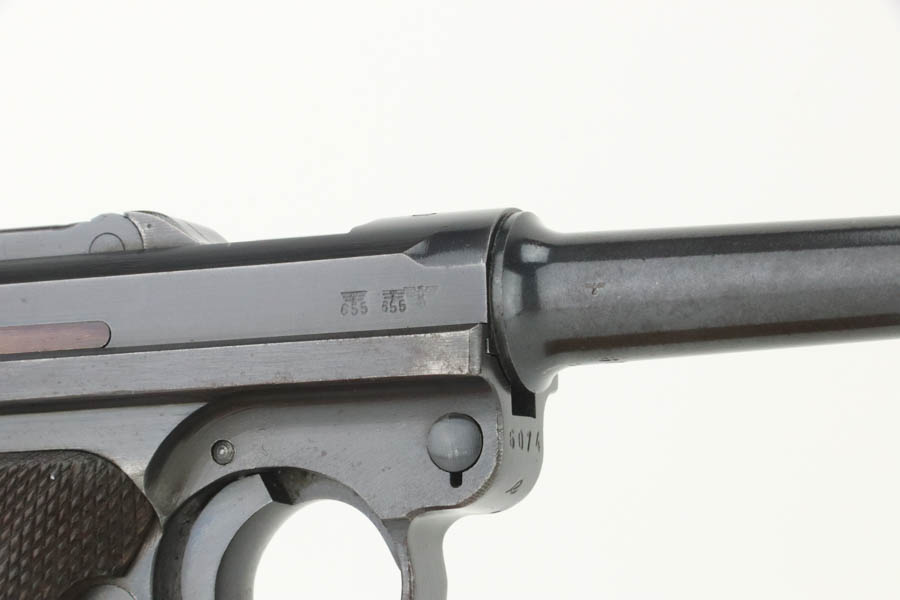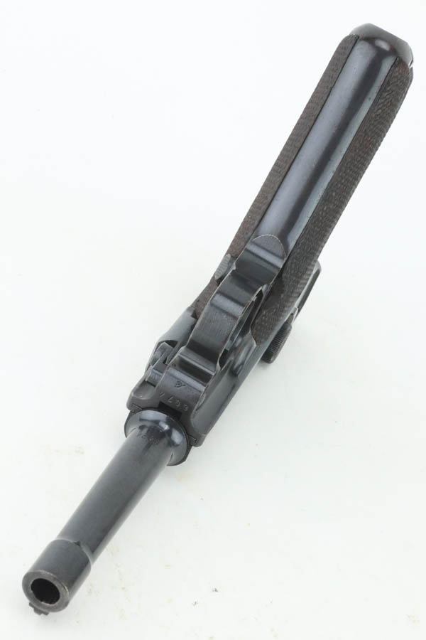 08/14/2024 – For sale is a P.08 Luger made by Mauser in 1940. The pistol is in fantastic condition surviving the war with the parts retaining a nice polished blued finish. There are some spots of freckling/oxidation visible on the finish but has not dulled the bluing on most of the parts. The most finish loss is on the side plate from rubbing against a holster and also towards the muzzle. The bore is bright with great rifling. The pistol itself is matching but has a period correct but mismatched magazine. The wood grips are not numbered but stamped Eagle/655 which is correct.