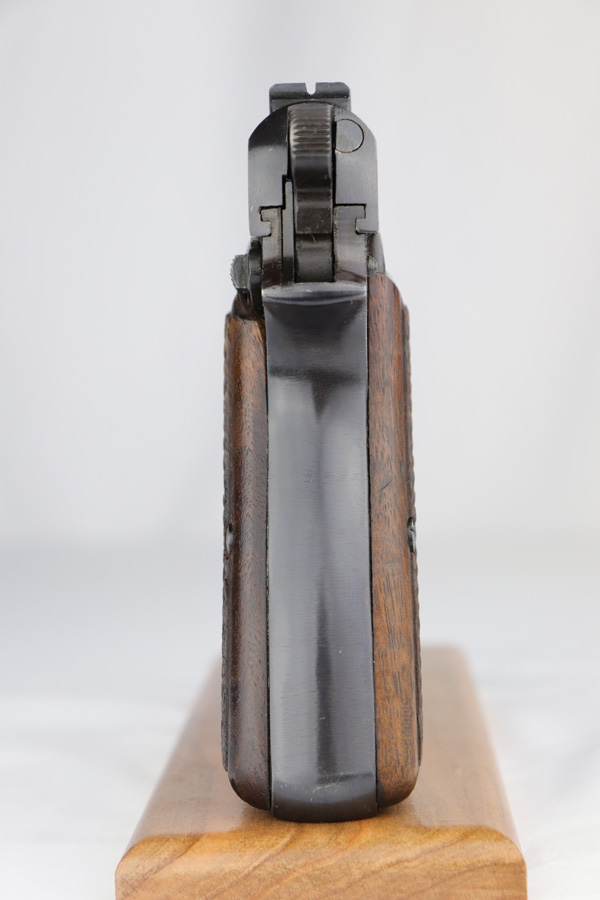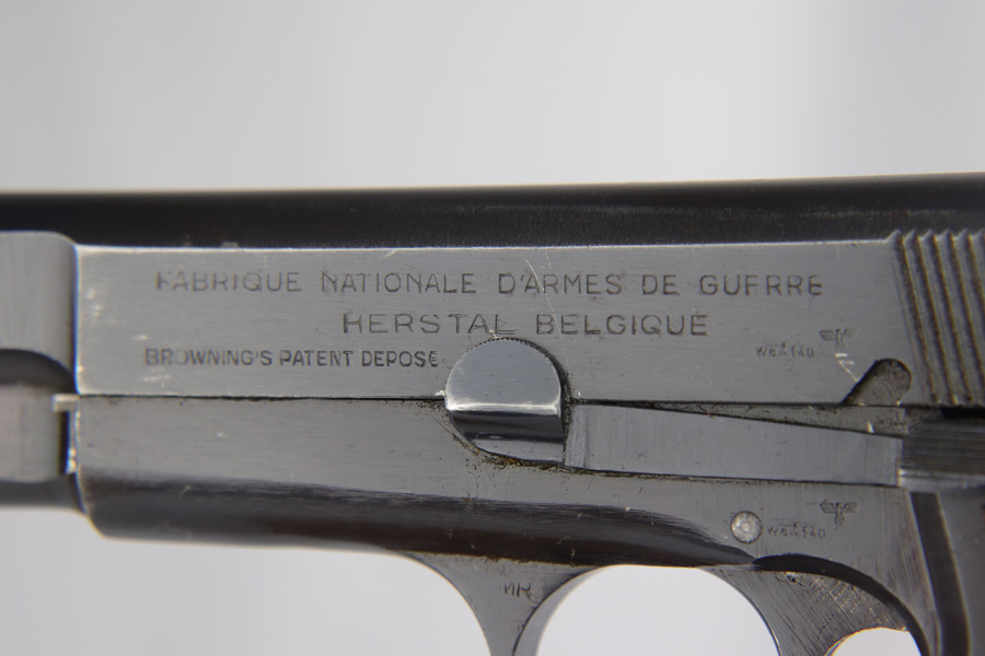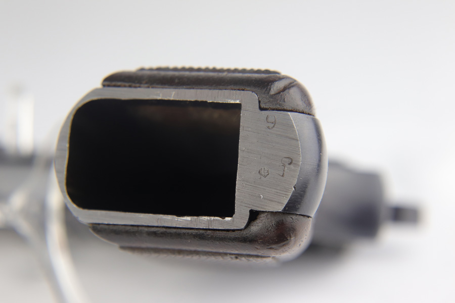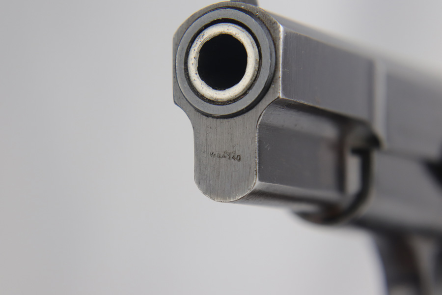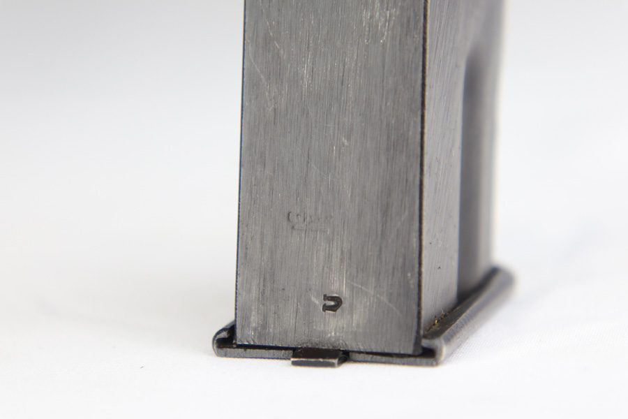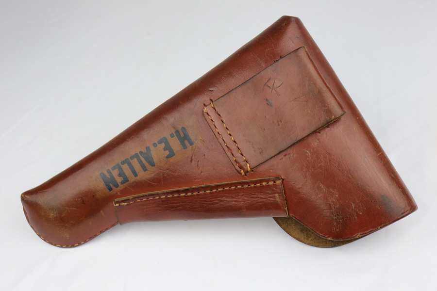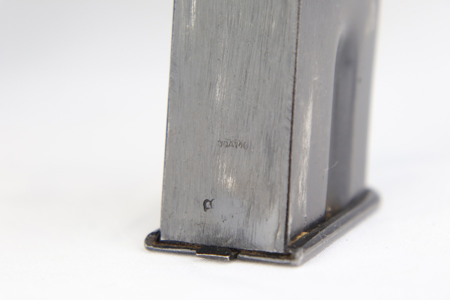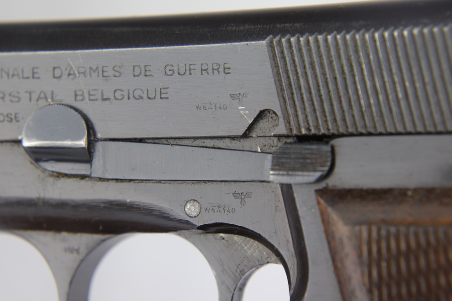 2/11/19 – This is a gorgeous and all original Nazi Browning Hi Power rig from the mid-war era. The pistol is all correct with ~98% blue remaining, showing minor high edge wear and slight finish loss along the top of the slide. Also a couple of small scuffs on the straps. WaA140 proofs on frame and slide. Nice grips with a minty bore. Holster is internally ’43 dated with waffen mark, and a previous owner printed their name on the back of it. Both magazines are WaA140 marked, too.
