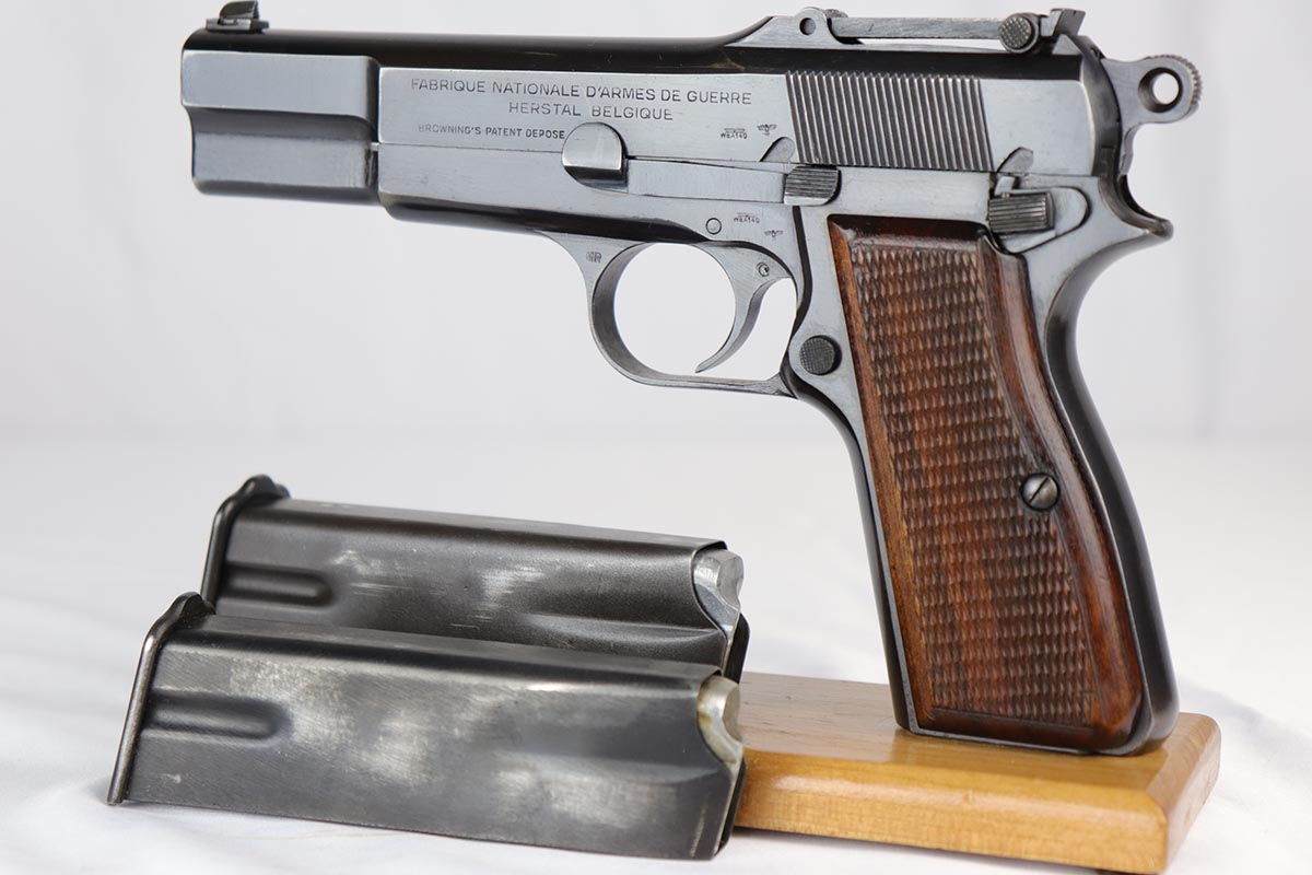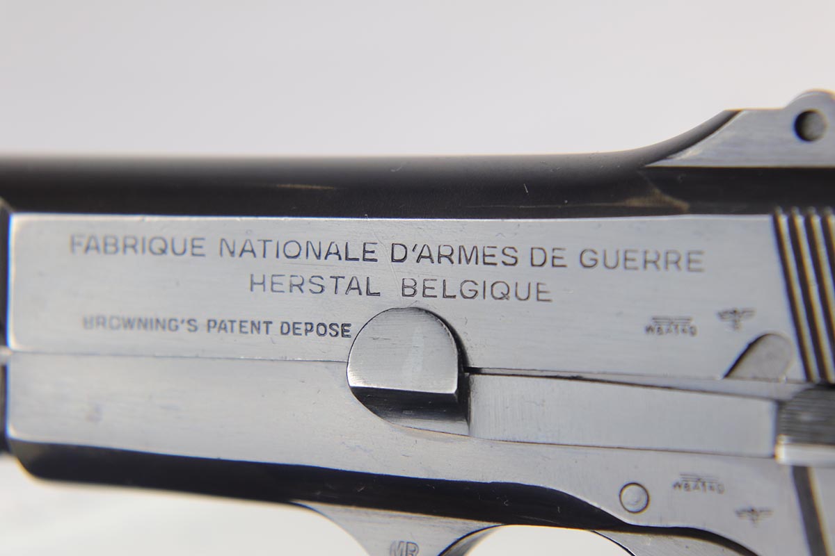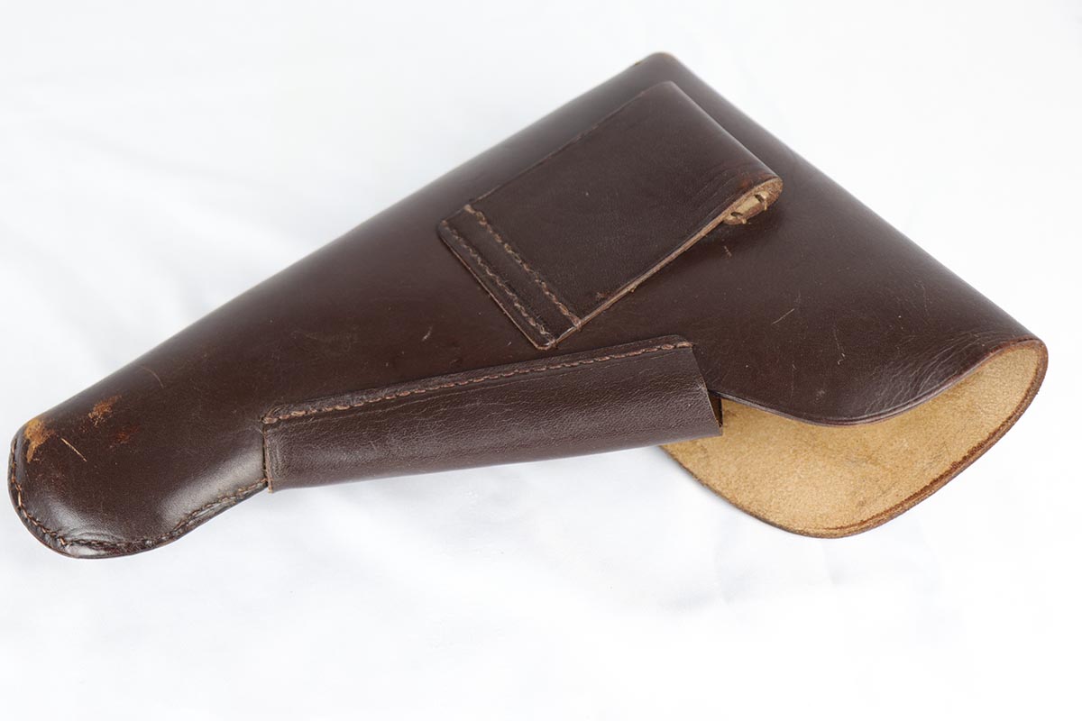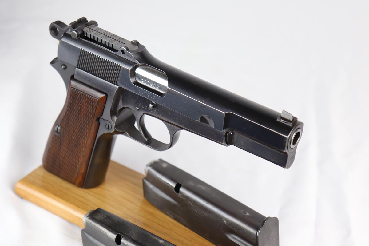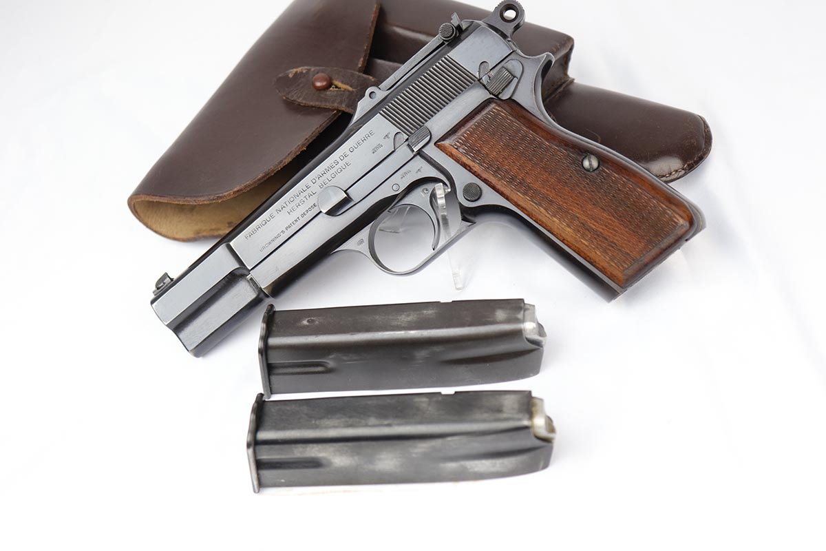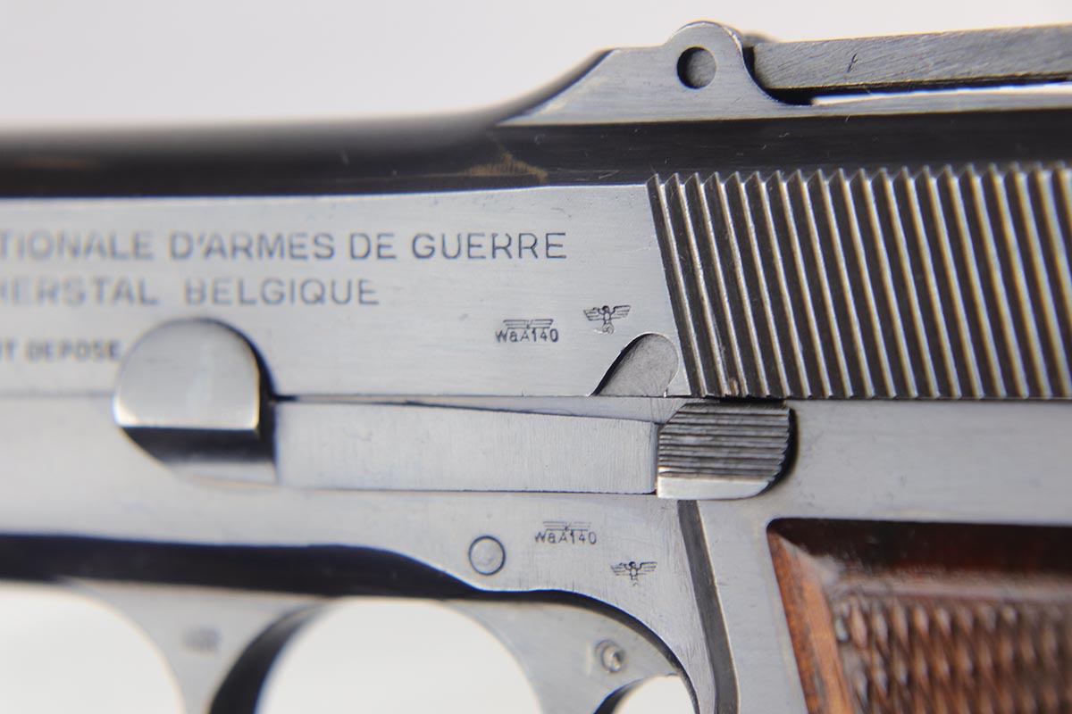 10/3/18 – This is an absolutely fantastic example of a complete Nazi Browning Hi Power rig with early tangent sight. The pistol is all matching and original with WaA140 proofs on slide and frame. The high-polish bluing rates at 97% with minor holster wear on high edges and a spot of finish loss on the bottom of the back strap. The pistol has a mint bore and comes with two WaA140 proofed magazines. It also includes a mint 1942 dated holster, with clear waffen and maker marks.