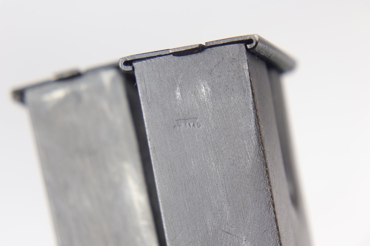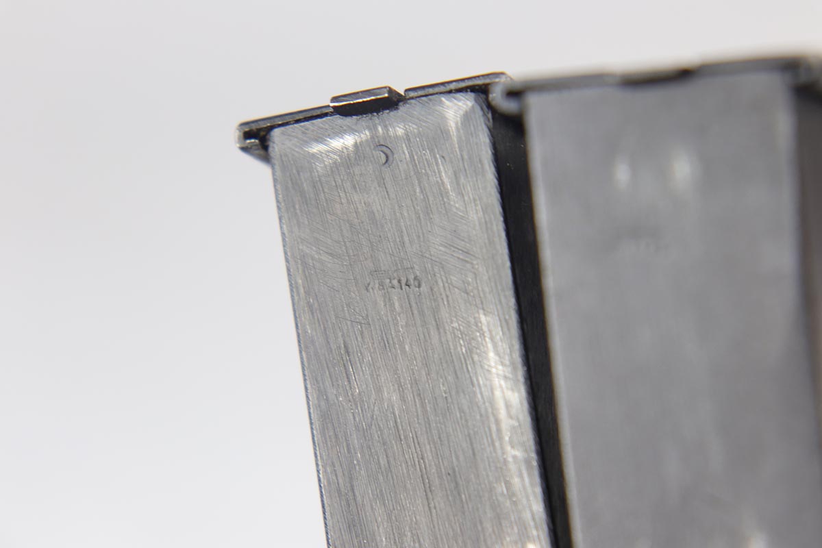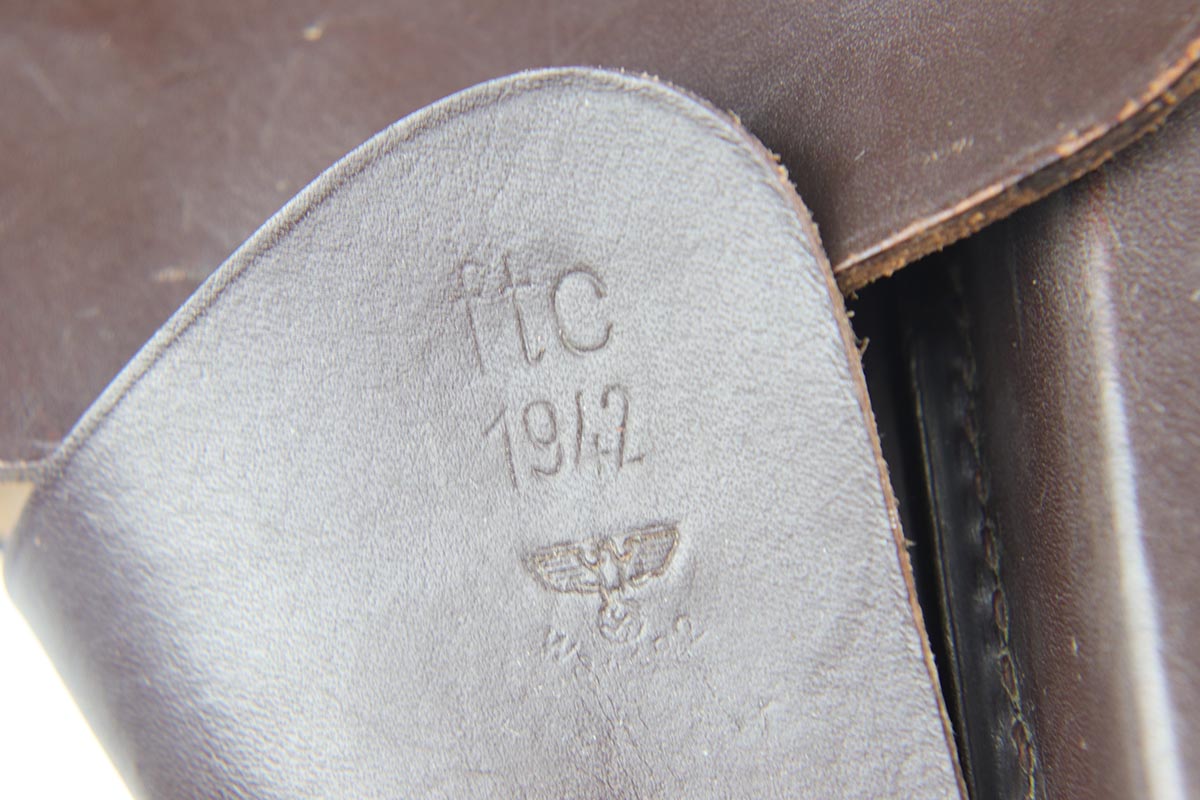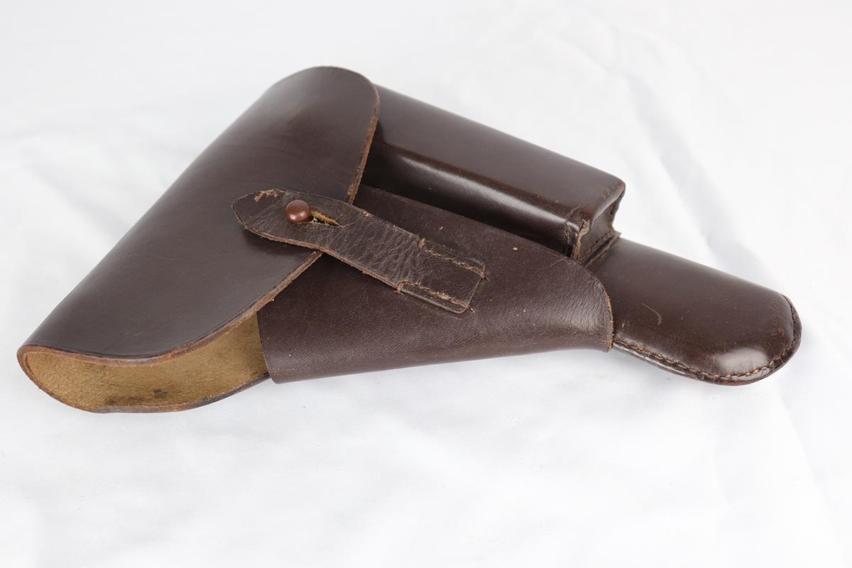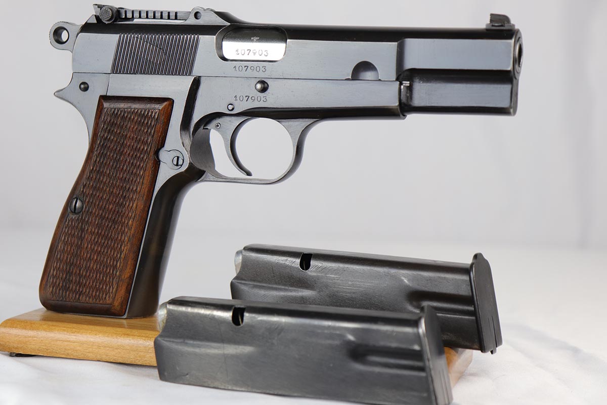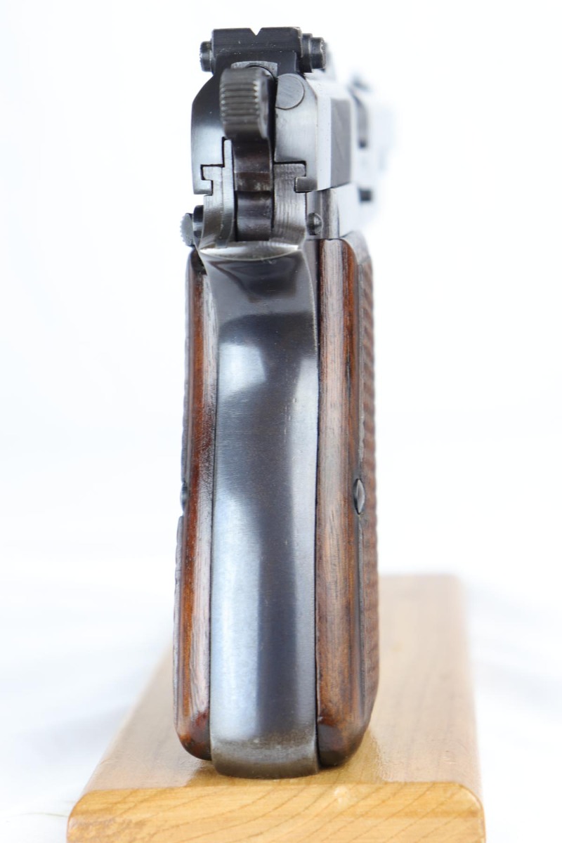 10/3/18 – This is an absolutely fantastic example of a complete Nazi Browning Hi Power rig with early tangent sight. The pistol is all matching and original with WaA140 proofs on slide and frame. The high-polish bluing rates at 97% with minor holster wear on high edges and a spot of finish loss on the bottom of the back strap. The pistol has a mint bore and comes with two WaA140 proofed magazines. It also includes a mint 1942 dated holster, with clear waffen and maker marks.