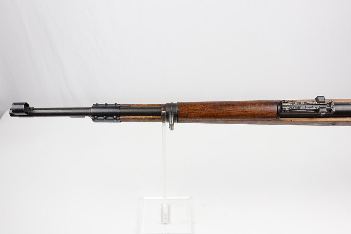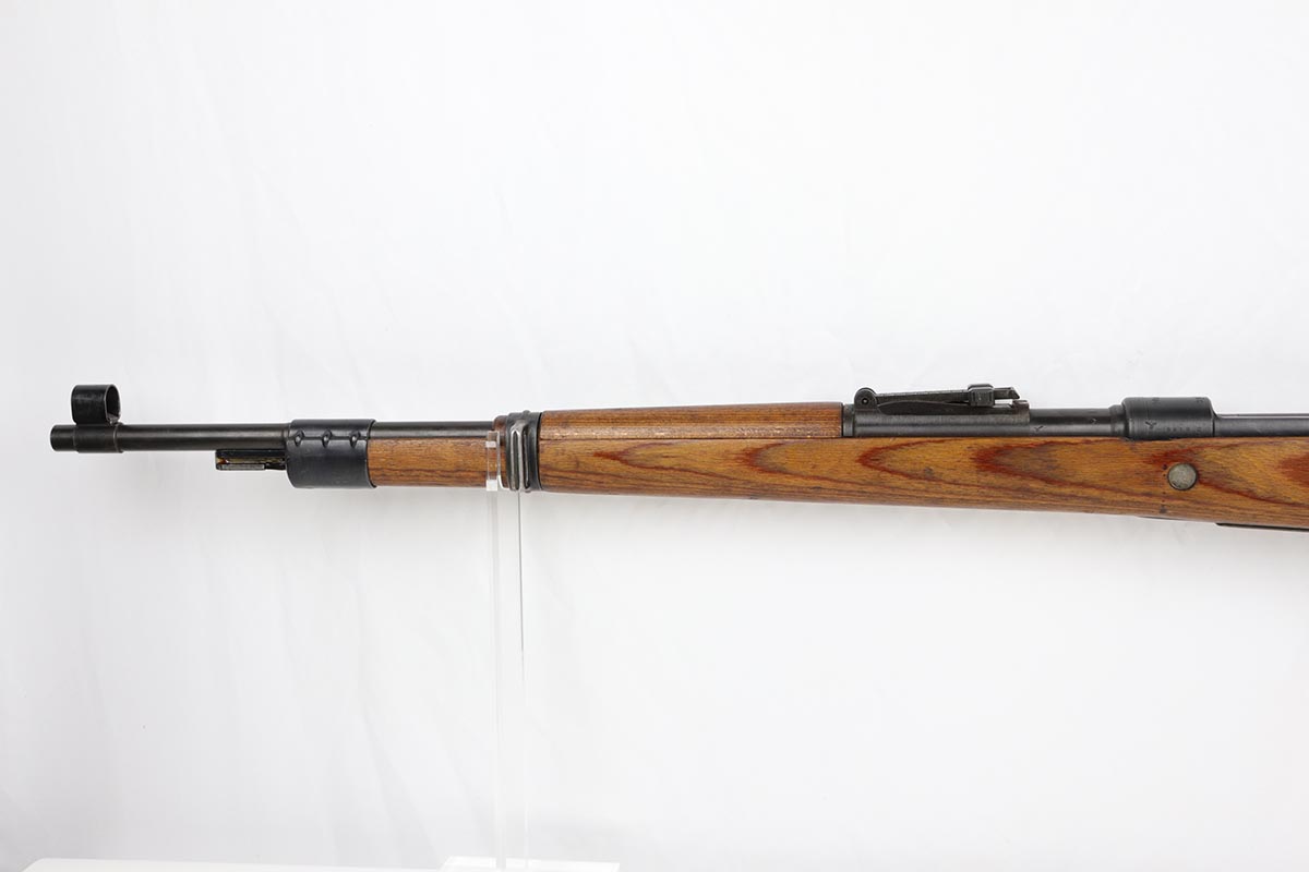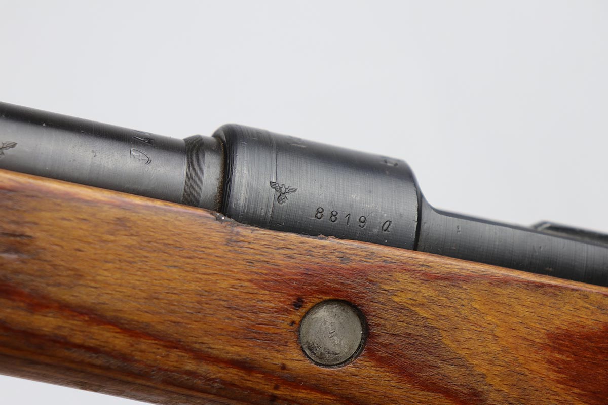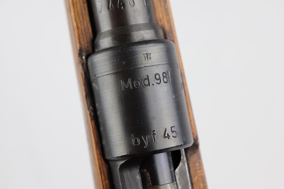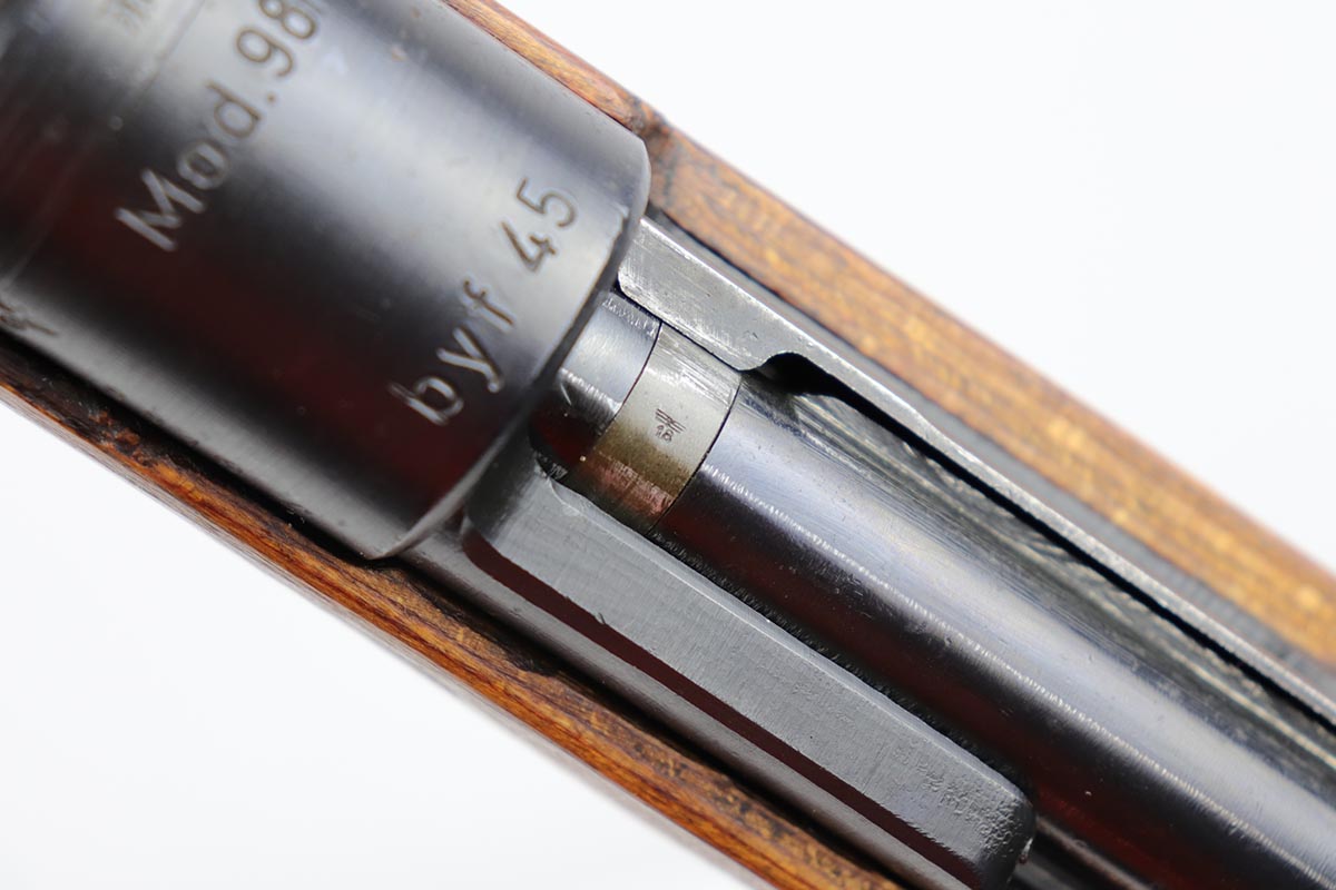 10/31/19 – This is a fantastic example of an original and matching Mauser K98 from 1945. The rifle has all matching numbers, and is typical for a late-war K98 with most parts unnumbered. The receiver and bolt assembly are the only numbered parts. The finish on the rifle is fantastic, with blued barrel/receiver/bands but phosphate trigger assembly and partially phosphated bolt assembly. There is only minimal finish loss to metal parts and no major areas of wear. Stock is in terrific condition with sharp waffenamt and ‘H’ for Heer Army on the right side. Bore has strong rifling but frost throughout and could use a thorough cleaning.