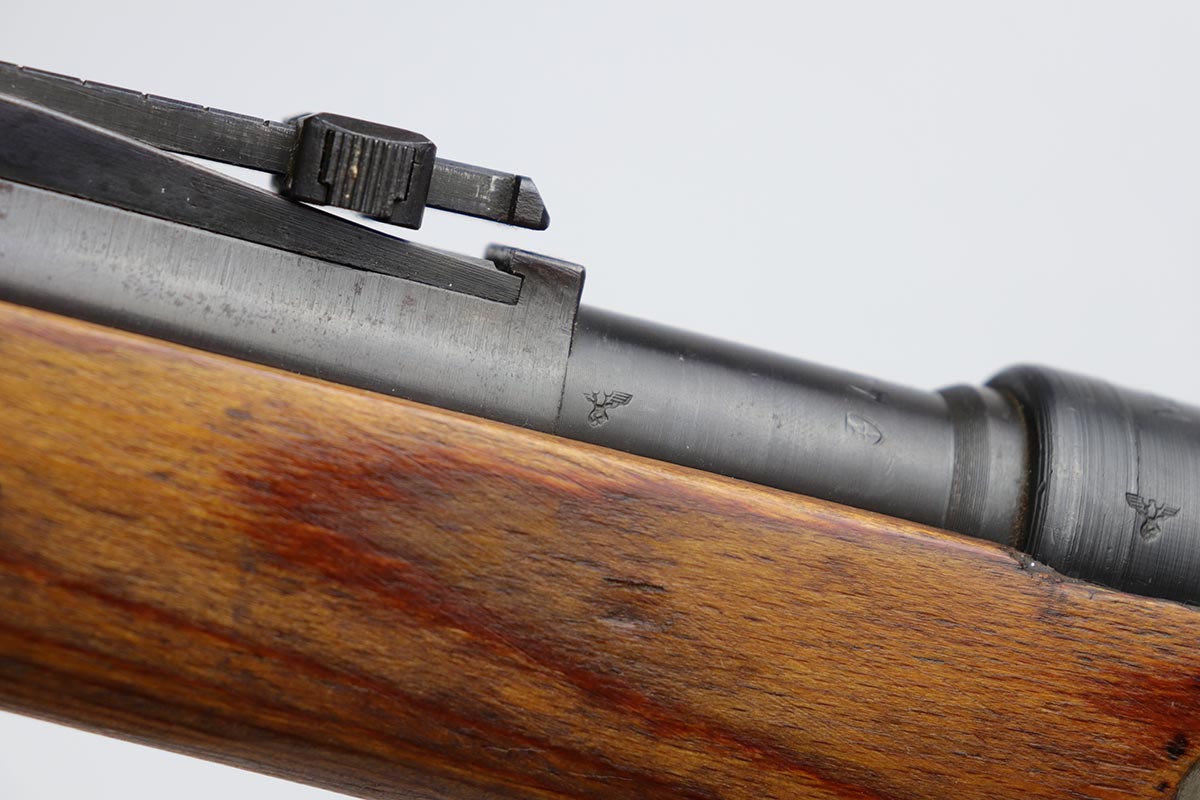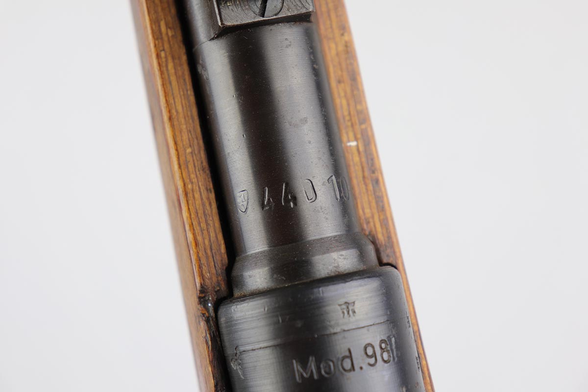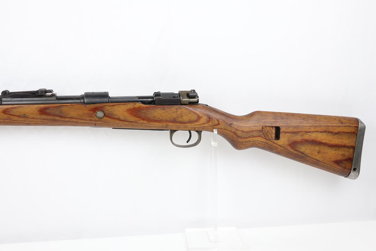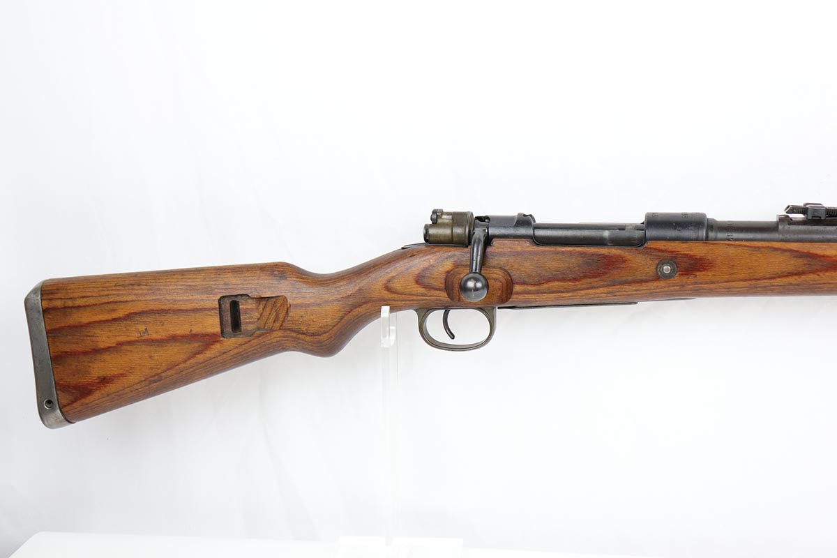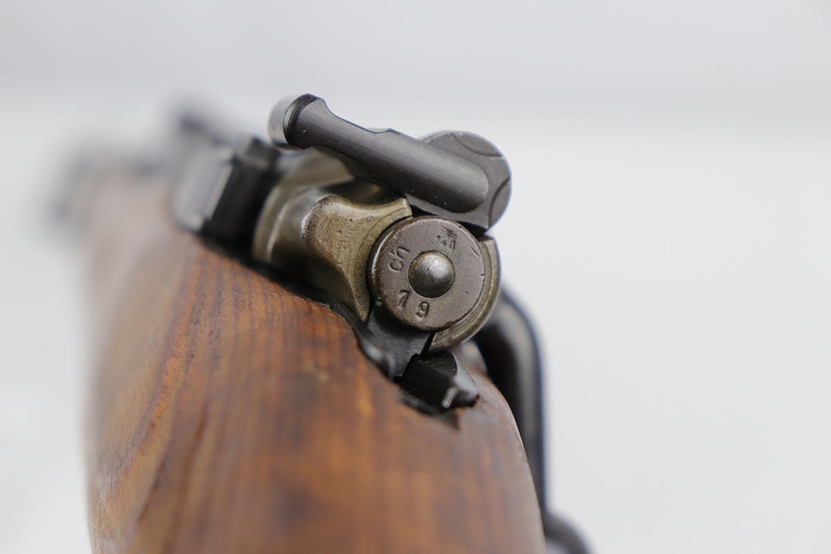 10/31/19 – This is a fantastic example of an original and matching Mauser K98 from 1945. The rifle has all matching numbers, and is typical for a late-war K98 with most parts unnumbered. The receiver and bolt assembly are the only numbered parts. The finish on the rifle is fantastic, with blued barrel/receiver/bands but phosphate trigger assembly and partially phosphated bolt assembly. There is only minimal finish loss to metal parts and no major areas of wear. Stock is in terrific condition with sharp waffenamt and ‘H’ for Heer Army on the right side. Bore has strong rifling but frost throughout and could use a thorough cleaning.