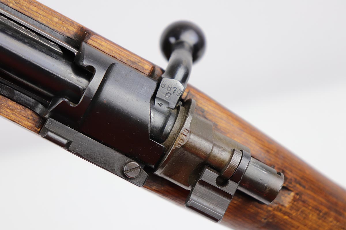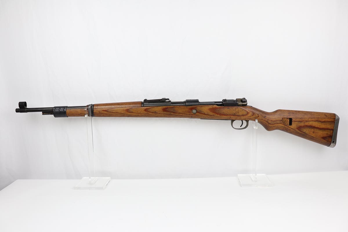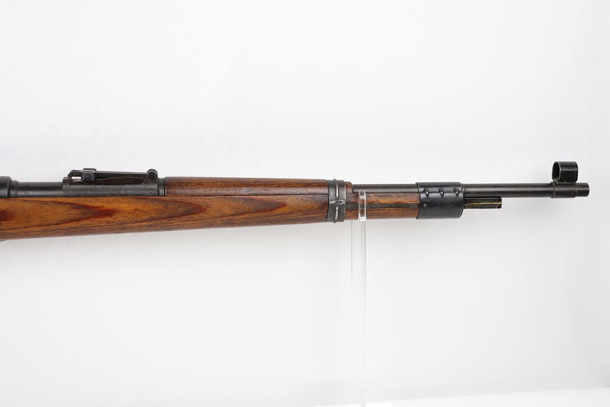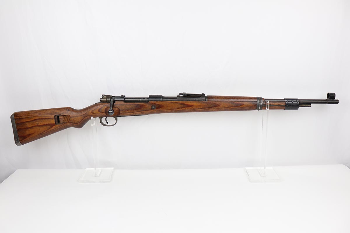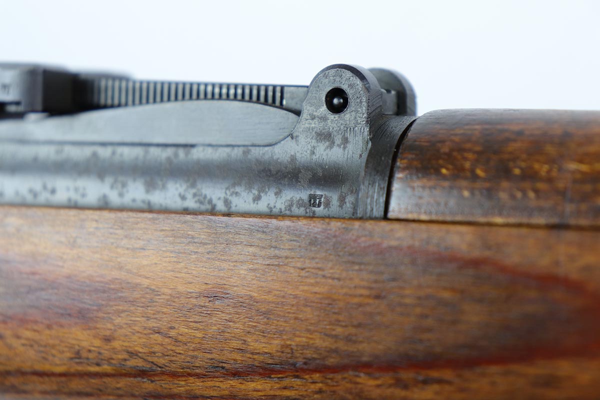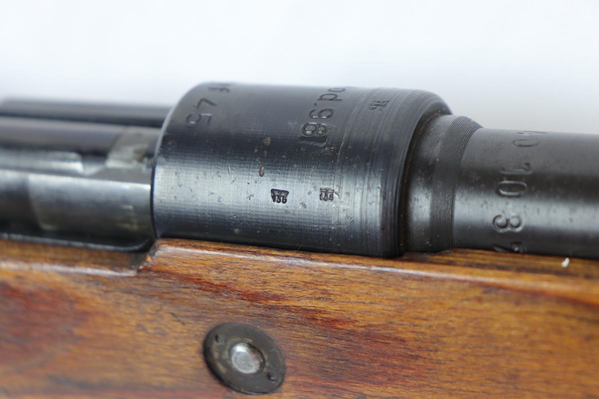 10/31/19 – This is a fantastic example of an original and matching Mauser K98 from 1945. The rifle has all matching numbers, and is typical for a late-war K98 with most parts unnumbered. The receiver and bolt assembly are the only numbered parts. The finish on the rifle is fantastic, with blued barrel/receiver/bands but phosphate trigger assembly and partially phosphated bolt assembly. There is only minimal finish loss to metal parts and no major areas of wear. Stock is in terrific condition with sharp waffenamt and ‘H’ for Heer Army on the right side. Bore has strong rifling but frost throughout and could use a thorough cleaning.