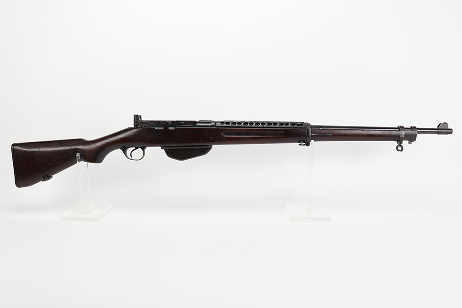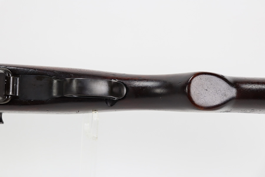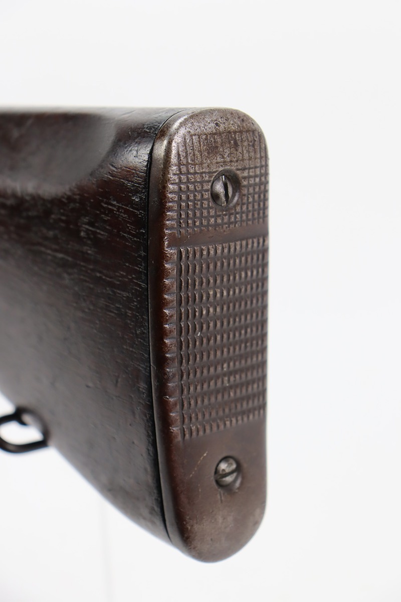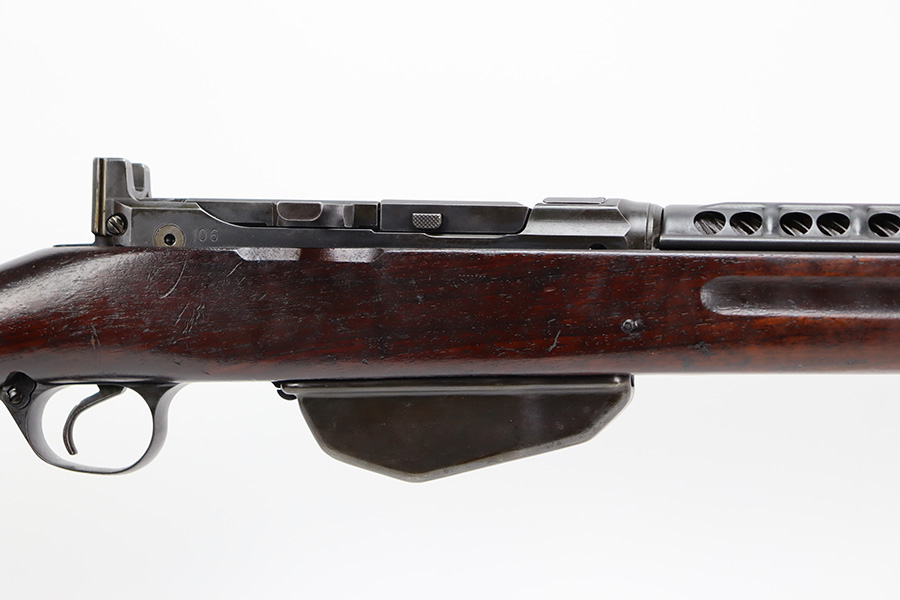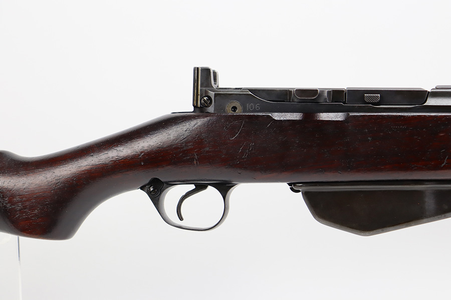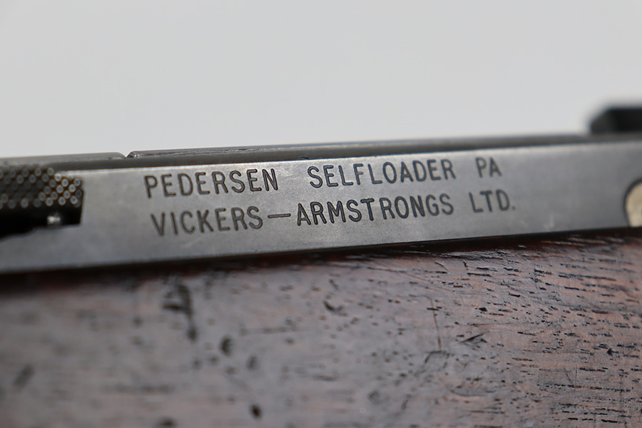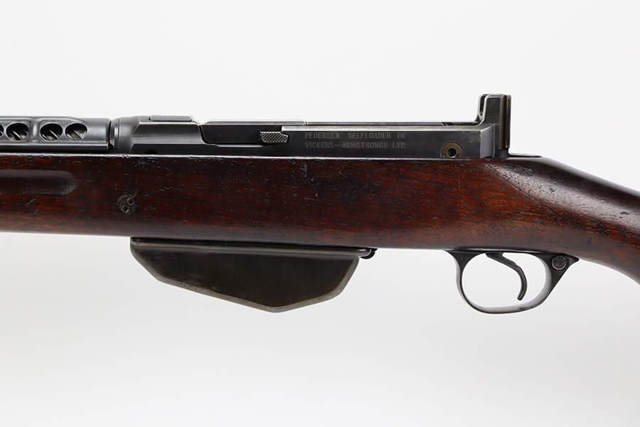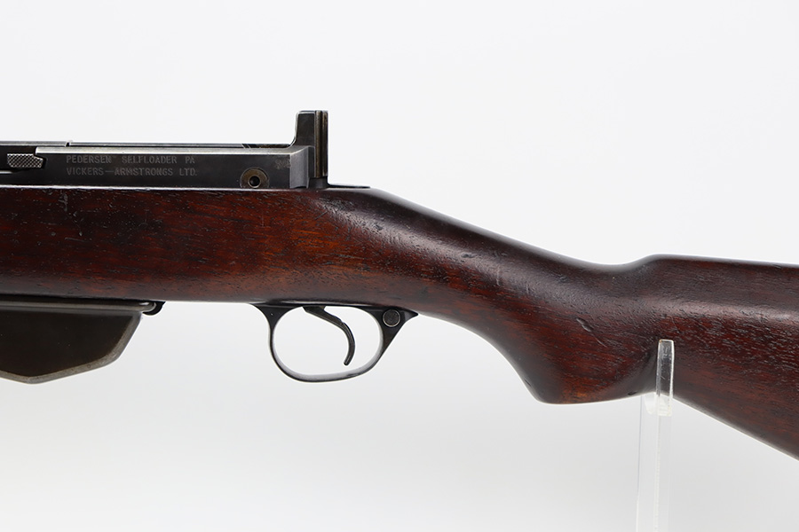 8/3/23 – This is an exceptional example of a very rare, John D. Pedersen designed, self-loading rifle, which was manufactured by Vickers-Armstrongs Ltd. circa 1930. In 1923, the U.S. Ordnance Department had hired Pedersen to design a semi-automatic rifle as a replacement for the Model 1903 and Model 1917 rifles, as well as a new, lower recoil, cartridge for it to be chambered in. The first Pedersen self-loading rifle was chambered in .276 caliber and was approved for testing in 1924. In 1927, Springfield Armory manufactured twenty Pedersen rifles for initial field testing, which was to run concurrently with the .276 caliber semi-automatic rifle developed by John C. Garand. The Pedersen rifle performed well in the initial service tests, and in 1929/30, Pedersen contracted with Vickers-Armstrong (of England) to manufacture approximately 200 of the Pedersen self-loading rifles for use in the final U.S. tests, as well as being tested by the British military. Although both passed, in 1932, the army selected the Garand design in .30-06 for limited procurement, and shortly after ended all further development of the Pedersen rifle. After the army discontinued its pursuit of the Pedersen rifle, they were able to sell a limited number of rifles to China, Portugal, and Japan, who were also attempting to develop a self-loading rifle, possibly with his delayed-blowback toggle mechanism. These rifles all have several distinctive features such as a 10 round box magazine loaded with en-bloc clips, fine adjustable 1/2 minute rear sight, 24 inch barrel with spiral cooling fins, perforated metal hand guard, and sliding bar safety in the bolt. They were all chambered in the early rimless .276 bottleneck Pederson cartridge. The left side of the receiver is roll-stamped: “PEDERSEN SELFLOADER PA/VICKERS-ARMSTRONGS LTD.” in two-lines. The serial number “106” is stamped on the right rear of the receiver.The top of the sliding bar safety is marked “REDY” on the left side and “SAFE” on the right side. An encircled “C/2” is stamped on the top of the receiver. There is an early Birmingham Nitro proofmark (used until 1925) stamped on the top of the front edge of the bolt and the left, rear side of the receiver. This particularl rifle is in fantastic condition, with only minor edge wear to the original bluing. Excellent, shiny bore. The stock is in similar condition with only light handling wear but no cracks or chips. The listing also includes a sealed box of .276 ammunition (20rds), as well as two clips with 10rds in each and an open box with two remaining. NOTE: The rear sight is missing the aperture components.