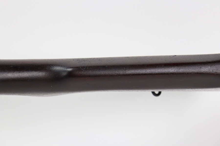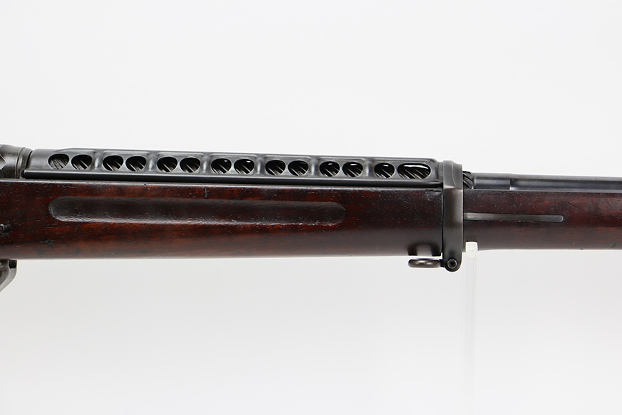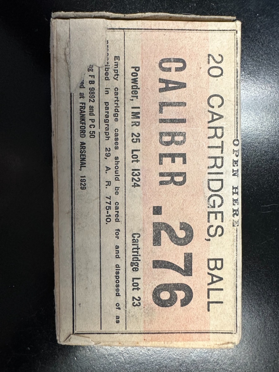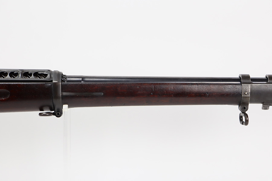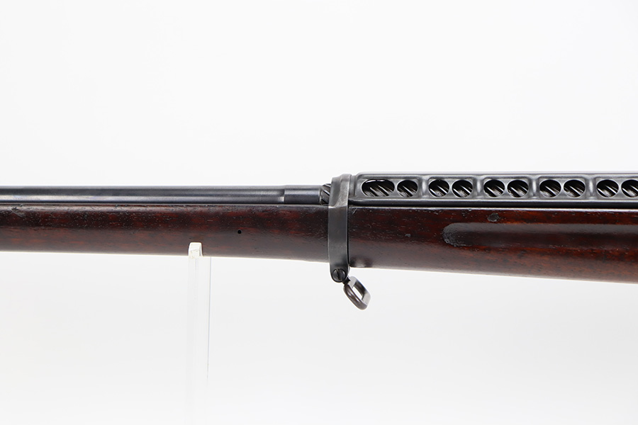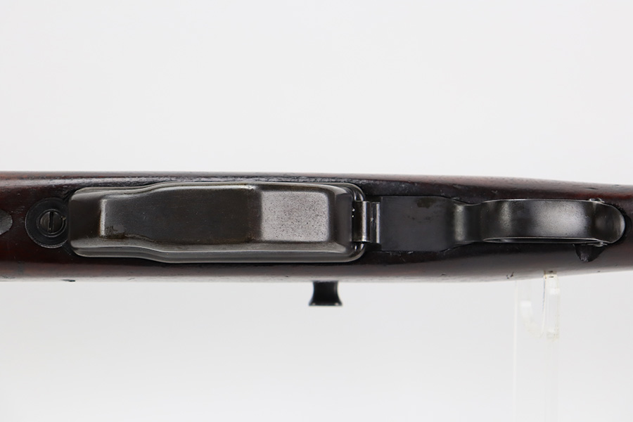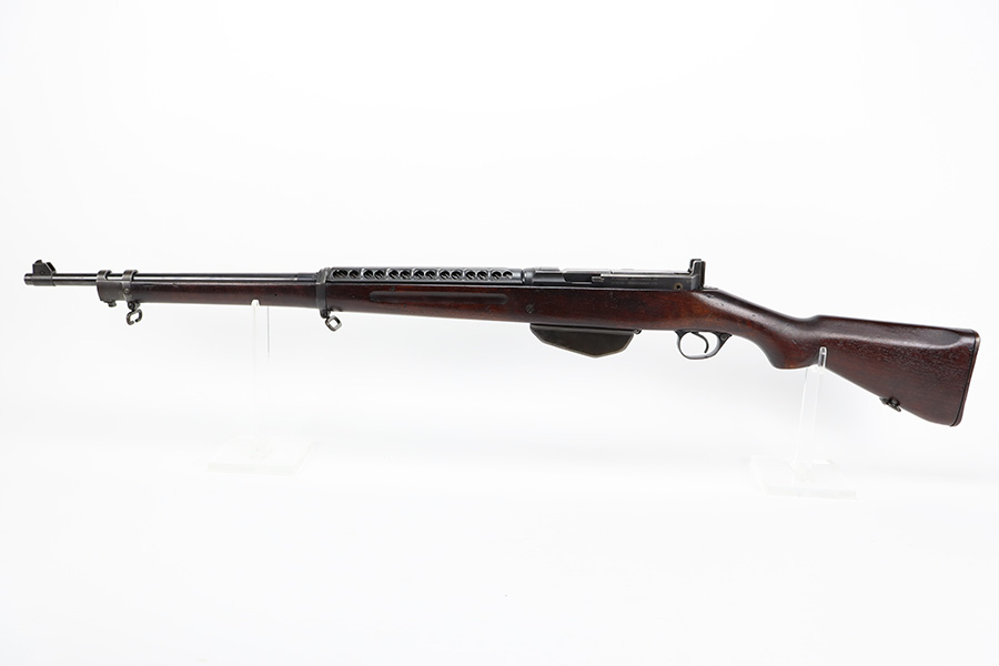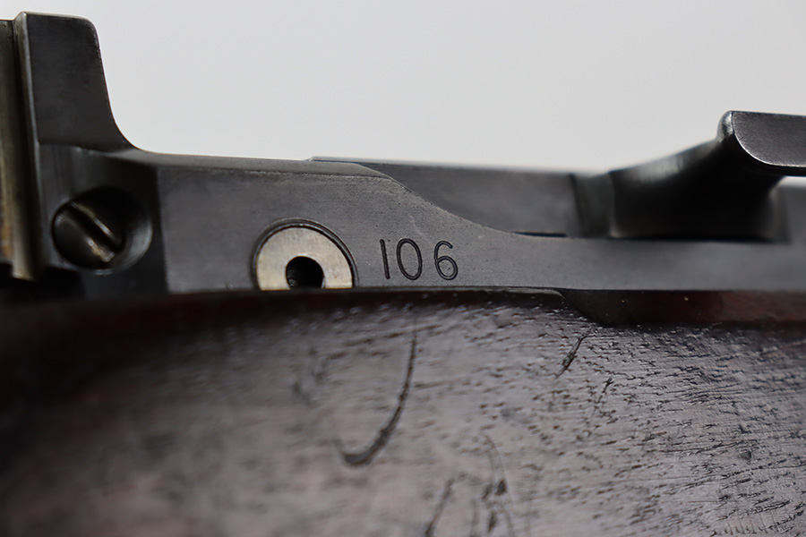 8/3/23 – This is an exceptional example of a very rare, John D. Pedersen designed, self-loading rifle, which was manufactured by Vickers-Armstrongs Ltd. circa 1930. In 1923, the U.S. Ordnance Department had hired Pedersen to design a semi-automatic rifle as a replacement for the Model 1903 and Model 1917 rifles, as well as a new, lower recoil, cartridge for it to be chambered in. The first Pedersen self-loading rifle was chambered in .276 caliber and was approved for testing in 1924. In 1927, Springfield Armory manufactured twenty Pedersen rifles for initial field testing, which was to run concurrently with the .276 caliber semi-automatic rifle developed by John C. Garand. The Pedersen rifle performed well in the initial service tests, and in 1929/30, Pedersen contracted with Vickers-Armstrong (of England) to manufacture approximately 200 of the Pedersen self-loading rifles for use in the final U.S. tests, as well as being tested by the British military. Although both passed, in 1932, the army selected the Garand design in .30-06 for limited procurement, and shortly after ended all further development of the Pedersen rifle. After the army discontinued its pursuit of the Pedersen rifle, they were able to sell a limited number of rifles to China, Portugal, and Japan, who were also attempting to develop a self-loading rifle, possibly with his delayed-blowback toggle mechanism. These rifles all have several distinctive features such as a 10 round box magazine loaded with en-bloc clips, fine adjustable 1/2 minute rear sight, 24 inch barrel with spiral cooling fins, perforated metal hand guard, and sliding bar safety in the bolt. They were all chambered in the early rimless .276 bottleneck Pederson cartridge. The left side of the receiver is roll-stamped: “PEDERSEN SELFLOADER PA/VICKERS-ARMSTRONGS LTD.” in two-lines. The serial number “106” is stamped on the right rear of the receiver.The top of the sliding bar safety is marked “REDY” on the left side and “SAFE” on the right side. An encircled “C/2” is stamped on the top of the receiver. There is an early Birmingham Nitro proofmark (used until 1925) stamped on the top of the front edge of the bolt and the left, rear side of the receiver. This particularl rifle is in fantastic condition, with only minor edge wear to the original bluing. Excellent, shiny bore. The stock is in similar condition with only light handling wear but no cracks or chips. The listing also includes a sealed box of .276 ammunition (20rds), as well as two clips with 10rds in each and an open box with two remaining. NOTE: The rear sight is missing the aperture components.