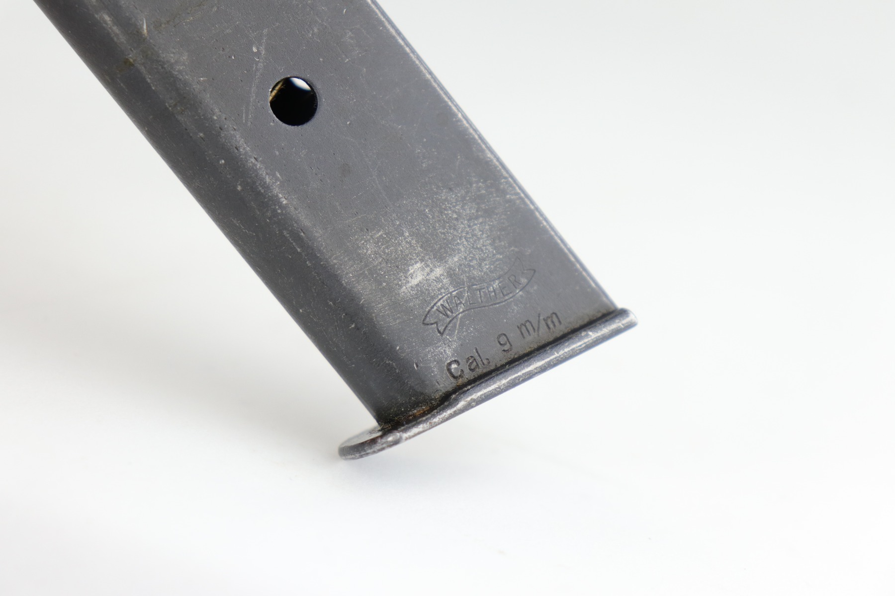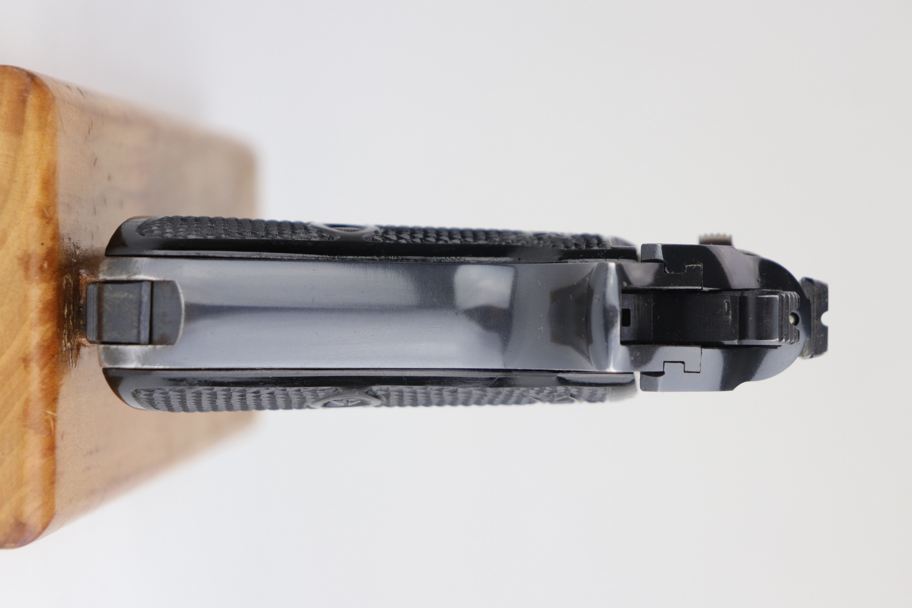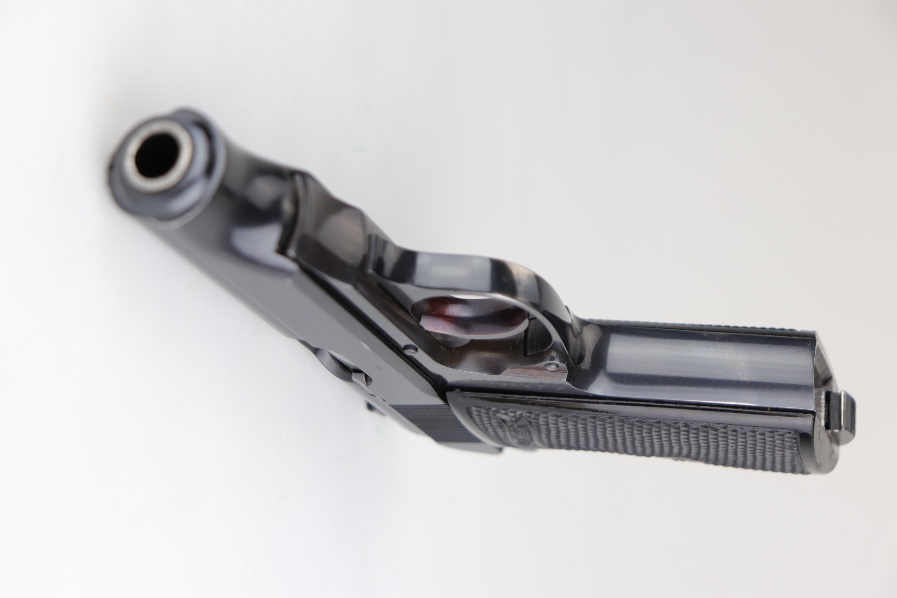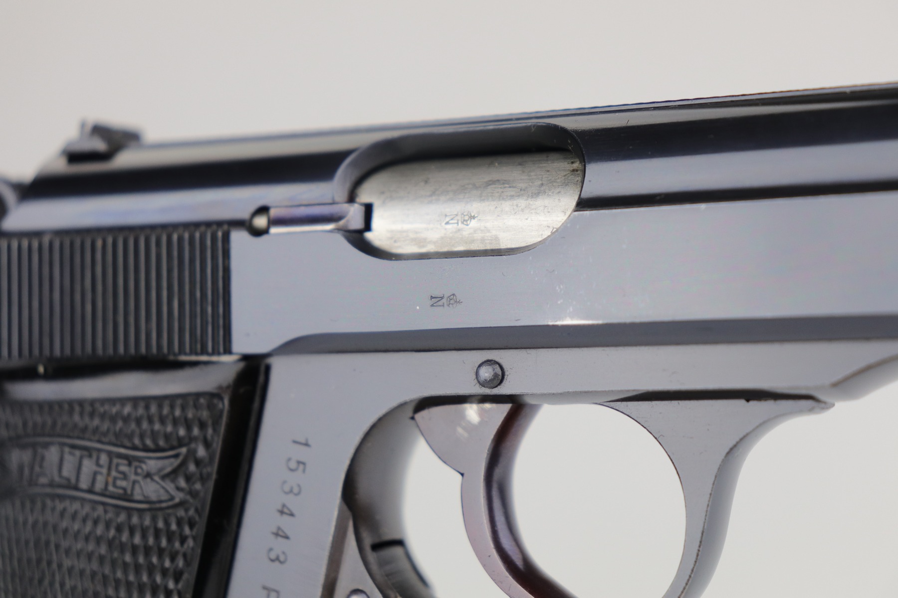 3/6/20 – This is a scarce and near-mint Walther PP from the Nazi era, chambered for the popular 9mm Kurz. Only about 3.5% of Walther PP production was in this caliber, and rarely do you encounter examples this nice. The high-polish blue rates at 98% with minor front edge wear on the slide, and a hint of finish loss on the trigger guard and front strap. Mint bore and excellent grips. Correct magazine.