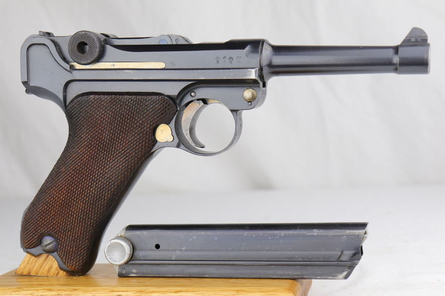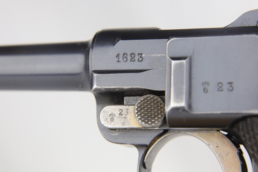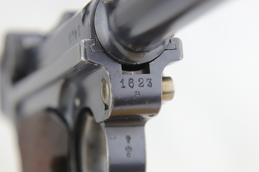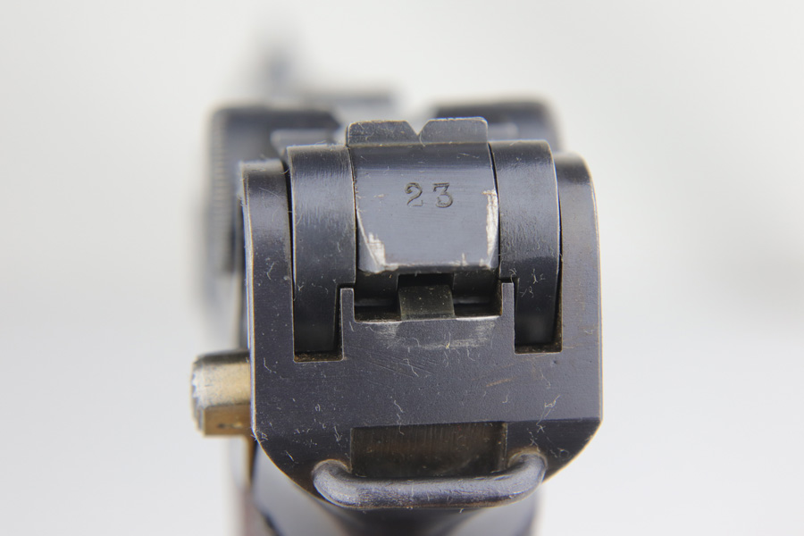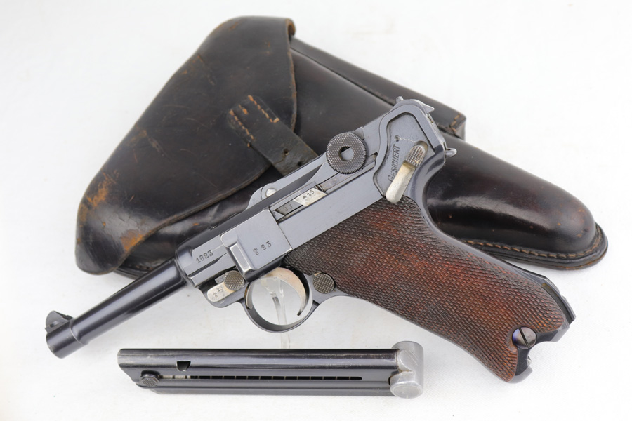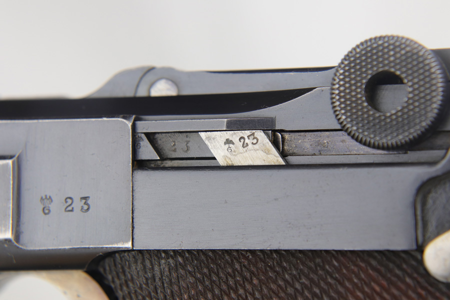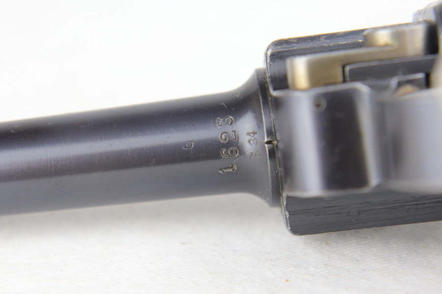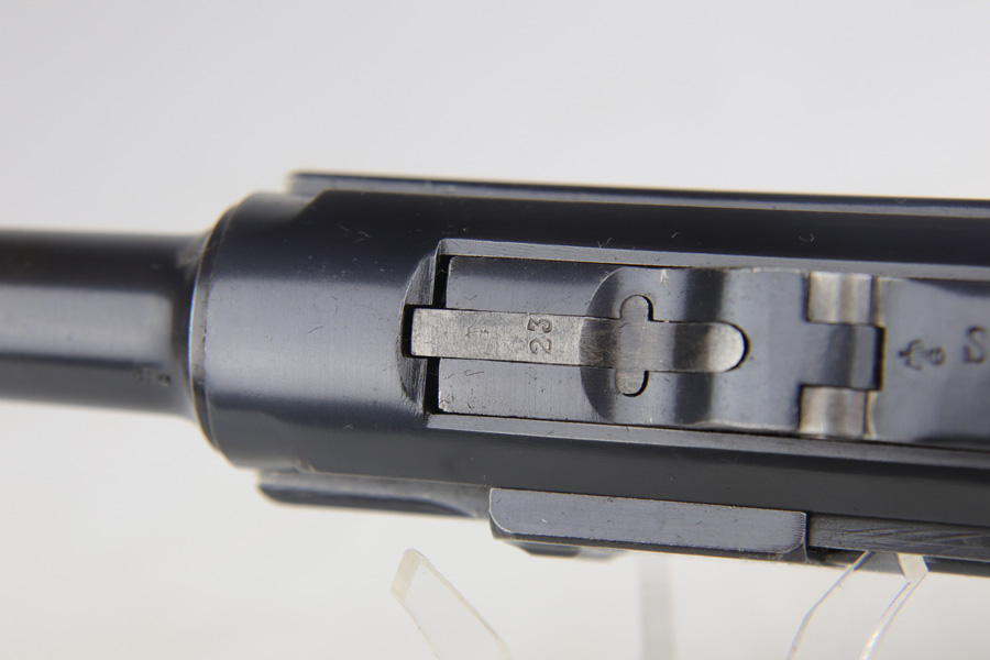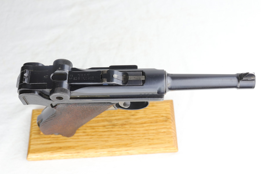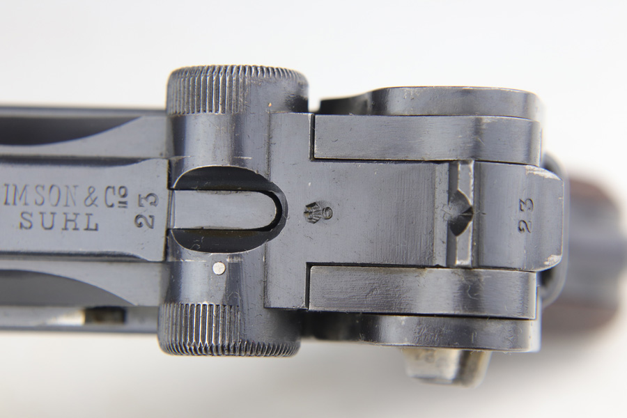 1/16/19 – This is a very rare Simson Luger made in the Weimar period in Germany, between the wars. Simson started manufacturing Lugers in 1925 using equipment from the old Erfurt arsenal. Production was very low as the German army was limited in size and equipment following the Treaty of Versailles. Simson & Co. was the only company authorized to produce lugers for the German army during this time but then the company was nationalized by the Nazis in 1933. So total production from 1925 -1933 was very limited – even more rare than the Krieghoff lugers. This gun is all matching and all parts are correctly stamped with the Simson Eagle/6 proof mark. My best guess is that this gun was made in 1931 or 32. The original finish is about 97% with nice straw colored small parts. There is minor muzzle and side plate wear, and a spot of finish loss on the bottom of the front strap. The grips are original as well with the full serial number on the reverse as well as the Simson proof. Even the grip screws are fire blue in color and have the tiny Simson proof. Everything on this gun is correct and original with the exception of the non-matching magazine, which is for a later Mauser (see photos). The mechanics are very good and the bore is shiny and strong. The pistol comes with what appears to be a Great War era holster in good condition. It appears to be internally proofed with maker mark and date but it is faint enough that I cannot make it out. A great example of a rare Luger for the advanced collector.
