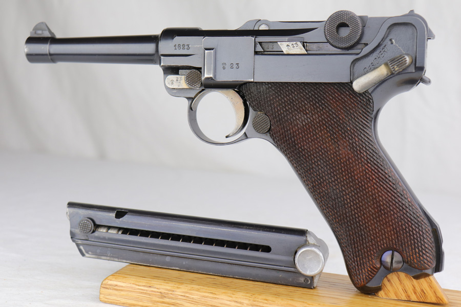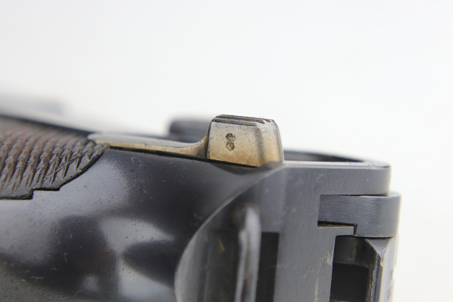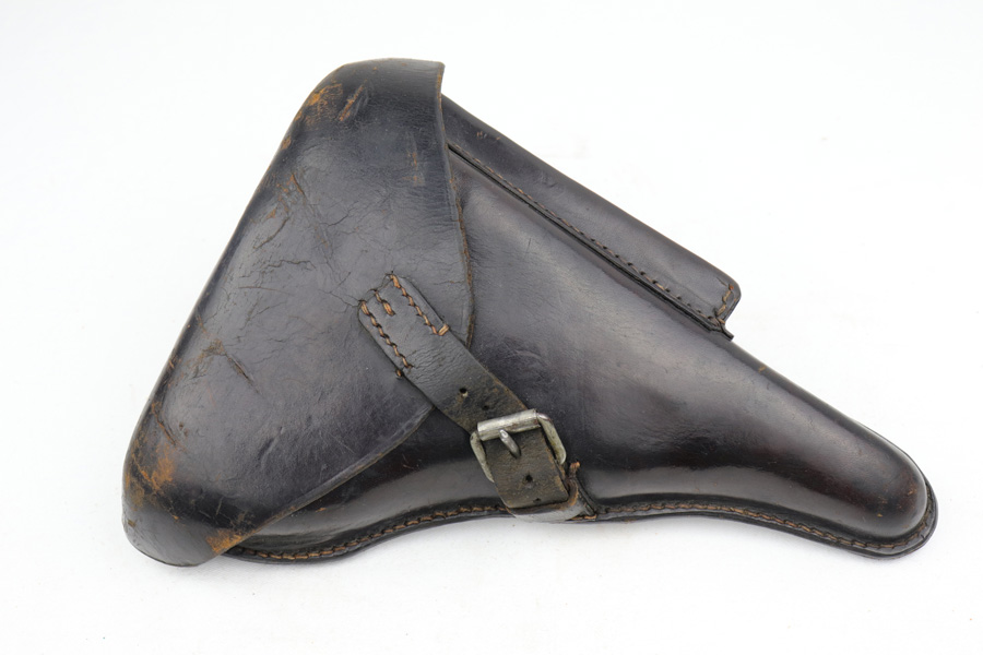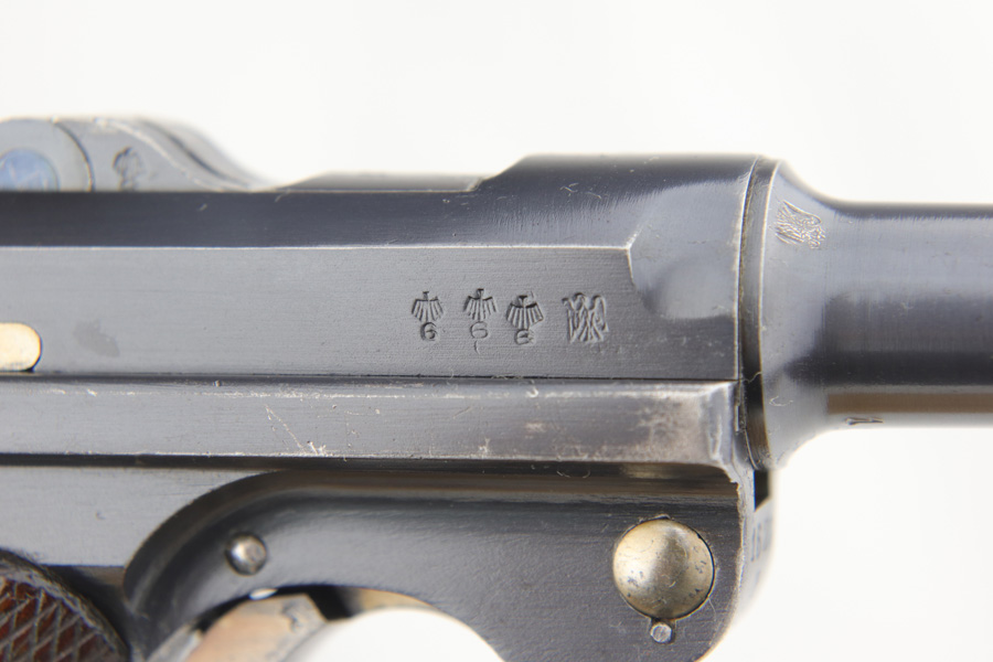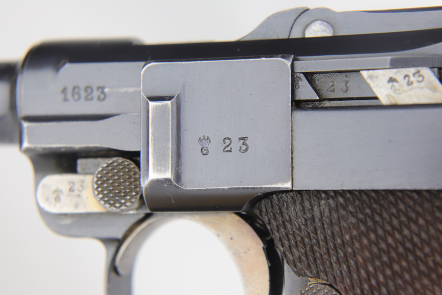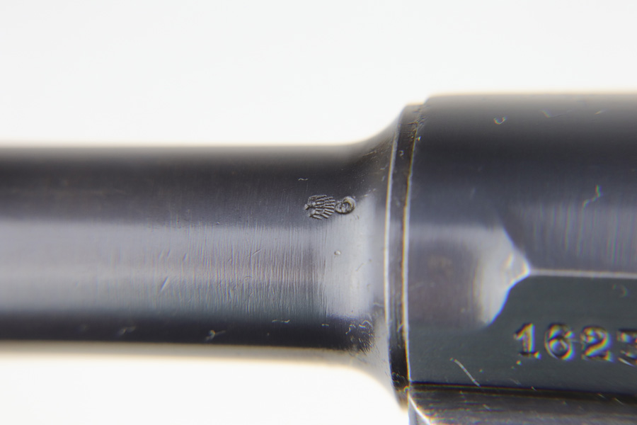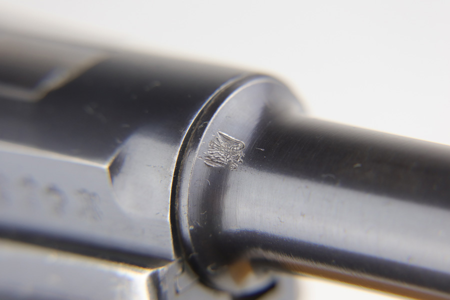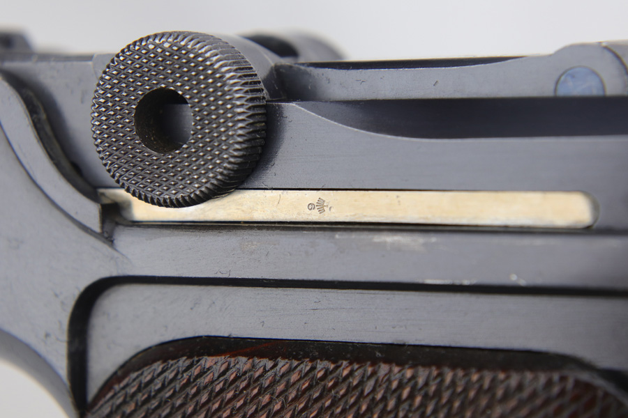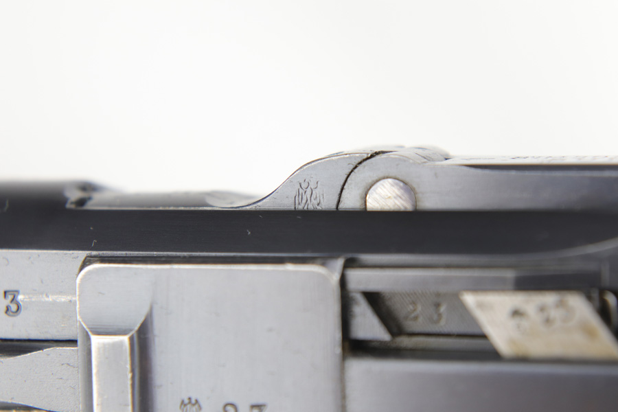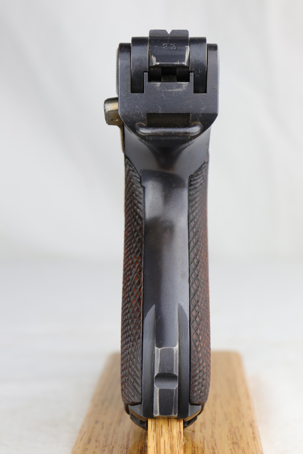 1/16/19 – This is a very rare Simson Luger made in the Weimar period in Germany, between the wars. Simson started manufacturing Lugers in 1925 using equipment from the old Erfurt arsenal. Production was very low as the German army was limited in size and equipment following the Treaty of Versailles. Simson & Co. was the only company authorized to produce lugers for the German army during this time but then the company was nationalized by the Nazis in 1933. So total production from 1925 -1933 was very limited – even more rare than the Krieghoff lugers. This gun is all matching and all parts are correctly stamped with the Simson Eagle/6 proof mark. My best guess is that this gun was made in 1931 or 32. The original finish is about 97% with nice straw colored small parts. There is minor muzzle and side plate wear, and a spot of finish loss on the bottom of the front strap. The grips are original as well with the full serial number on the reverse as well as the Simson proof. Even the grip screws are fire blue in color and have the tiny Simson proof. Everything on this gun is correct and original with the exception of the non-matching magazine, which is for a later Mauser (see photos). The mechanics are very good and the bore is shiny and strong. The pistol comes with what appears to be a Great War era holster in good condition. It appears to be internally proofed with maker mark and date but it is faint enough that I cannot make it out. A great example of a rare Luger for the advanced collector.