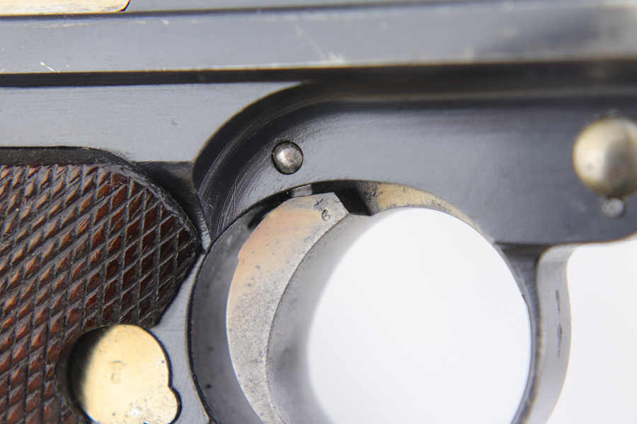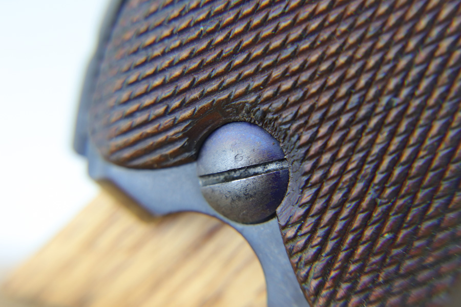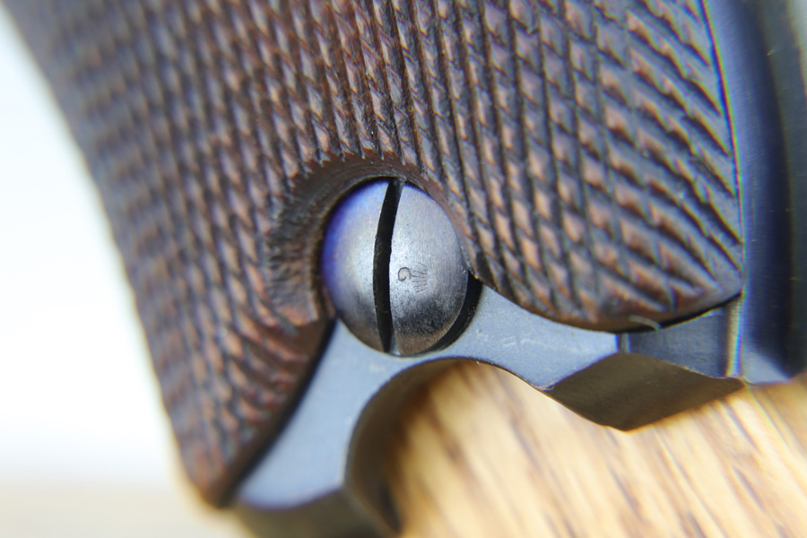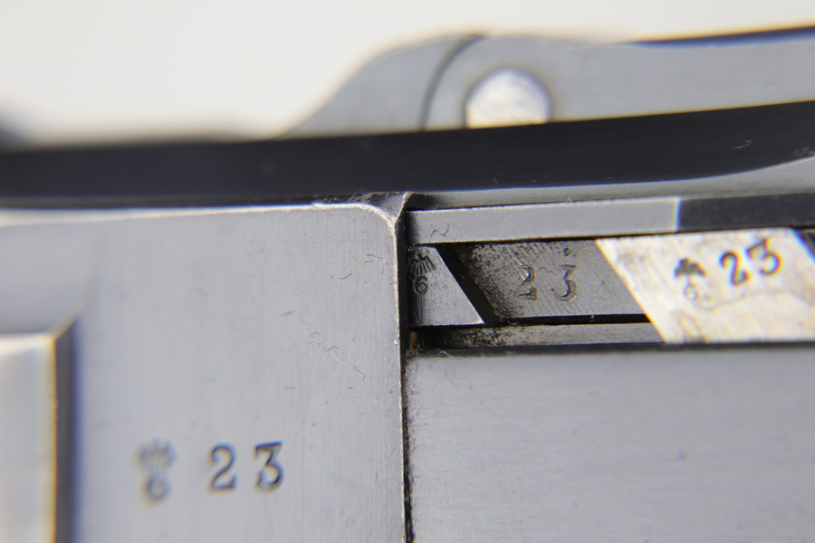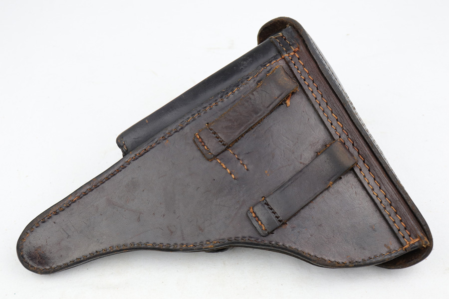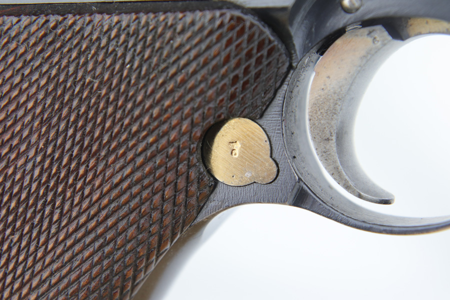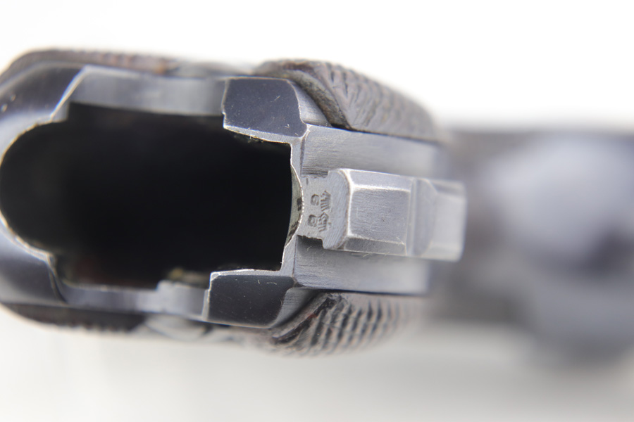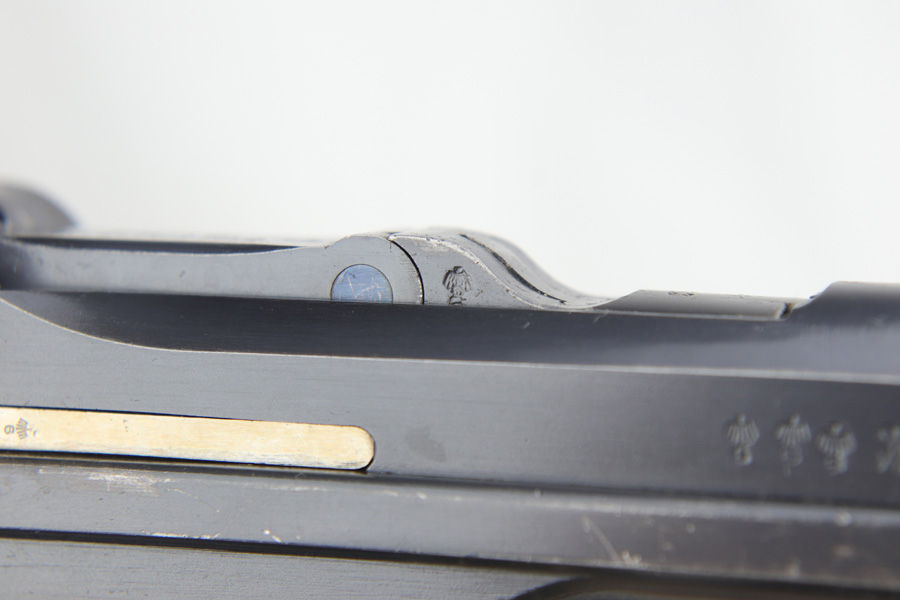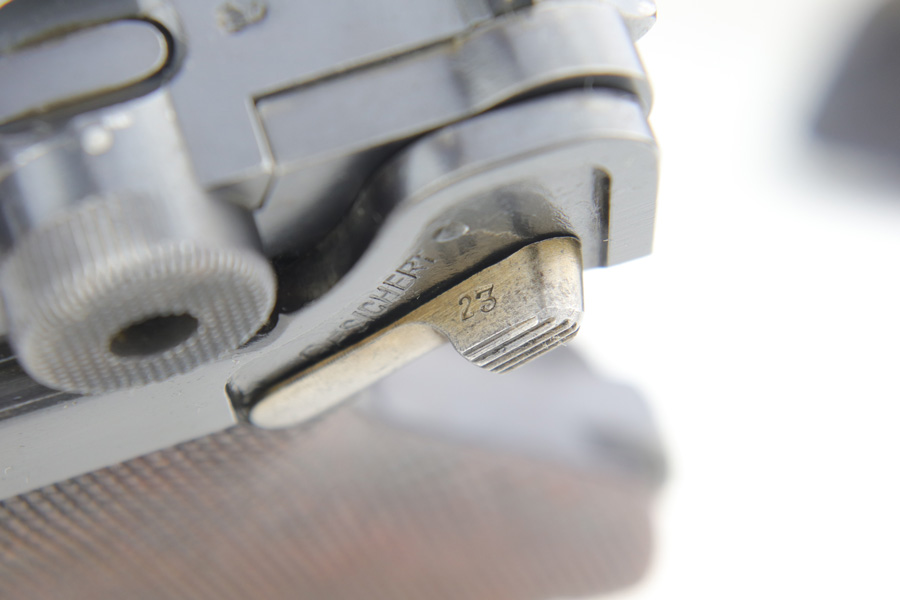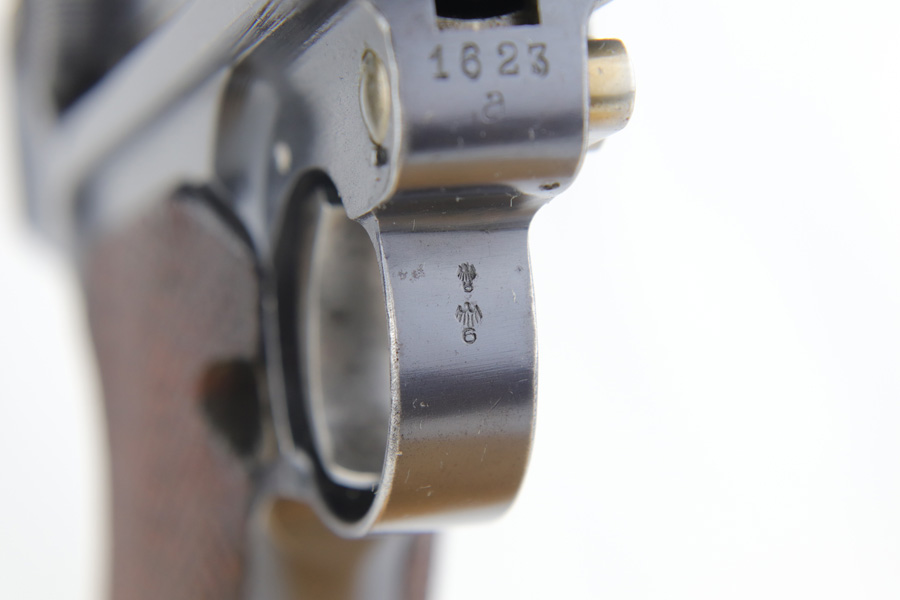 1/16/19 – This is a very rare Simson Luger made in the Weimar period in Germany, between the wars. Simson started manufacturing Lugers in 1925 using equipment from the old Erfurt arsenal. Production was very low as the German army was limited in size and equipment following the Treaty of Versailles. Simson & Co. was the only company authorized to produce lugers for the German army during this time but then the company was nationalized by the Nazis in 1933. So total production from 1925 -1933 was very limited – even more rare than the Krieghoff lugers. This gun is all matching and all parts are correctly stamped with the Simson Eagle/6 proof mark. My best guess is that this gun was made in 1931 or 32. The original finish is about 97% with nice straw colored small parts. There is minor muzzle and side plate wear, and a spot of finish loss on the bottom of the front strap. The grips are original as well with the full serial number on the reverse as well as the Simson proof. Even the grip screws are fire blue in color and have the tiny Simson proof. Everything on this gun is correct and original with the exception of the non-matching magazine, which is for a later Mauser (see photos). The mechanics are very good and the bore is shiny and strong. The pistol comes with what appears to be a Great War era holster in good condition. It appears to be internally proofed with maker mark and date but it is faint enough that I cannot make it out. A great example of a rare Luger for the advanced collector.