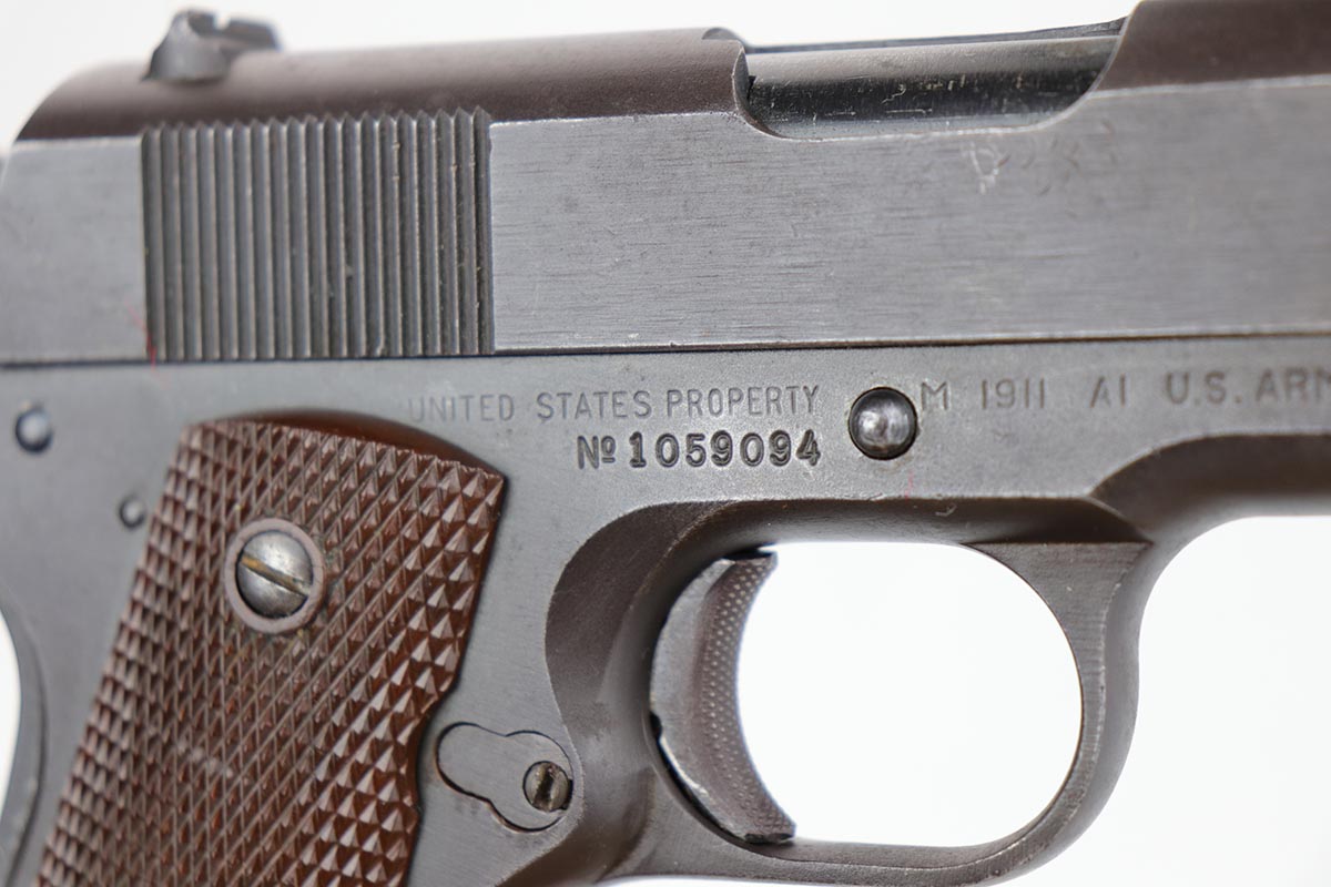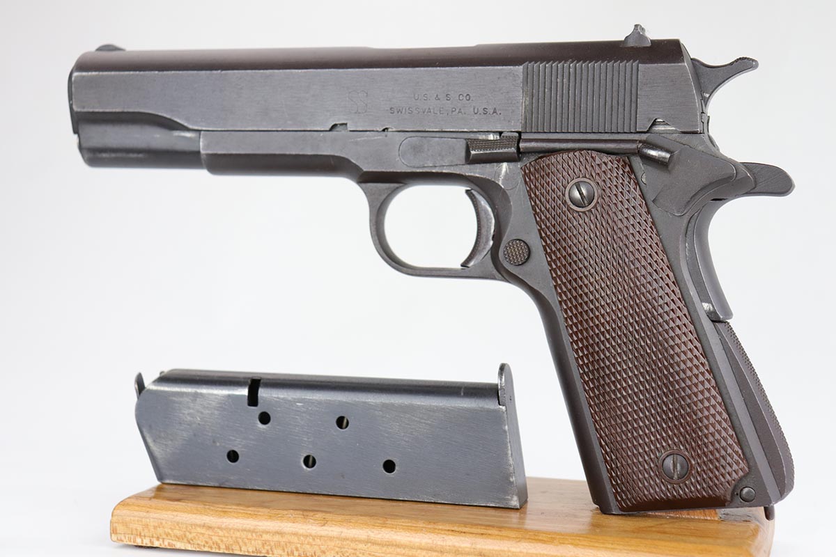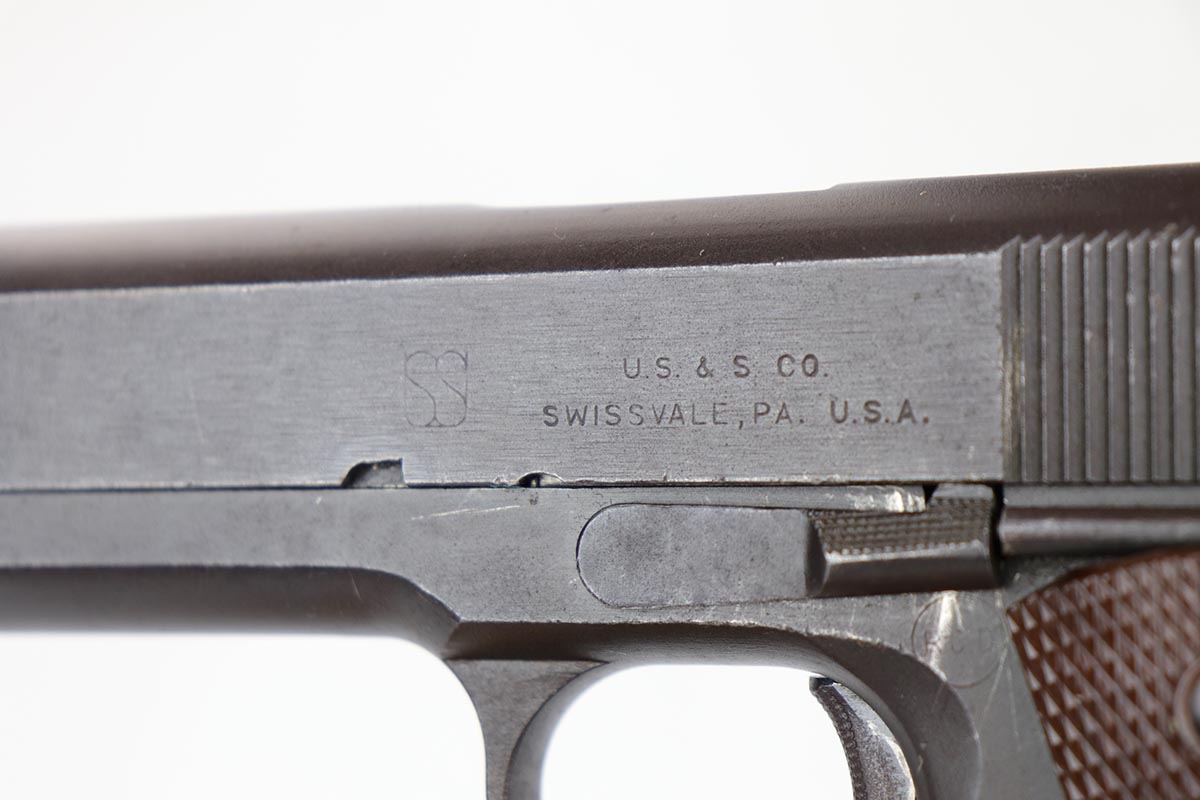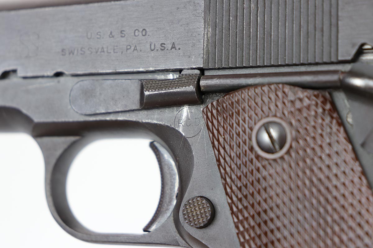 The Union Switch & Signal company of Swissvale Pennsylvania, primarily made railroad signaling equipment but received a contract on May 5, 1942 for the manufacture of M1911A1 pistols. The first pistols were accepted by Ordnance inspectors in January 1943, but the company received word that their contract would be canceled. Within a month U.S.&S. had signed a contract to supply carbine parts. On March 8, 1943 the company was officially notified that their contract had been cut back from 200,000 pistols to 30,000 pistols. However on June 26th, when the contract was nearly complete, and many of the workers had been transferred to Carbine operations, the company received a letter of intent to purchase an additional 25,000 pistols. The last of the pistols was shipped on November 27, 1943. 55,000 Union Switch and Signal pistols were delivered serial numbered from 1041405 to 1096404. U.S.&S. pistols are the second rarest of the M1911A1s (55,000 produced), only the Singer is rarer (500 produced). None of the Union Switch & Signal 1911A1s have the crossed cannons ordnance stamp. We are told these were issued to the Army Air Corps during the war.