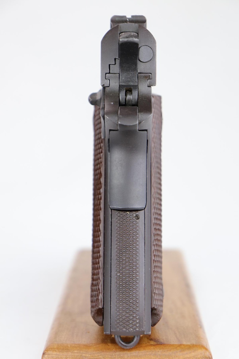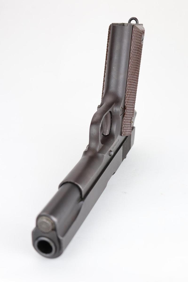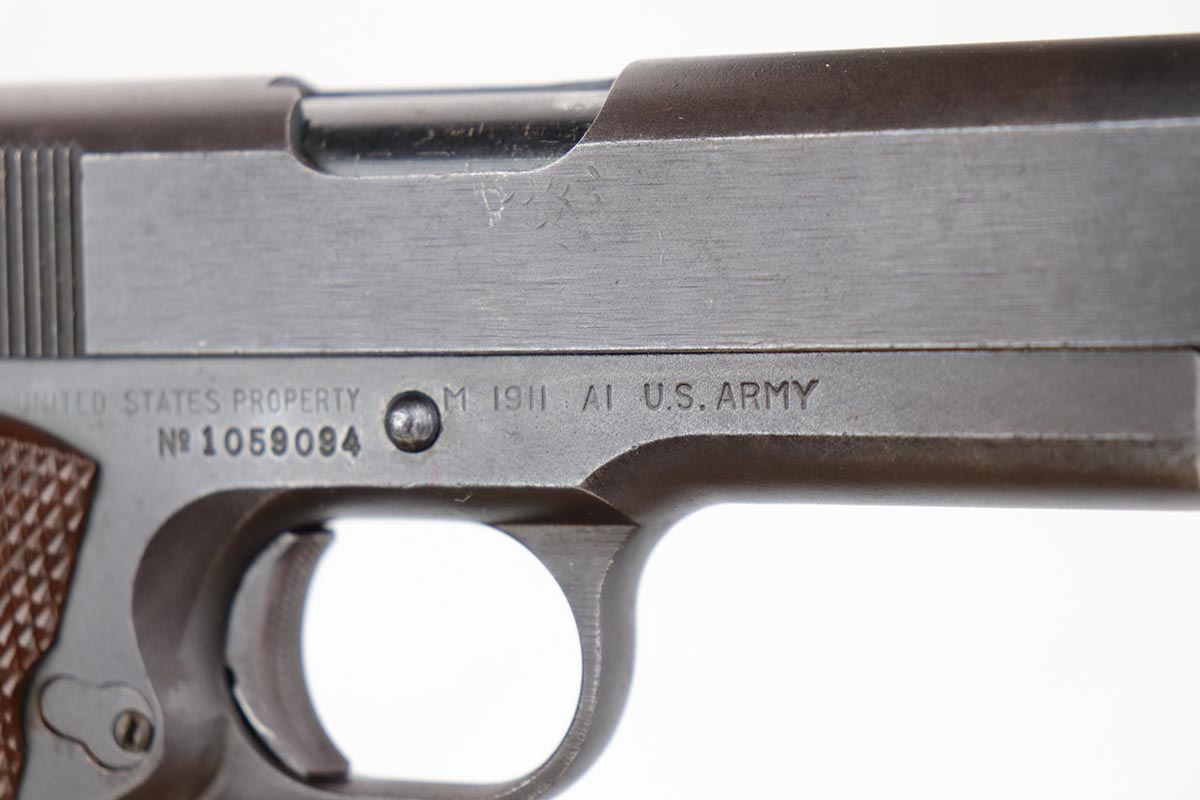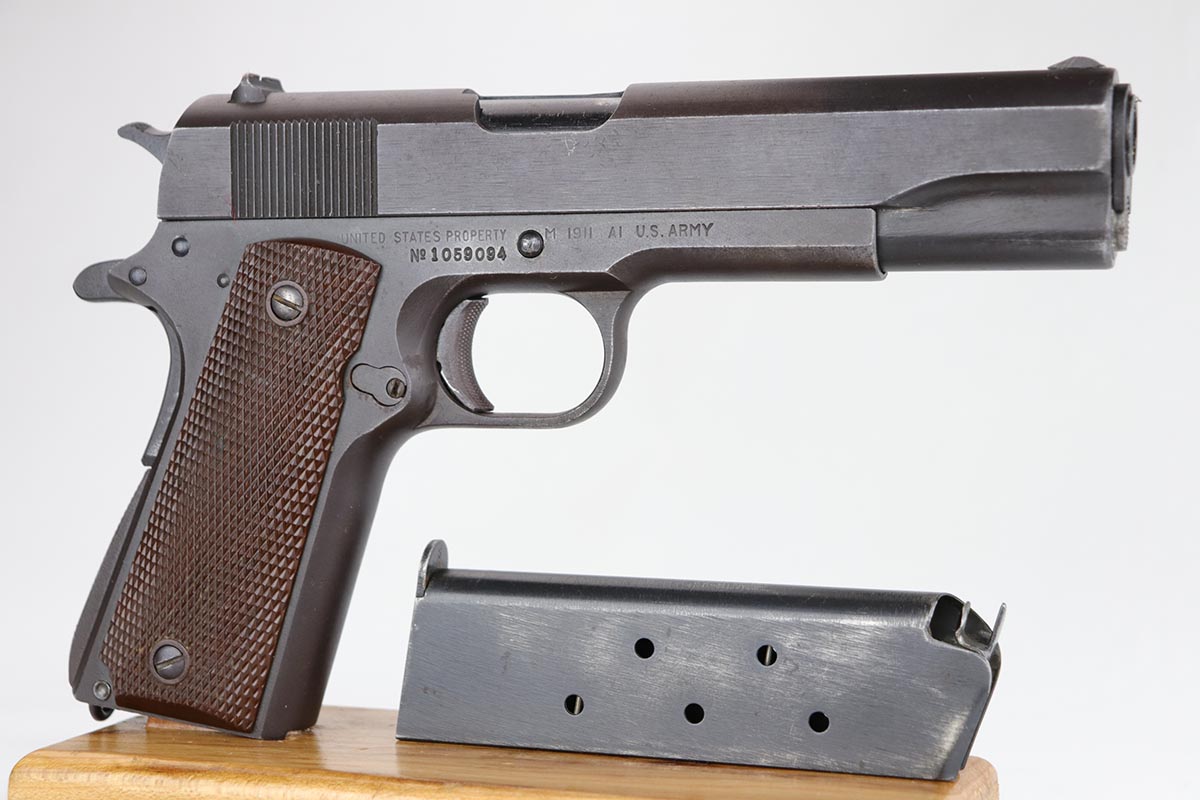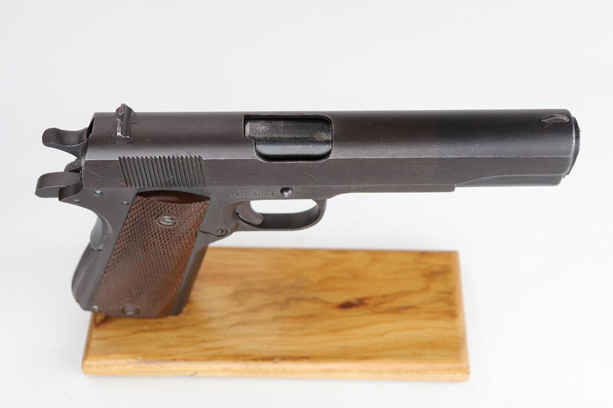The Union Switch & Signal company of Swissvale Pennsylvania, primarily made railroad signaling equipment but received a contract on May 5, 1942 for the manufacture of M1911A1 pistols. The first pistols were accepted by Ordnance inspectors in January 1943, but the company received word that their contract would be canceled. Within a month U.S.&S. had signed a contract to supply carbine parts. On March 8, 1943 the company was officially notified that their contract had been cut back from 200,000 pistols to 30,000 pistols. However on June 26th, when the contract was nearly complete, and many of the workers had been transferred to Carbine operations, the company received a letter of intent to purchase an additional 25,000 pistols. The last of the pistols was shipped on November 27, 1943. 55,000 Union Switch and Signal pistols were delivered serial numbered from 1041405 to 1096404. U.S.&S. pistols are the second rarest of the M1911A1s (55,000 produced), only the Singer is rarer (500 produced). None of the Union Switch & Signal 1911A1s have the crossed cannons ordnance stamp. We are told these were issued to the Army Air Corps during the war.