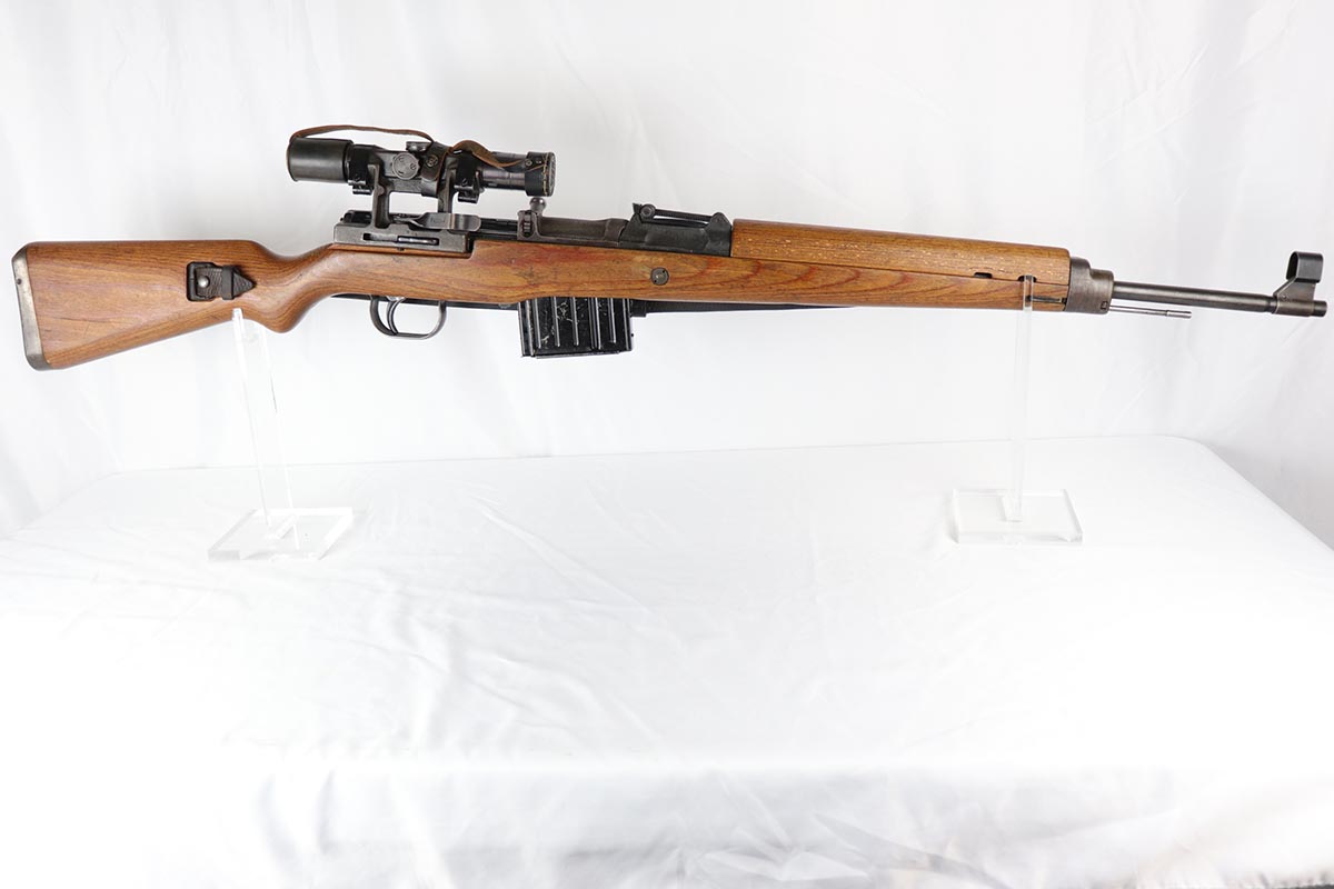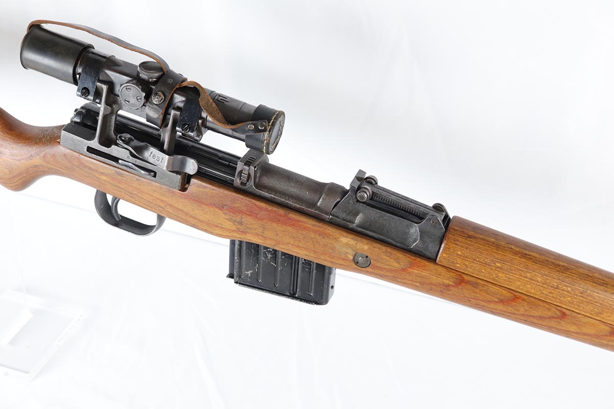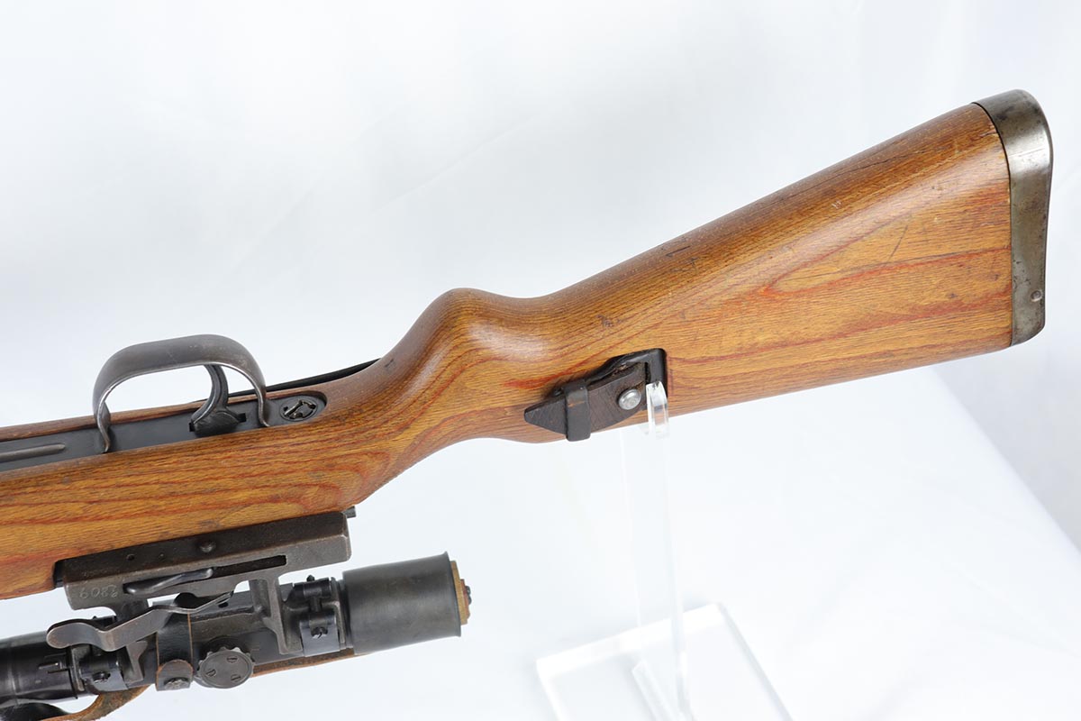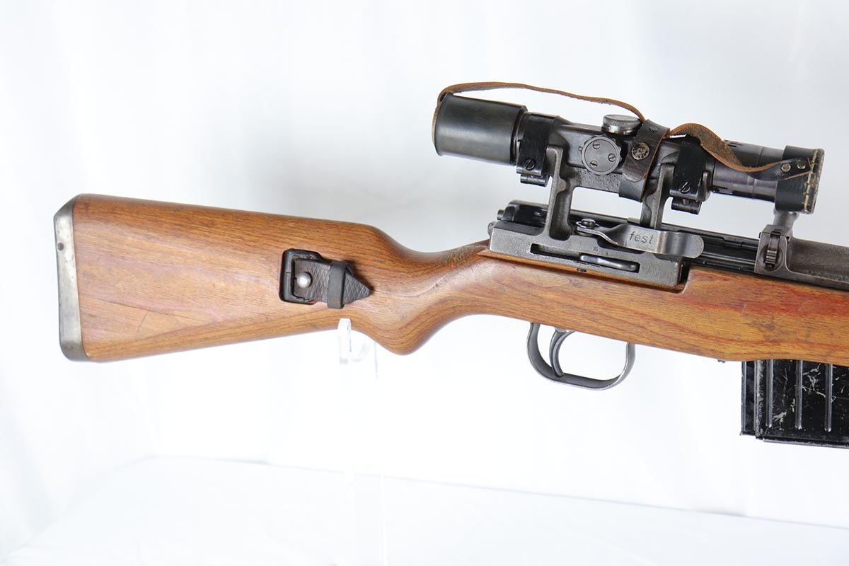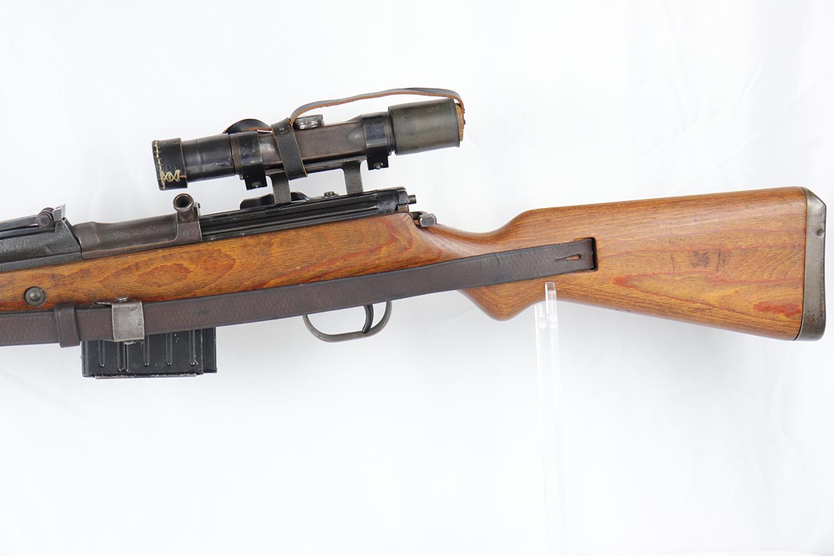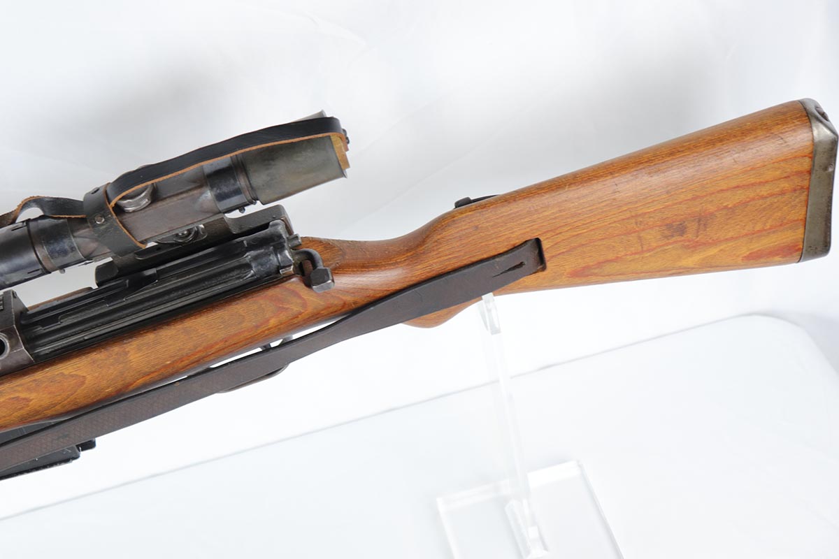 9/18/18 – This is a terrific Walther G43 sniper rifle, marked ac 44 on the receiver. All numbered parts are matching, including the stock. The rifle is all original and correct, with multiple proper waffen proofs on the stock, receiver and scope mount. Rifle has proper cleaning rod and site hood present. Original magazine is K43 marked with maker ‘aye’ and WaA843 markings on left side. The mount is original and has Walther WaA359 proofs. Scope is WW2 original, with excellent optics. Marked GW ZF 4, then ddx. Lens cap covers included. The stock is in fantastic original condition no major cracks or chips, and has never been sanded. The bore has strong rifling with only minor frosting. The butt stock includes the original manual and a couple small parts. This is one of the nicest Gewehr 43s we’ve ever come across!