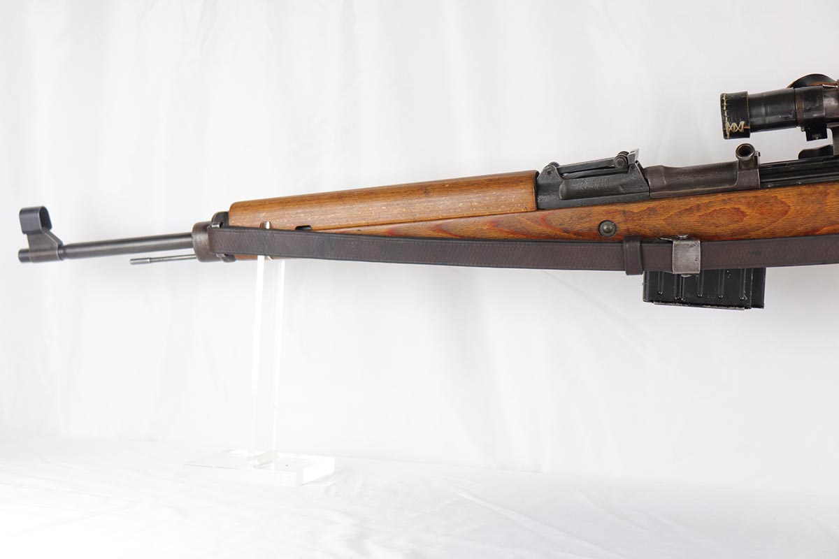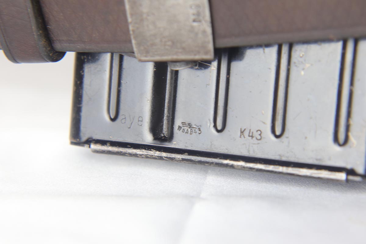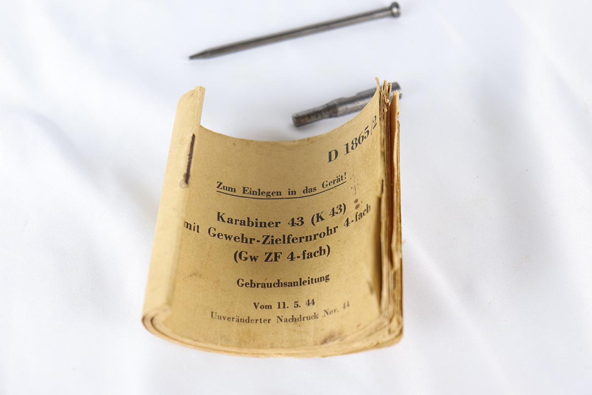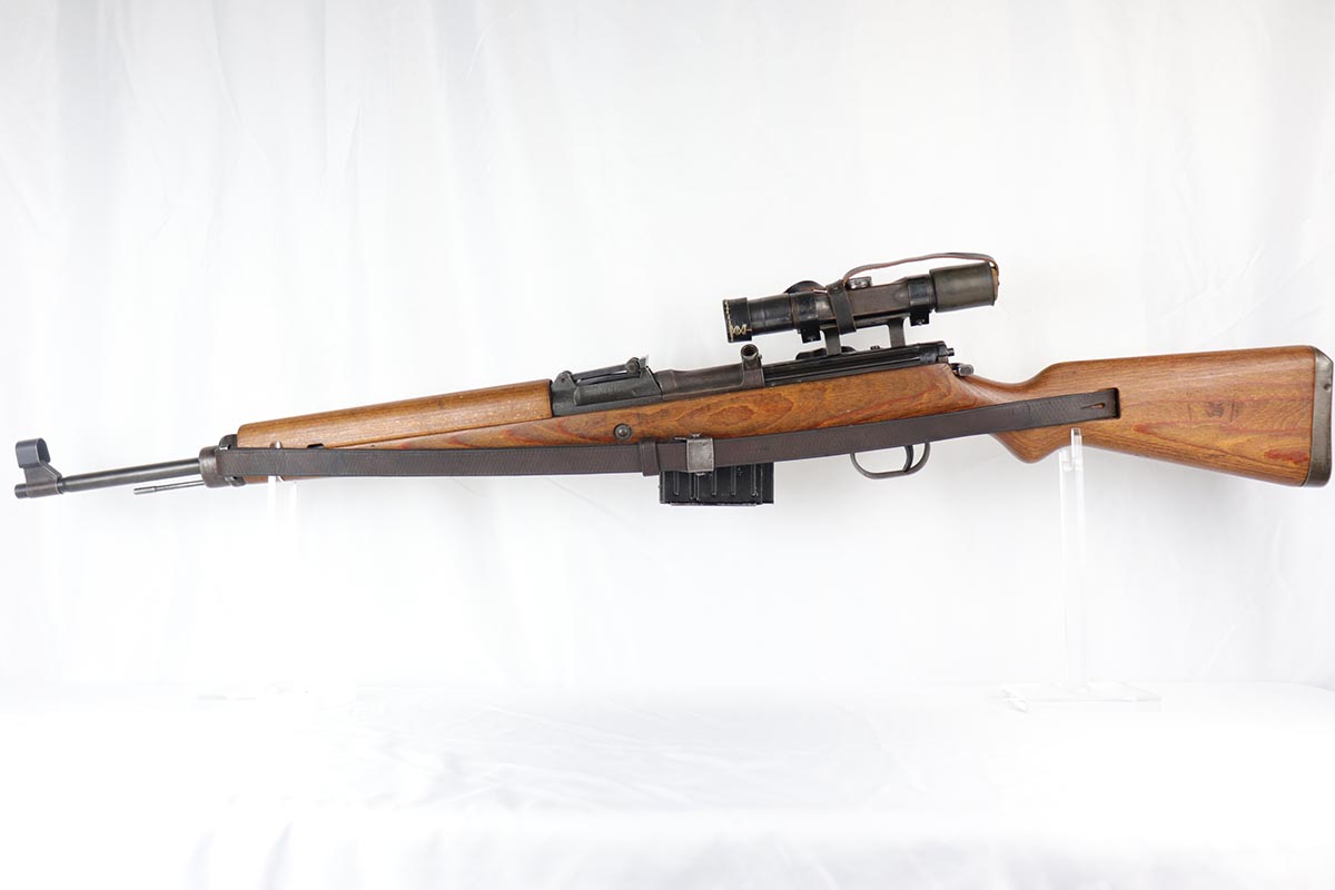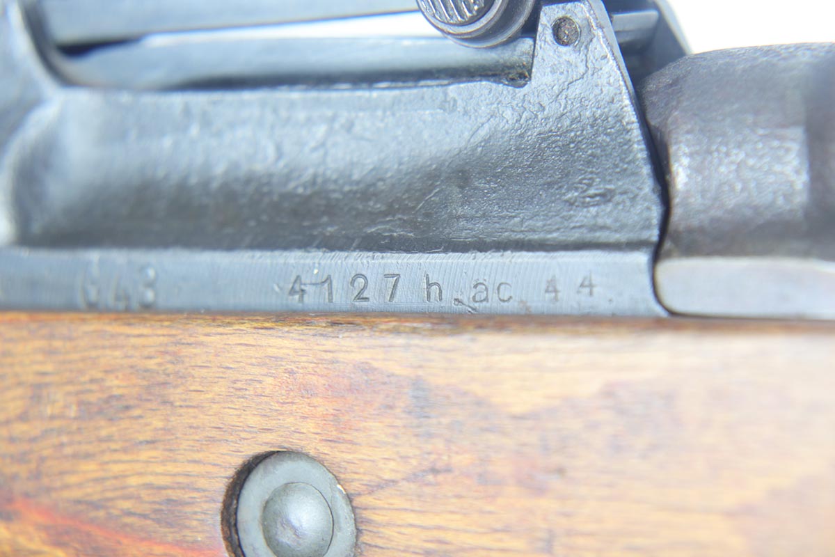 9/18/18 – This is a terrific Walther G43 sniper rifle, marked ac 44 on the receiver. All numbered parts are matching, including the stock. The rifle is all original and correct, with multiple proper waffen proofs on the stock, receiver and scope mount. Rifle has proper cleaning rod and site hood present. Original magazine is K43 marked with maker ‘aye’ and WaA843 markings on left side. The mount is original and has Walther WaA359 proofs. Scope is WW2 original, with excellent optics. Marked GW ZF 4, then ddx. Lens cap covers included. The stock is in fantastic original condition no major cracks or chips, and has never been sanded. The bore has strong rifling with only minor frosting. The butt stock includes the original manual and a couple small parts. This is one of the nicest Gewehr 43s we’ve ever come across!