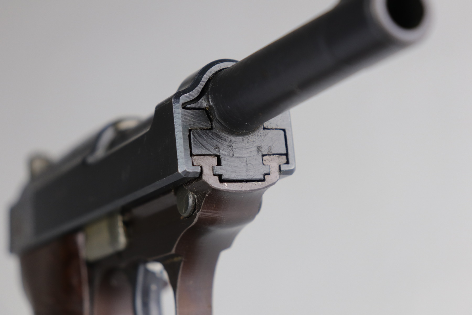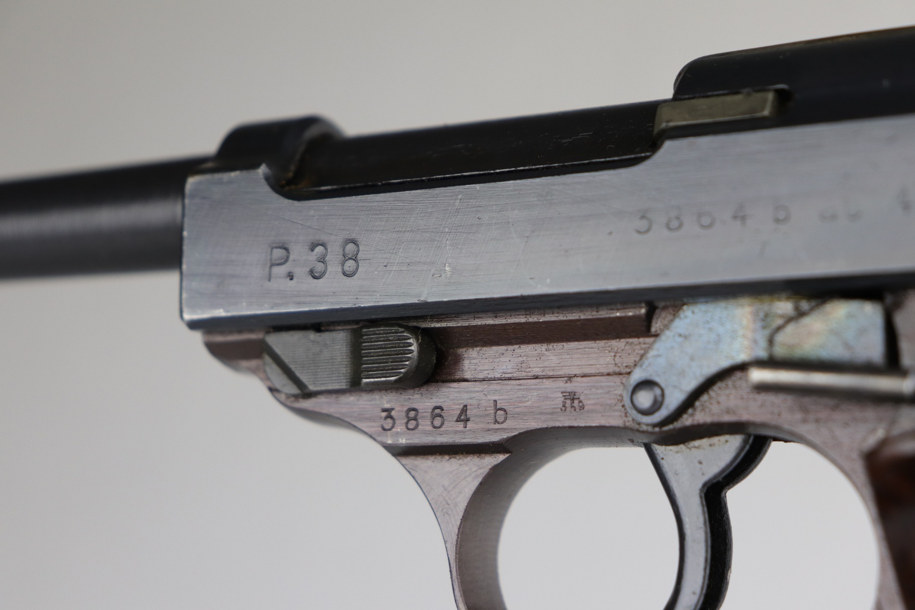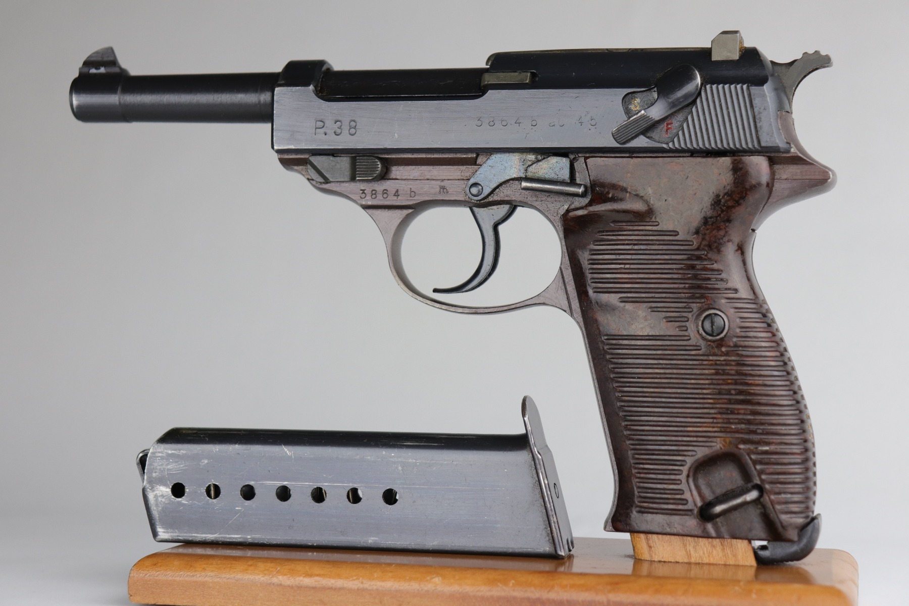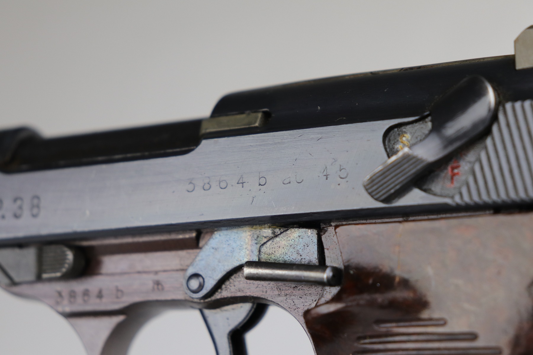 7/7/20 – This is a 1945-made Walther P.38 in minty condition. The slide is marked “AC 45” and has the proper “E/359” Nazi military acceptance proofs. All matching. It has a fnh barrel, as indicated by a Waffen 76 proof. This gun has almost all of its original finish. There are just a few very light surface scratches here and there, minor thinning on the front strap, and some discoloration on the firing pin cover. Excellent red Walther grips. Minty bore. Some of the small parts are phosphate (typical for this variation). Comes with a “U” marked Walther magazine. De-cocker functions properly.