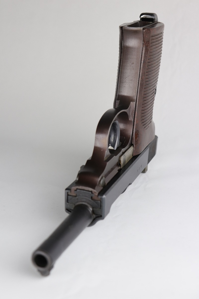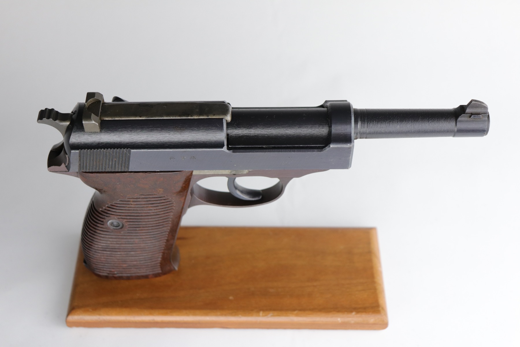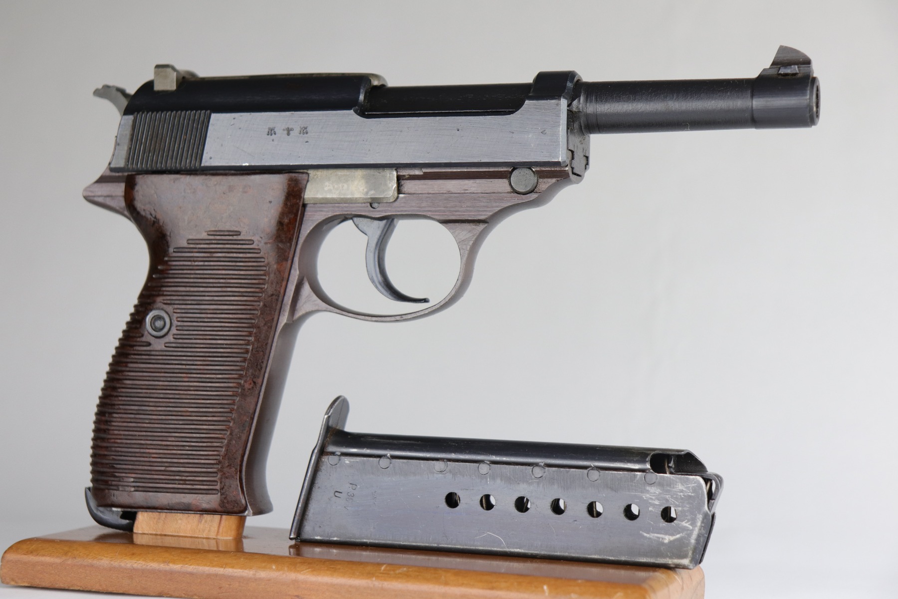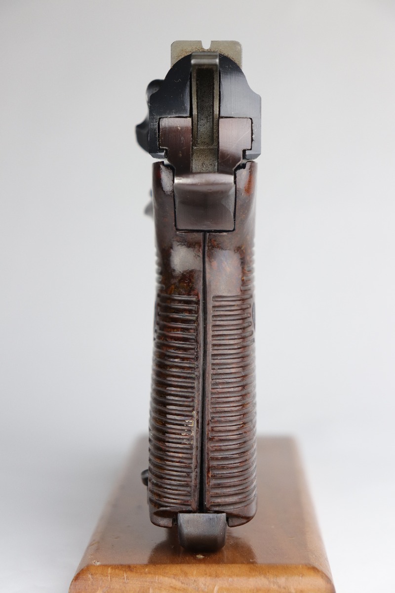 7/7/20 – This is a 1945-made Walther P.38 in minty condition. The slide is marked “AC 45” and has the proper “E/359” Nazi military acceptance proofs. All matching. It has a fnh barrel, as indicated by a Waffen 76 proof. This gun has almost all of its original finish. There are just a few very light surface scratches here and there, minor thinning on the front strap, and some discoloration on the firing pin cover. Excellent red Walther grips. Minty bore. Some of the small parts are phosphate (typical for this variation). Comes with a “U” marked Walther magazine. De-cocker functions properly.