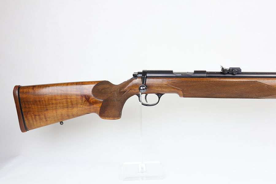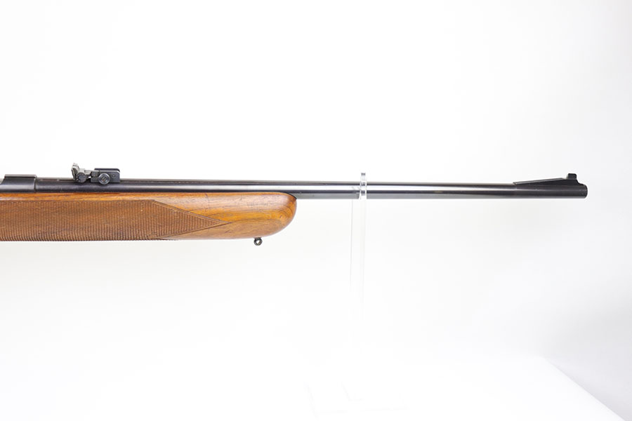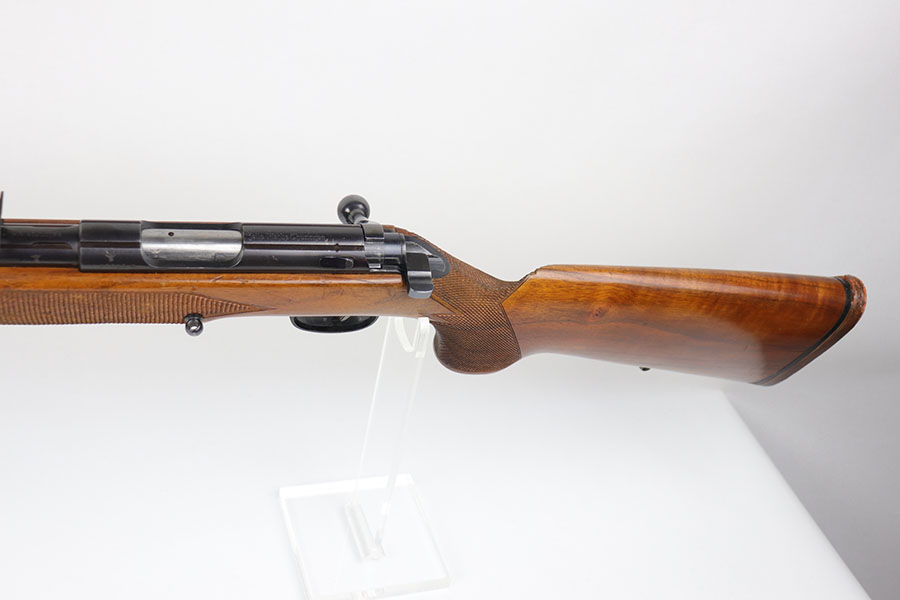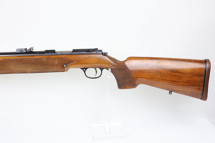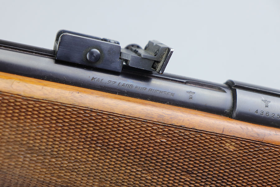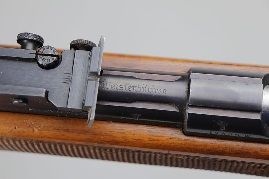 5/8/20 – This is a near-mint Walther Sportmodell Meisterbuchse target rifle that was made during the Nazi era, likely around 1940, as indicated by the Eagle/N proofs. It has hardly any finish loss, just a hint of muzzle wear and a thin mark from the sight being moved. Mint bore. Terrific checkered stock with just a few dings. The butt pad does show a bit of wear at the corners. All original.