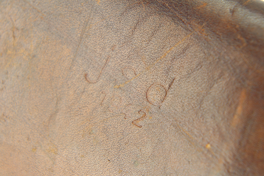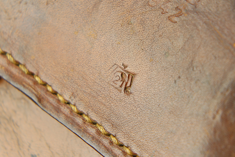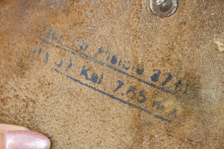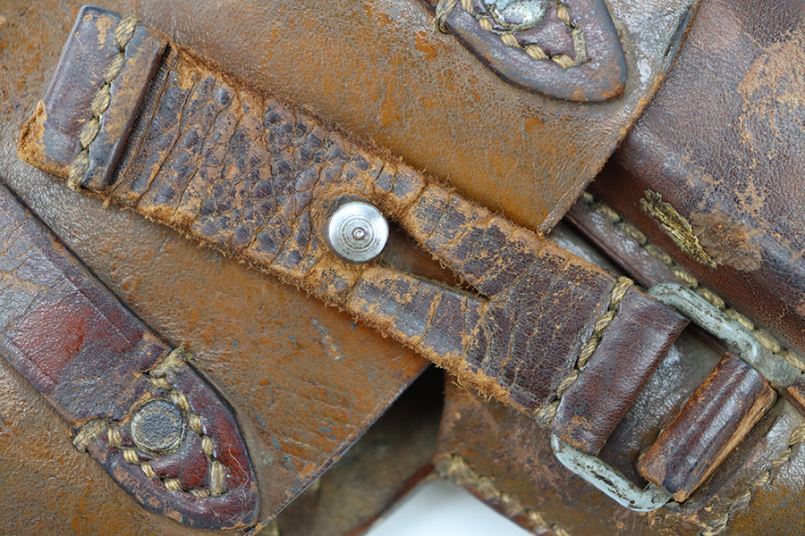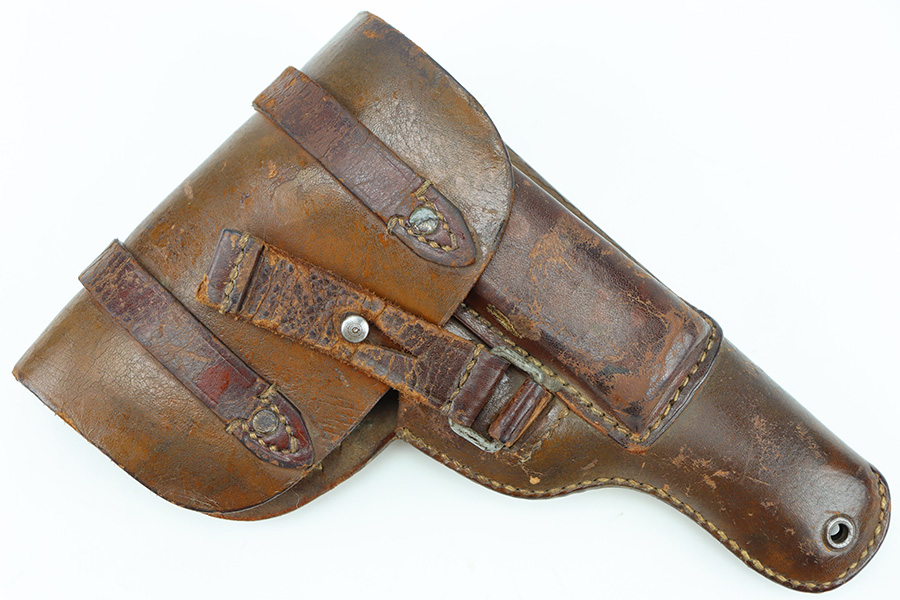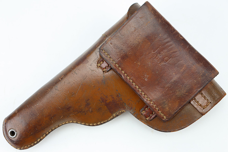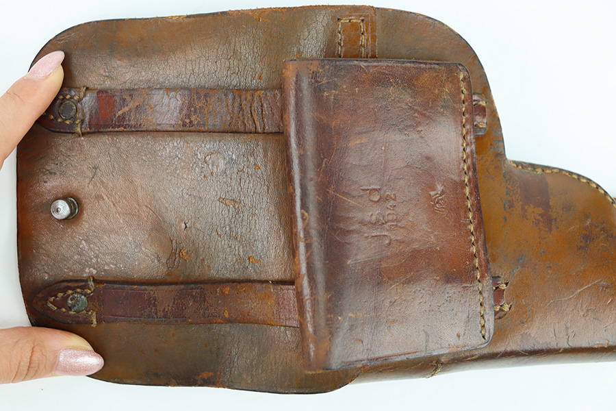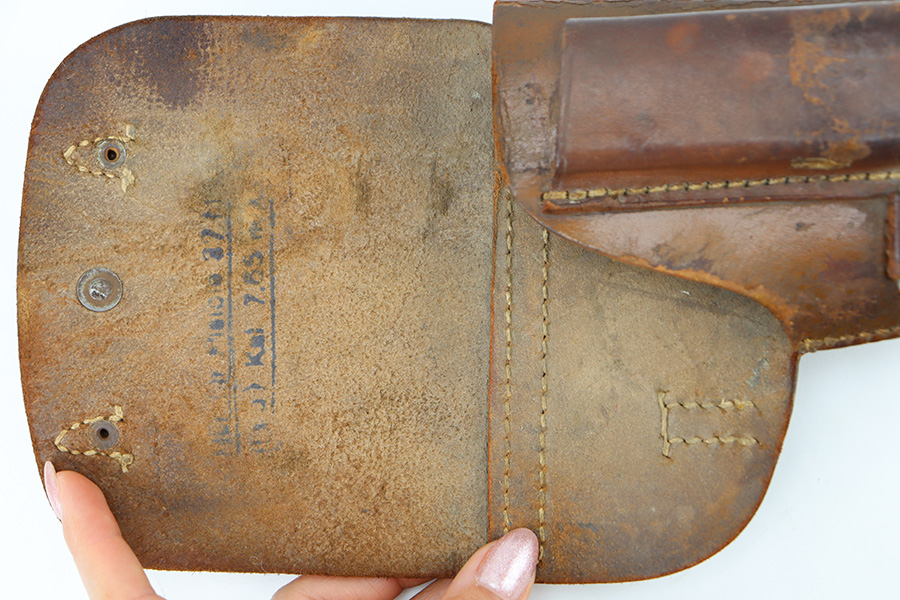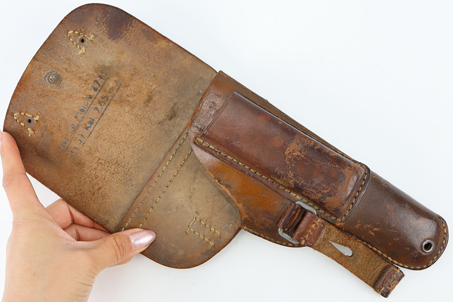 12/27/23 – This is an original 1942 dated Femaru M37 dropping style holster from WW2. The holster is in good overall condition with surface scuffing and wrinkling throughout the exterior leather. The back belt loop is maker and date stamped “jsd 1942” with a small Luftwaffe proof stamp underneath. The closure strap is wrinkled and scuffed but still intact. Normal pliability and use wear evident throughout. The interior leather is model designation ink stamped. Excellent, all original stitching throughout.