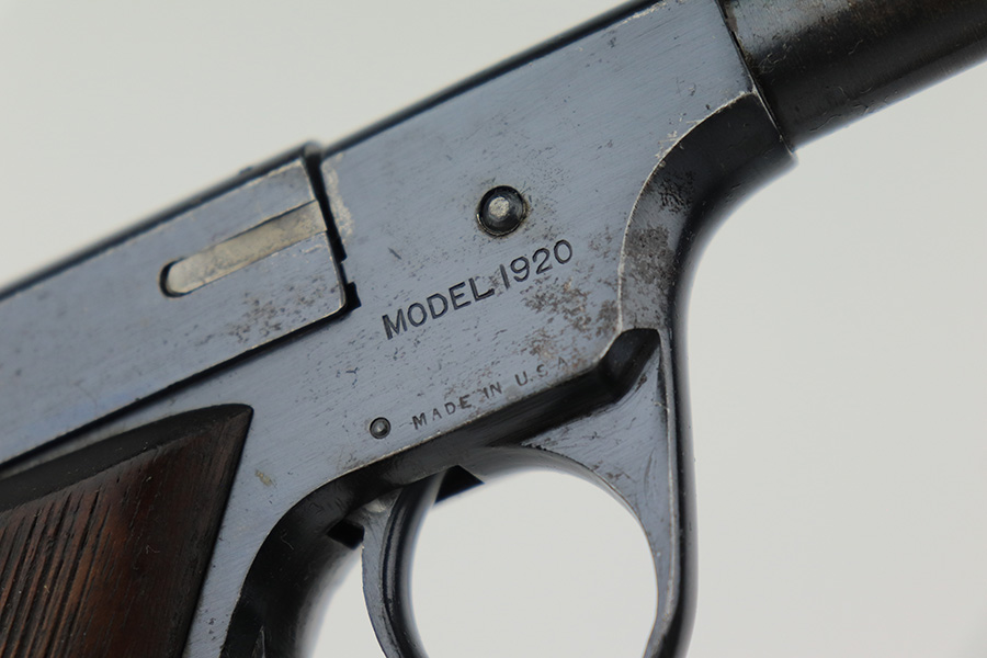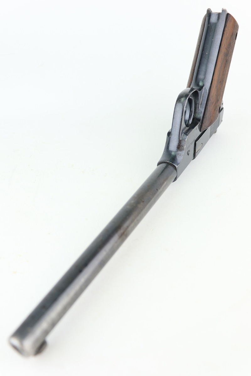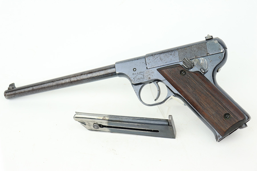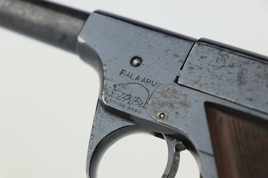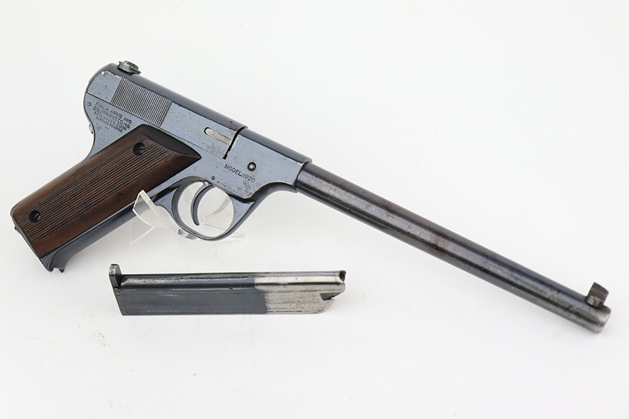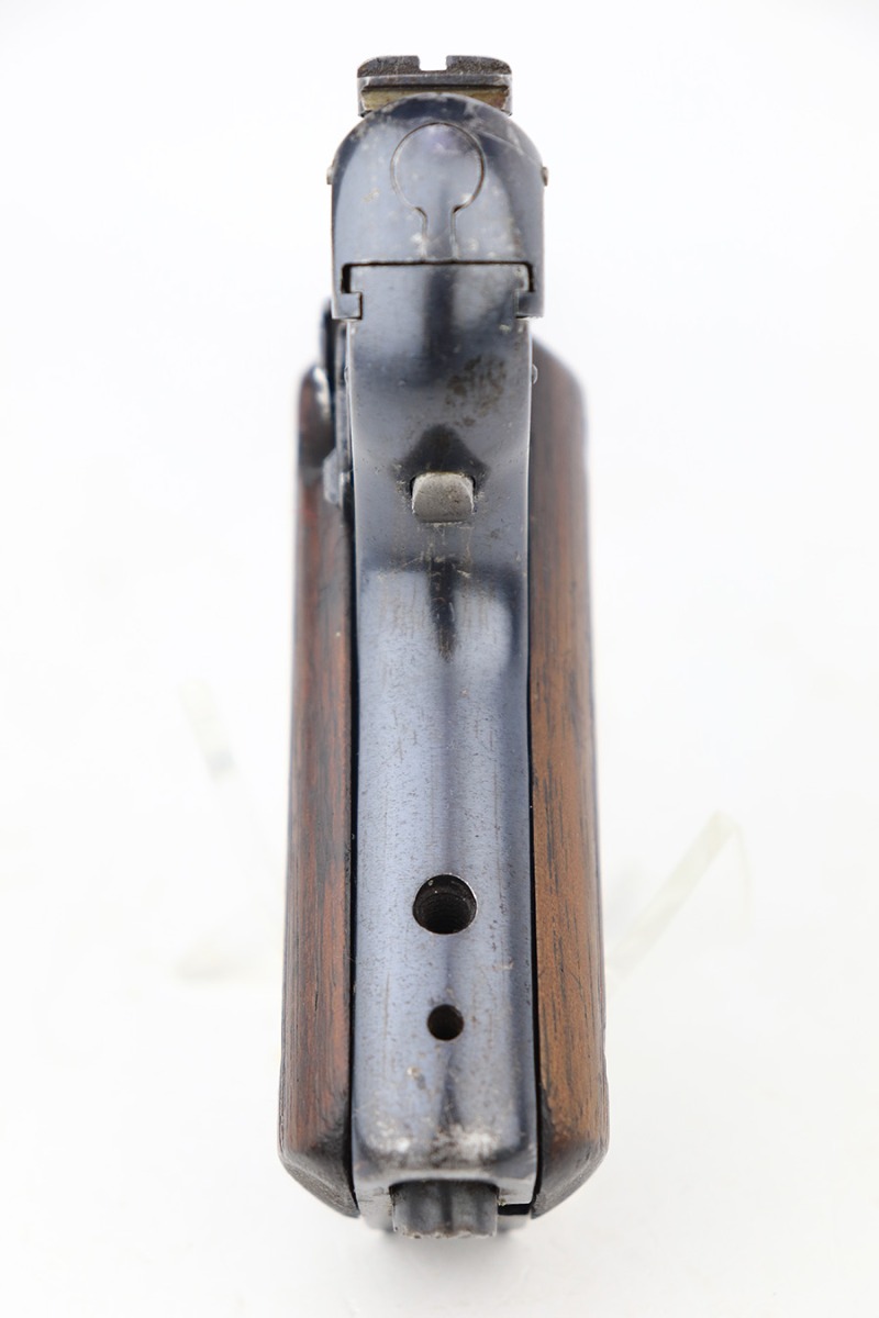 4/7/23 – This is a Fiala Arms Model 1920, a pistol with a fascinating history and design. We featured this gun in one of Youtube videos. Click the link below to watch! This one has retained roughly 85% of its original finish with minor thinning along the barrel. While there isn’t a ton of actual finish loss, there is noticeable spotty oxidation throughout. Very nice wood grips. Comes with one magazine. Mint bore.